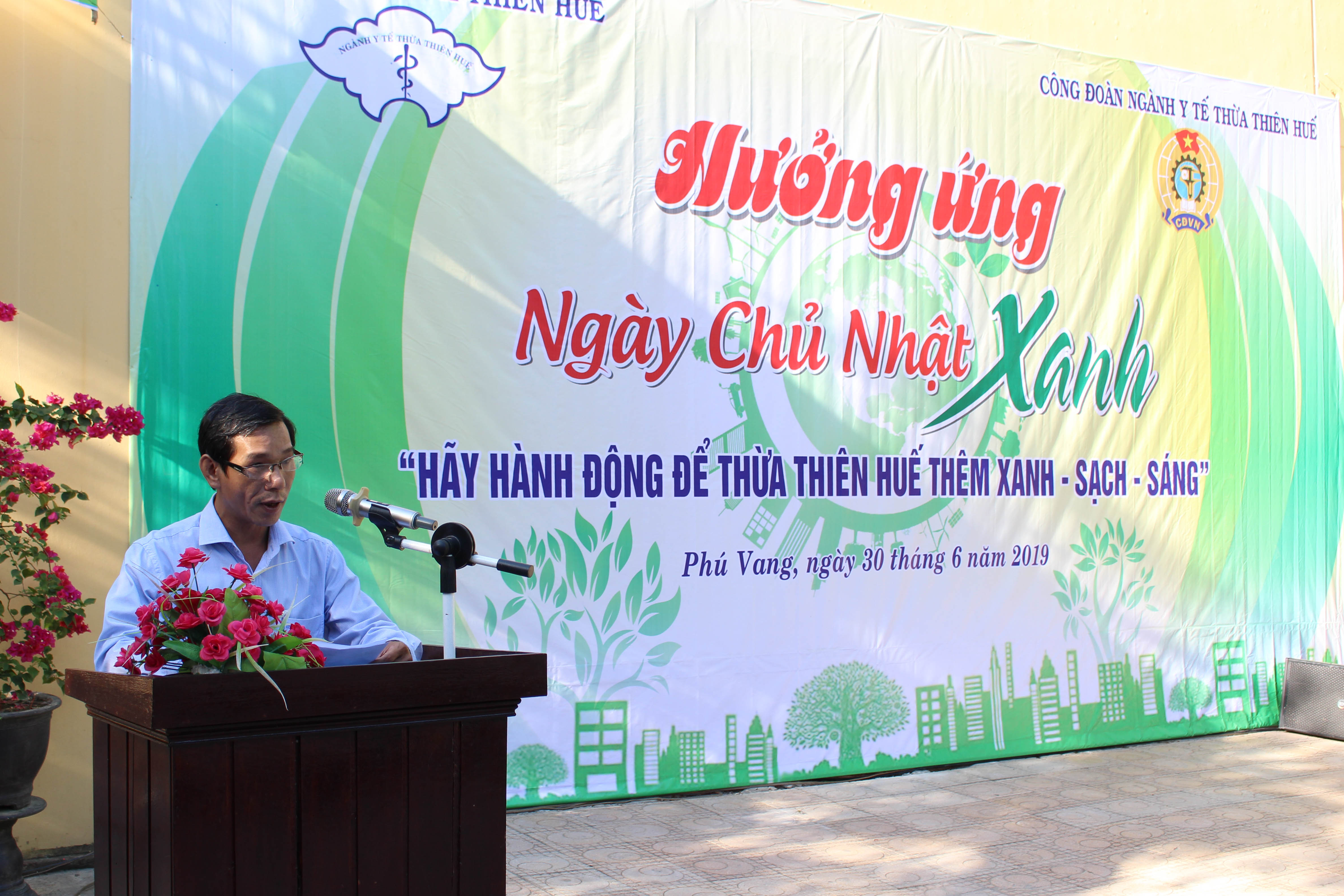 Ngày 30/6/2019,tại Trung tâm Y tế huyện Phú Vang, Công đoàn ngành Y tế phối hợp với Sở Y tế tỉnh Thừa Thiên Huế tổ chức Lễ Hưởng ứng “Ngày Chủ nhật xanh” năm 2019. Tham dự buổi lễ có TS.BS Nguyễn Nam Hùng – TUV, Giám đốc Sở Y tế, đồng chí Trần Quang Vinh – Phó Chủ tịch Liên đoàn Lao động tỉnh Thừa Thiên Huế, đồng chí Lê Viết Bắc – Phó Giám đốc Sở Y tế, Chủ tịch Công đoàn ngành y tế. Về phía huyện có đồng chí Lê Thanh Hải – TUV, Bí thư huyện ủy huyện Phú Vang, đại diện lãnh đạo huyện ủy, UBND huyện cùng ban Thường vụ Đảng ủy - Ban Giám đốc Sở Y tế, Ban chấp hành Công đoàn ngành Y tế, đại diện lãnh đạo các đơn vị trực thuộc Sở Y tế, đại diện lãnh đạo các Trung tâm Y tế huyện/thị xã/thành phố và đông đảo lực lượng Đoàn viên công đoàn các đơn vị trực thuộc.
