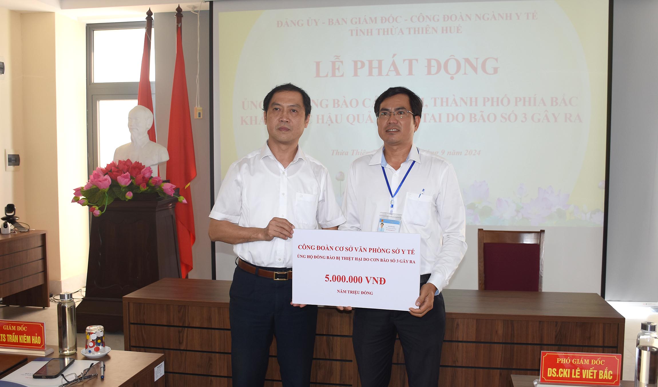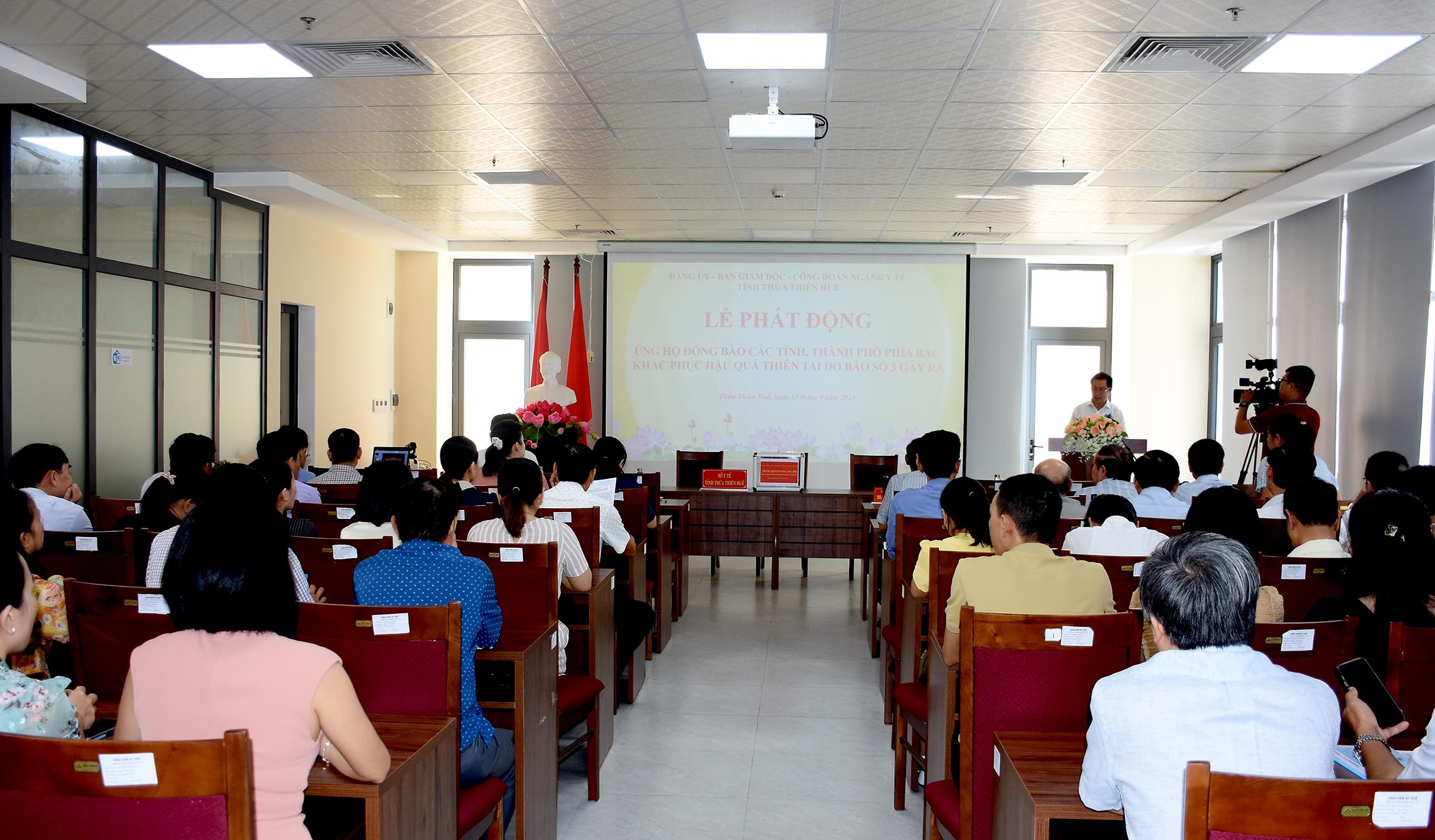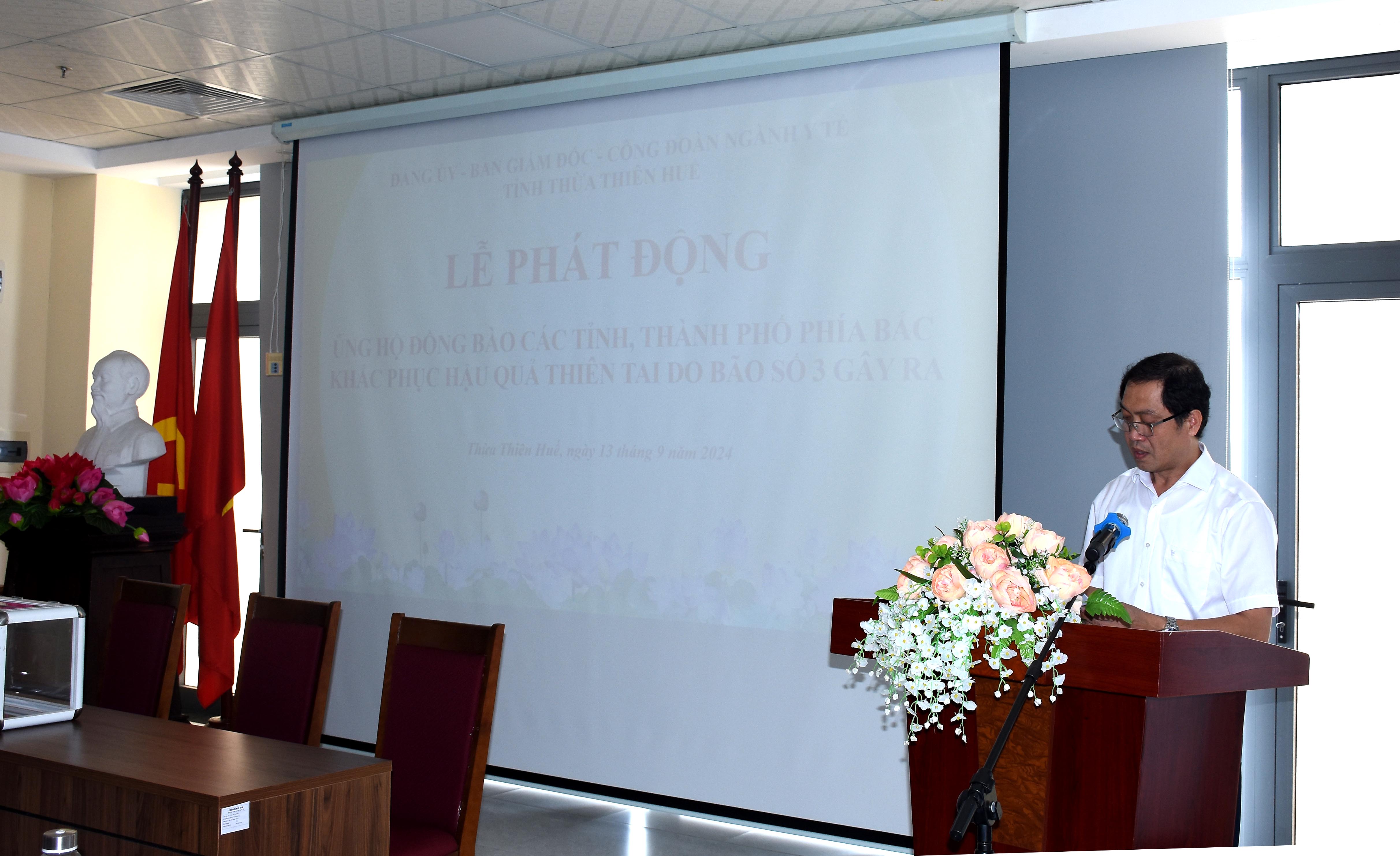 Phát biểu tại Lễ phát động quyên góp, ủng hộ PGS.TS Trần Kiêm Hảo - Bí Thư Đảng ủy, Giám đốc Sở Y tế kêu gọi: “Hôm nay, chúng ta có mặt ở đây với một sứ mệnh hết sức quan trọng và đầy nhân văn, đó là cùng nhau phát động chương trình quyên góp, ủng hộ đồng bào các tỉnh phía Bắc, nơi đang phải gồng mình đối mặt với những tổn thất nặng nề do bão số 3 gây ra…. Phát huy truyền thống đoàn kết và tinh thần “tương thân, tương ái" của dân tộc, nhằm kịp thời chia sẻ những khó khăn, mất mát của bà con nhân dân các tỉnh phía Bắc do ảnh hưởng của bão và hoàn lưu cơn bão số 3 đã gây ra. Đảng ủy - Ban Giám đốc - Công đoàn ngành Y tế kêu gọi mỗi đảng viên, công chức, viên chức và người lao động trong ngành Y tế tỉnh Thừa Thiên Huế ủng hộ ít nhất 1 ngày lương. Không chỉ bằng những hành động thiết thực mà còn là tình cảm, tấm lòng cùng chung tay, chia sẻ, ủng hộ vật chất và tinh thần giúp đỡ Nhân dân các tỉnh phía Bắc sớm khắc phục hậu quả thiệt hại do thiên tai, nhanh chóng ổn định đời sống và sản xuất… Chúng ta hãy cùng chung tay đóng góp sức lực, tình cảm của mình trên tinh thần đoàn kết, tình thương yêu đồng bào của chúng ta sẽ là nguồn động viên vô cùng to lớn để giúp đồng bào các tỉnh bị ảnh hưởng vượt qua khó khăn, sớm khắc phục hậu quả, ổn định và tái thiết cuộc sống…”
