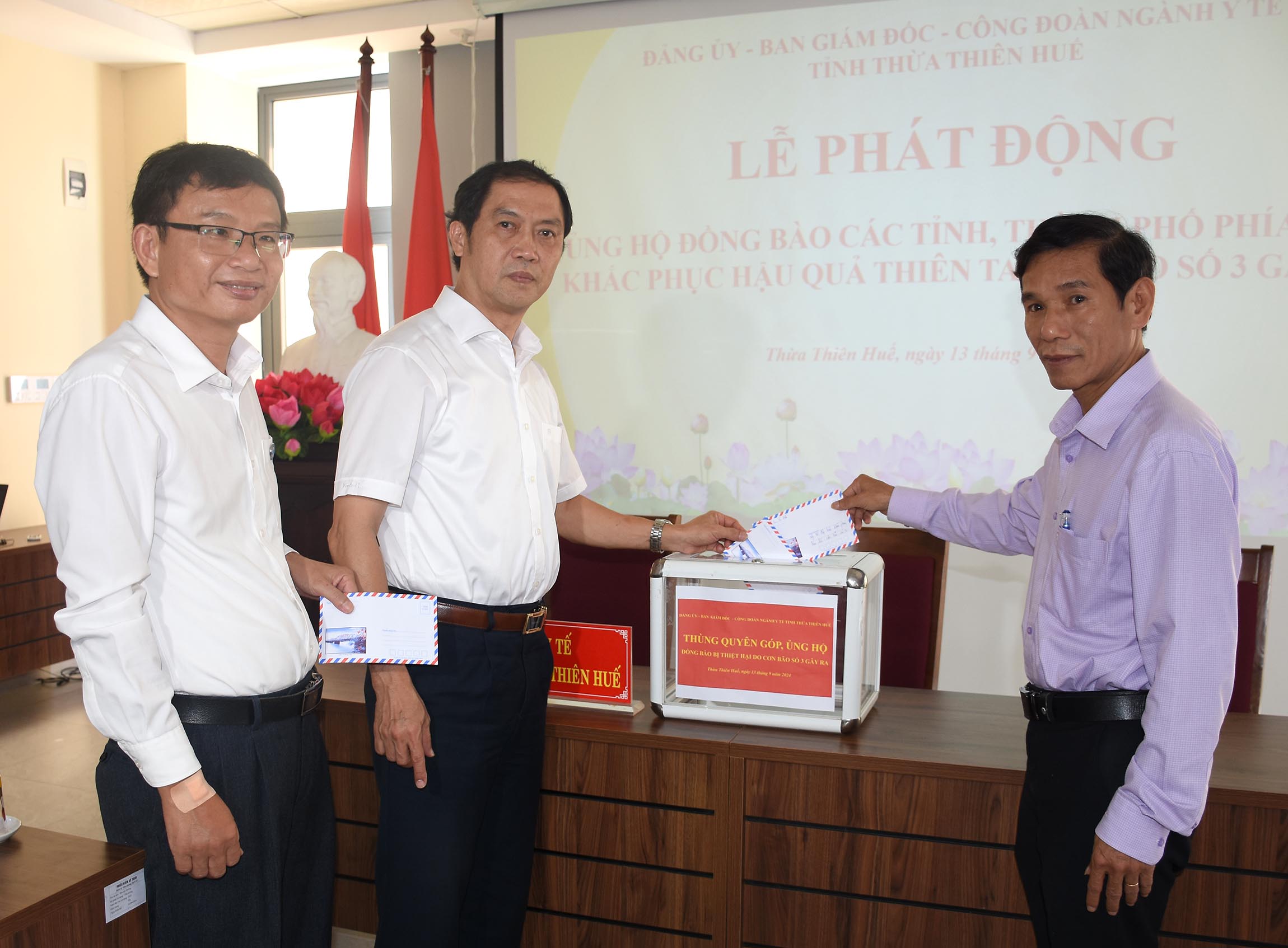 Hưởng ứng lời kêu gọi của Tỉnh ủy - HĐND - UBND - UBMTTQ Việt Nam tỉnh Thừa Thiên Huế, sáng ngày 13/9, tại Văn phòng Sở Y tế, Đảng uỷ, Ban Giám đốc Sở Y tế và Công đoàn Ngành Y tế tổ chức Lễ phát động quyên góp, ủng hộ đồng bào các tỉnh/thành phía Bắc khắc phục hậu quả thiên tai do cơn bão số 3 gây ra. PGS.TS Trần Kiêm Hảo - Bí Thư Đảng ủy, Giám đốc Sở Y tế kêu gọi sự ủng hộ với truyền thống nhân văn, tốt đẹp của dân tộc Việt Nam trên tinh thần“tương thân, tương ái", “lá lành đùm lá rách”.