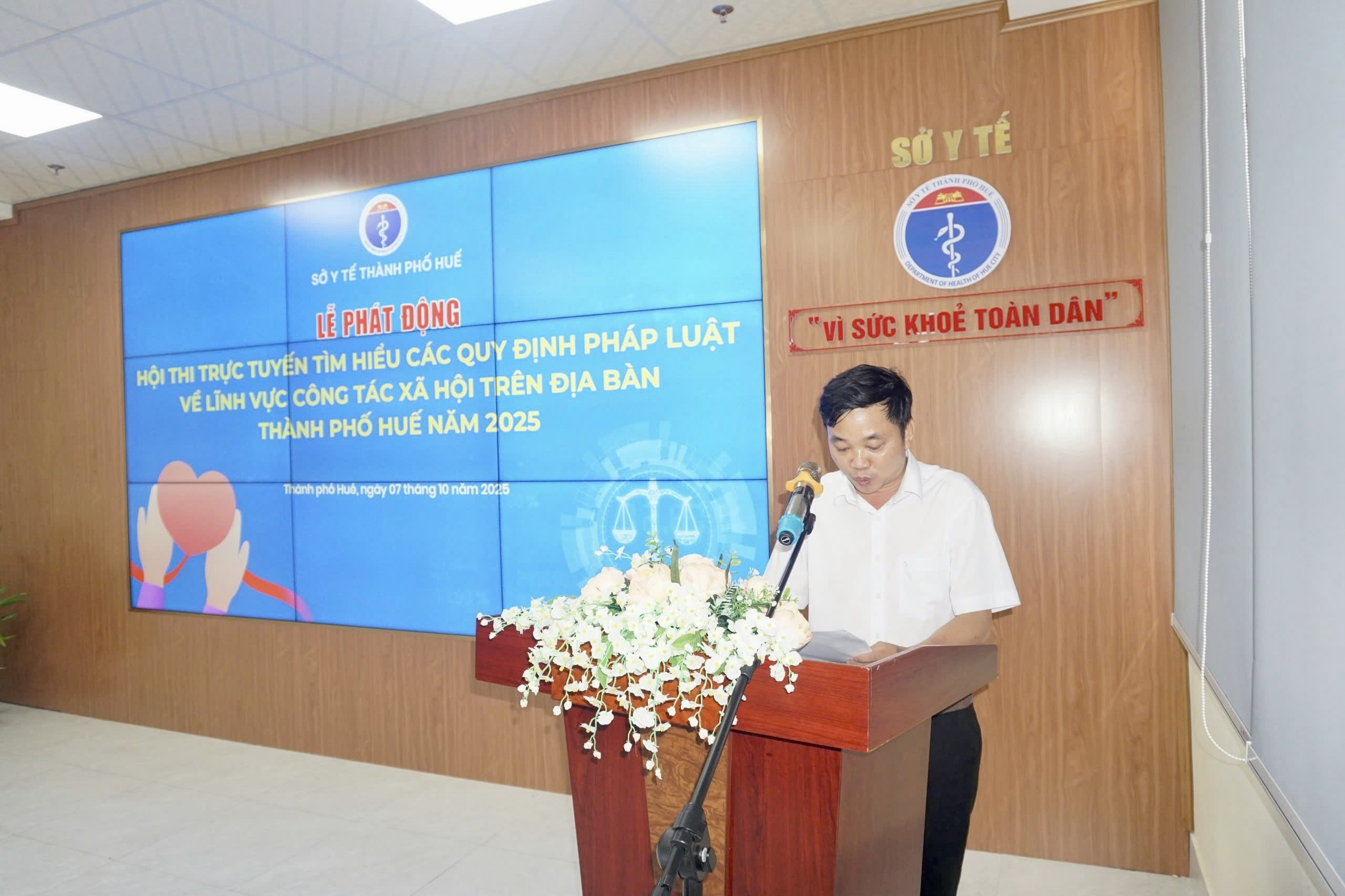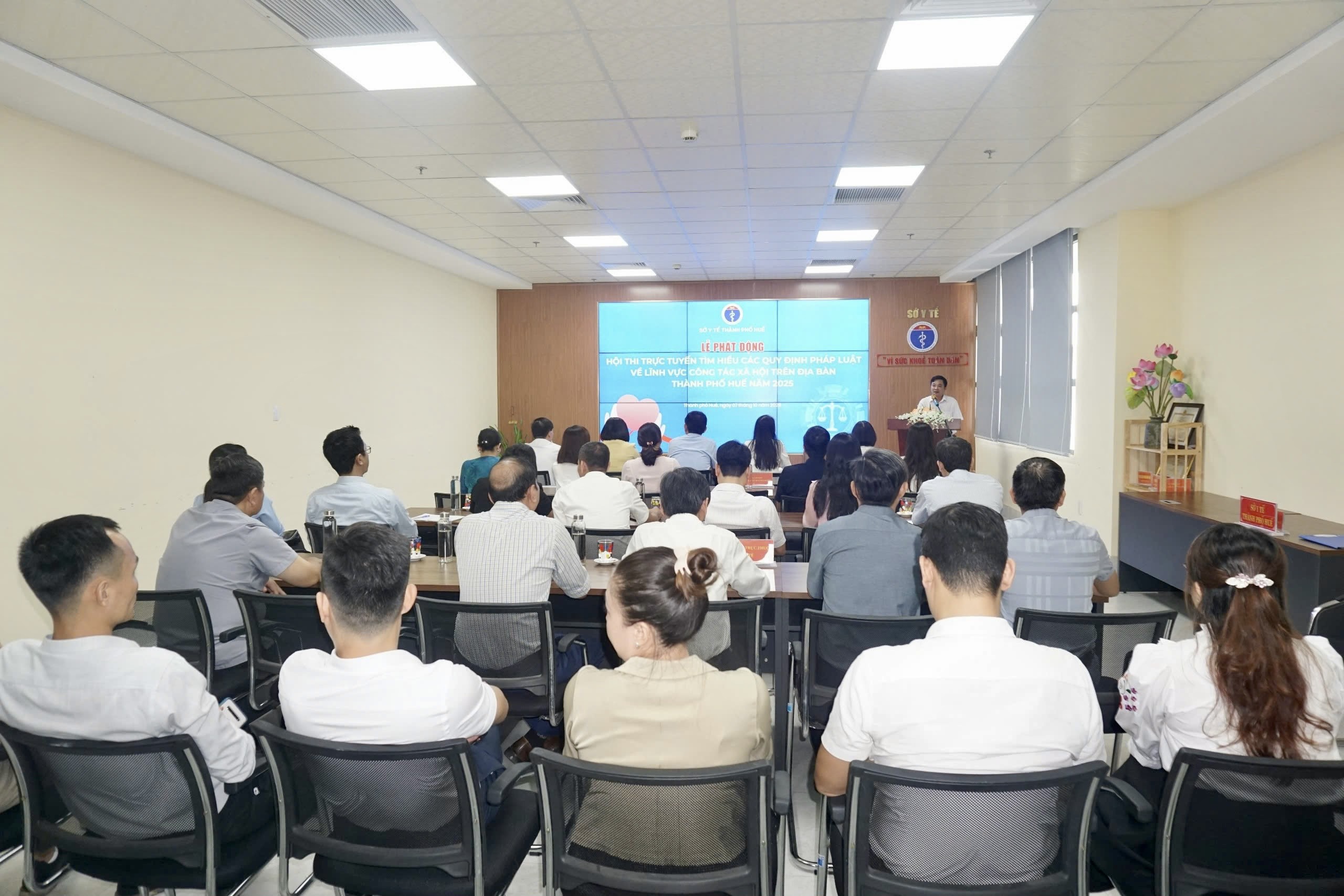 Thực hiện Kế hoạch số 4194/KH-SYT ngày 11/9/2025 của Sở Y tế về Tổ chức Hội thi trực tuyến tìm hiểu các quy định pháp luật về lĩnh vực công tác xã hội trên địa bàn thành phố Huế năm 2025. Chiều ngày 07/10/2025, Sở Y tế tổ chức Lễ khai mạc, phát động Hội thi trực tuyến tìm hiểu chính sách pháp luật về lĩnh vực công tác xã hội trên địa bàn thành phố Huế. Tham dự khai mạc có ThS.BSCKII Hoàng Trọng Quý – Phó Giám đốc Sở Y tế cùng ThS Phan Minh Nguyệt - Phó Giám đốc Sở Y tế. Sự góp mặt của Trưởng và Phó trưởng phòng chức năng của Sở cùng toàn thể công chức, viên chức, người lao động Văn phòng Sở Y tế; Các Giám đốc/Thủ trưởng của các đơn vị trực thuộc; Thành viên Ban Tổ chức tham gia Hội thi trực tuyến tìm hiểu chính sách pháp luật về lĩnh vực công tác xã hội trên địa bàn thành phố Huế.