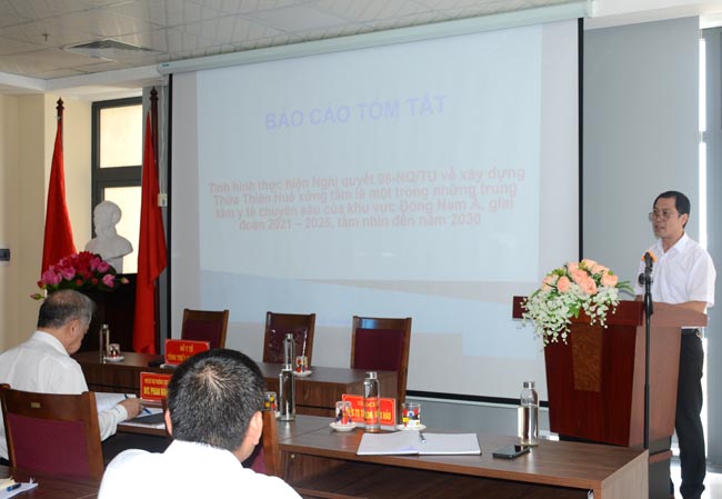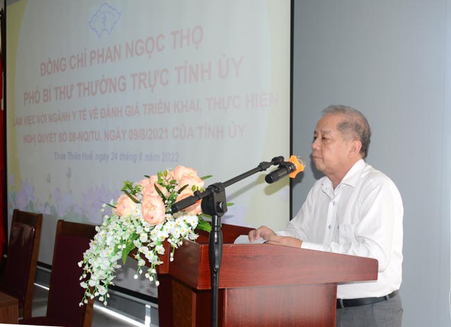 Sau khi nghe báo cáo của lãnh đạo sở Y tế và các đơn vị, đồng chí Phan Ngọc Thọ - Phó Bí thư Thường trực Tỉnh ủy đánh giá cao những nỗ lực và biểu dương các cán bộ y tế tỉnh nhà đã vượt qua mọi khó khăn, gian khổ, hy sinh hết mình, chung sức, chung lòng đoàn kết cùng nhau chống chọi, khống chế và đẩy lùi được cơn đại dịch Covid-19 và chiến dịch tiêm phòng vắc xin Covid-19. Đồng thời nhấn mạnh: Lãnh đạo ngành Y tế sớm đưa Nghị quyết vào cuộc sống, sớm hoàn thiện các đề án theo các mục tiêu của Nghị quyết số 54-NQ/TW của Bộ Chính trị “về xây dựng và phát triển tỉnh Thừa Thiên Huế đến năm 2030, tầm nhìn đến năm 2045” và Nghị quyết 08-NQ/TU của Tỉnh ủy. “về xây dựng Thừa Thiên Huế xứng tầm là một trong những Trung tâm Y tế chuyên sâu của khu vực Đông Nam Á giai đoạn 2021 - 2025 và tầm nhìn đến năm 2030”, với mục tiêu tổng quát là: xây dựng, phát triển Thừa Thiên Huế trở thành trung tâm khoa học, công nghệ cao về y học, có cơ sở vật chất và trang thiết bị hiện đại, tiên tiến. Thúc đẩy y tế trở thành ngành kinh tế quan trọng của tỉnh nhà, xứng tầm là trung tâm y tế chuyên sâu của cả nước và khu vực Đông Nam Á. Đóng góp quá trình phát triển toàn diện con người, nâng cao chất lượng cuộc sống, đẩy nhanh tăng trưởng kinh tế và phát triển xã hội bền vững.