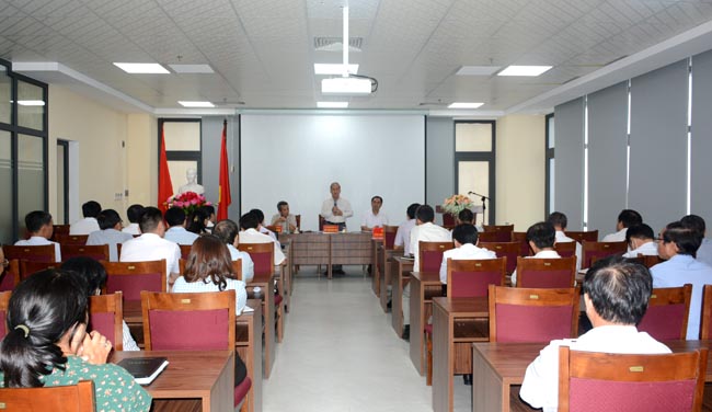 PGS.TS. Trần Kiêm Hảo - Bí thư Đảng ủy - Giám đốc Sở Y tế (ảnh trên) báo cáo việc triển khai Nghị quyết 08-NQ/TU tại hội nghị