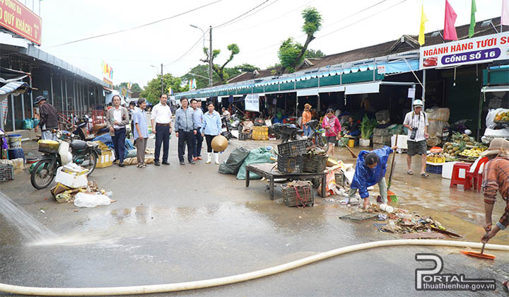 Kiểm tra công tác dọn dẹp vệ sinh môi trường tại chợ Đông Ba và khu vực dân cư tại đường Trần Hưng Đạo, Phó Chủ tịch Thường trực UBND tỉnh Nguyễn Thanh Bình lưu ý về một số dịch bệnh có thể xảy ra sau lũ lụt, ô nhiễm môi trường sau ngập lụt. Để sớm khắc phục, xử lý môi trường sau mưa lũ, ổn định cuộc sống, khôi phục hoạt động sản xuất kinh doanh, Phó Chủ tịch Thường trực UBND tỉnh Nguyễn Thanh Bình yêu cầu chính quyền, ban quản lý chợ Đông Ba cần rà soát, tăng cường chỉ đạo và thực hiện các biện pháp phòng, chống dịch bệnh, đảm bảo vệ sinh an toàn thực phẩm sau mưa lũ. Tổ chức các hoạt động dọn dẹp, vệ sinh môi trường sau lũ, đảm bảo nước rút đến đâu làm vệ sinh môi trường đến đó, bố trí đầy đủ nhân lực, thuốc, hóa chất, trang thiết bị cho công tác tiêu độc, khử trùng sau ngập lụt.