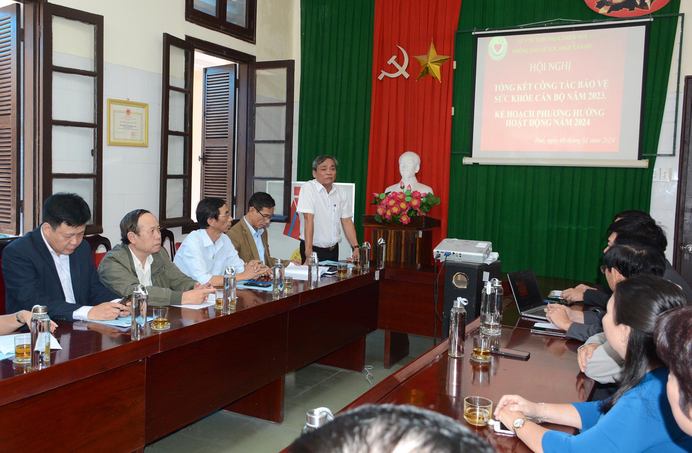 Chiều ngày 08/01, Phòng Bảo vệ sức khỏe Cán bộ (BVSKCB) tổ chức “Hội nghị Tổng kết công tác bảo vệ cán bộ năm 2023 và triển khai nhiệm vụ năm 2024”, đồng chí Dương Quang Bằng - Phó trưởng Ban Tổ chức tỉnh ủy, Phó trưởng Ban BVCSSKCB tỉnh và DSCKI Lê Viết Bắc-Phó Bí thư Đảng ủy, Phó Giám đốc Sở Y tế dự và chỉ đạo hội nghị. Đại diện lãnh đạo/chuyên viên các Phòng thuộc Sở Y tế, BHXH tỉnh, các đơn vị trực thuộc, các bệnh viện chuyên khoa tuyến tỉnh, Ban lãnh đạo, các đoàn thể và cán bộ viên chức Phòng BVSKCB cùng tham dự hội nghị.