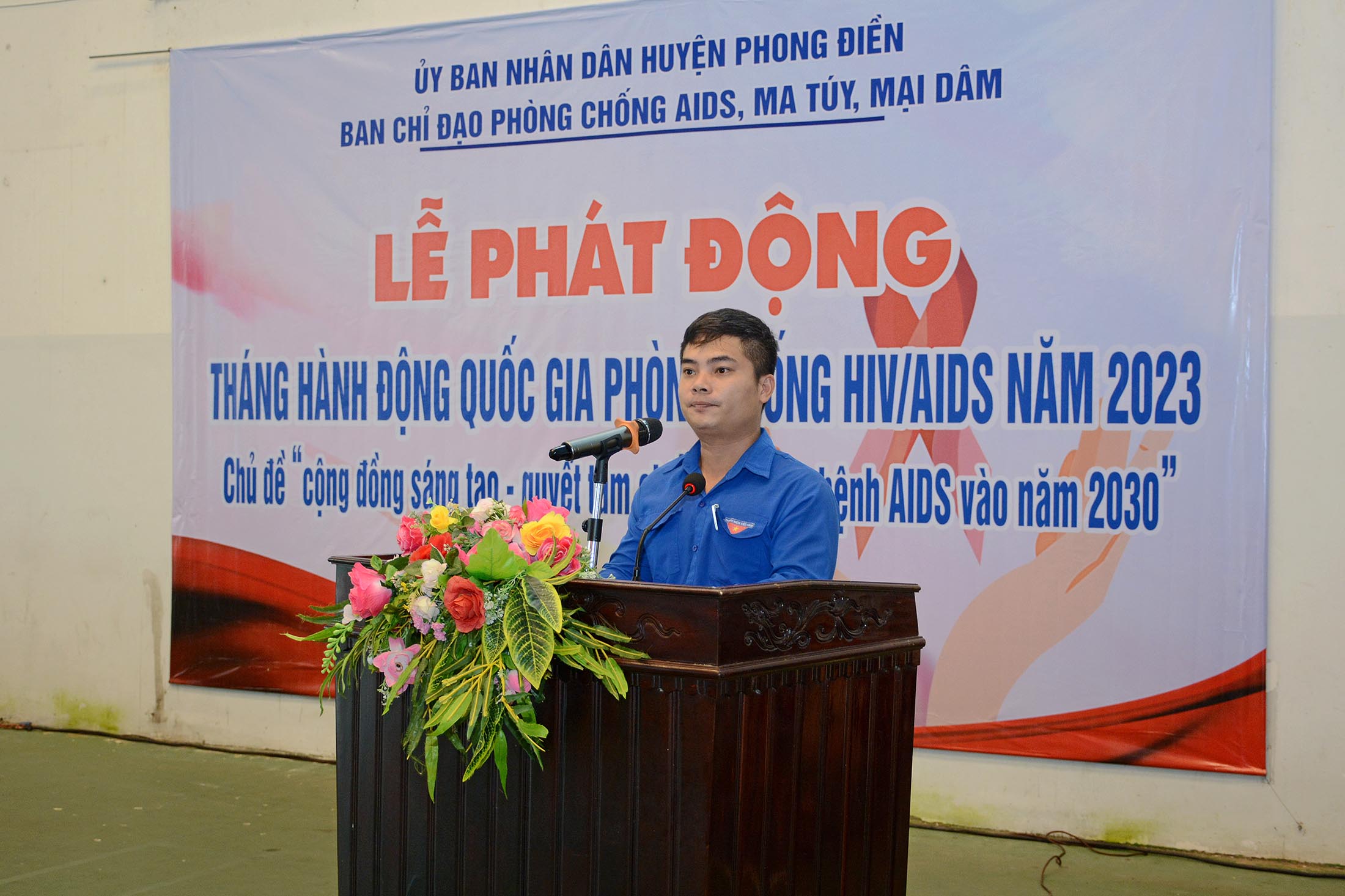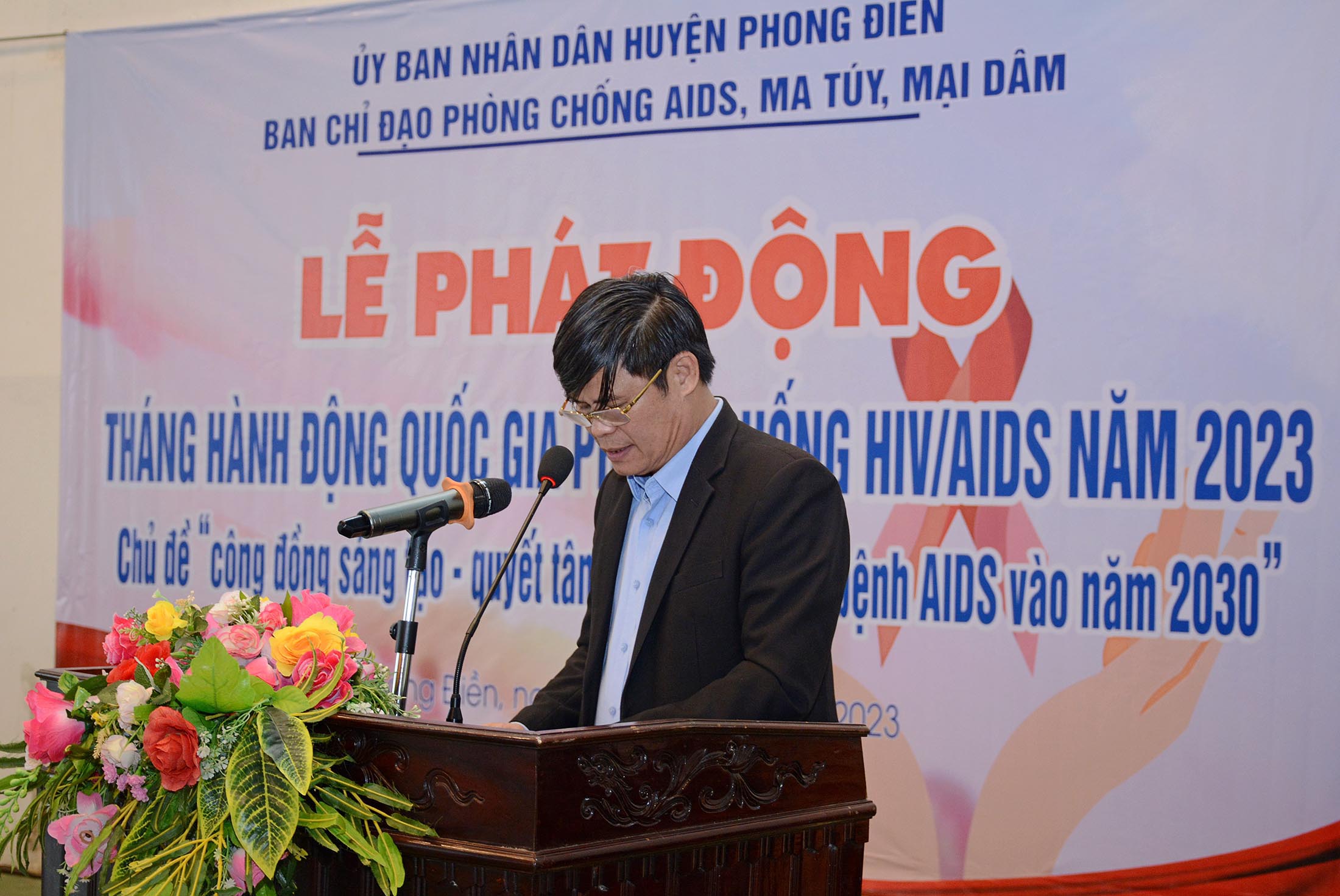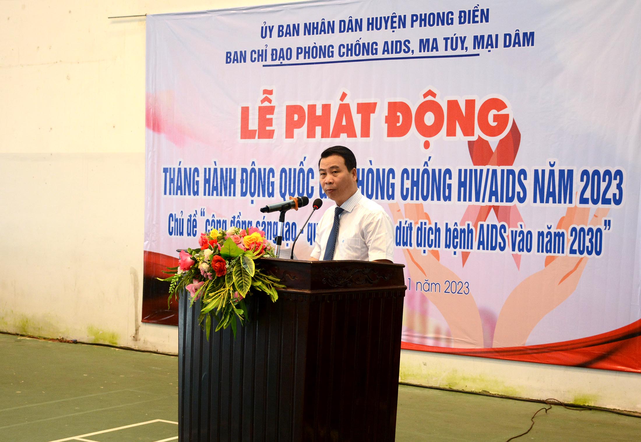 Đ/c Hoàng Văn Thái - Phó Chủ tịch - Trưởng Ban Chỉ đạo Phòng, chống AIDS, tệ nạn ma túy và mại dâm huyện Phong Điền phát biểu kêu gọi mọi tầng lớp nhân dân, các cộng đồng trong xã hội và tất cả các ban, ngành, đoàn thể, học sinh, sinh viên tham gia mạnh mẽ hơn nữa trong công cuộc Phòng chống HIV/AIDS, xác định Phòng chống HIV/AIDS là quyền và nghĩa vụ của chúng ta, vì sức khỏe và hạnh phúc của chính mình, vì sự phát triển kinh tế - xã hội và con người Việt Nam.