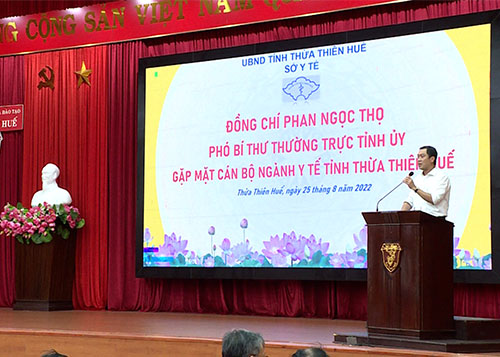 Chiều ngày 25/8, Phó Bí thư Thường trực Tỉnh ủy Phan Ngọc Thọ có buổi gặp mặt, nói chuyện, quán triệt Nghị quyết 54-NQ/TW, ngày 10/12/2019 của Bộ Chính trị về xây dựng và phát triển tỉnh Thừa Thiên Huế đến năm 2030, tầm nhìn đến năm 2045 và các nghị quyết chuyên đề của Tỉnh ủy (khóa XVI) với cán bộ, công chức, y bác sĩ, lãnh đạo ngành y tế toàn tỉnh.