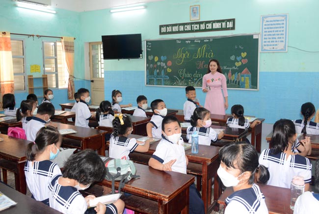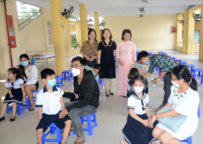Điểm tiêm chủng vắc xin phòng Covid-19 tại Trường Tiểu Học Lê Lợi Giáo viên chủ nhiêm lớp dặn dò và động viên các em học sinh trước khi tiêm phòng