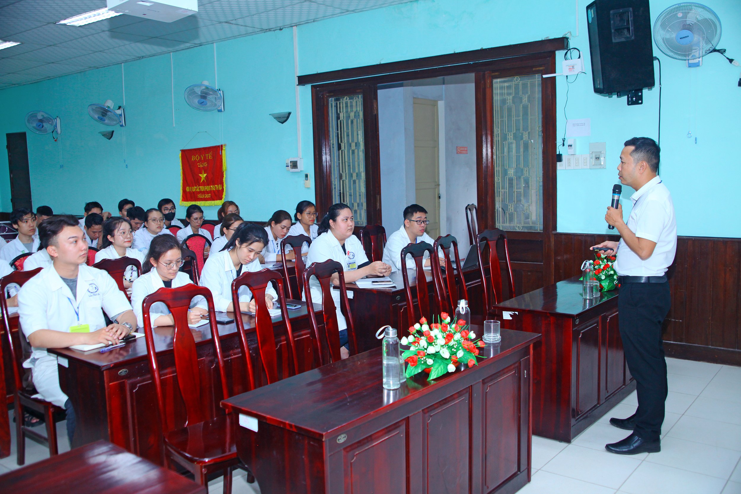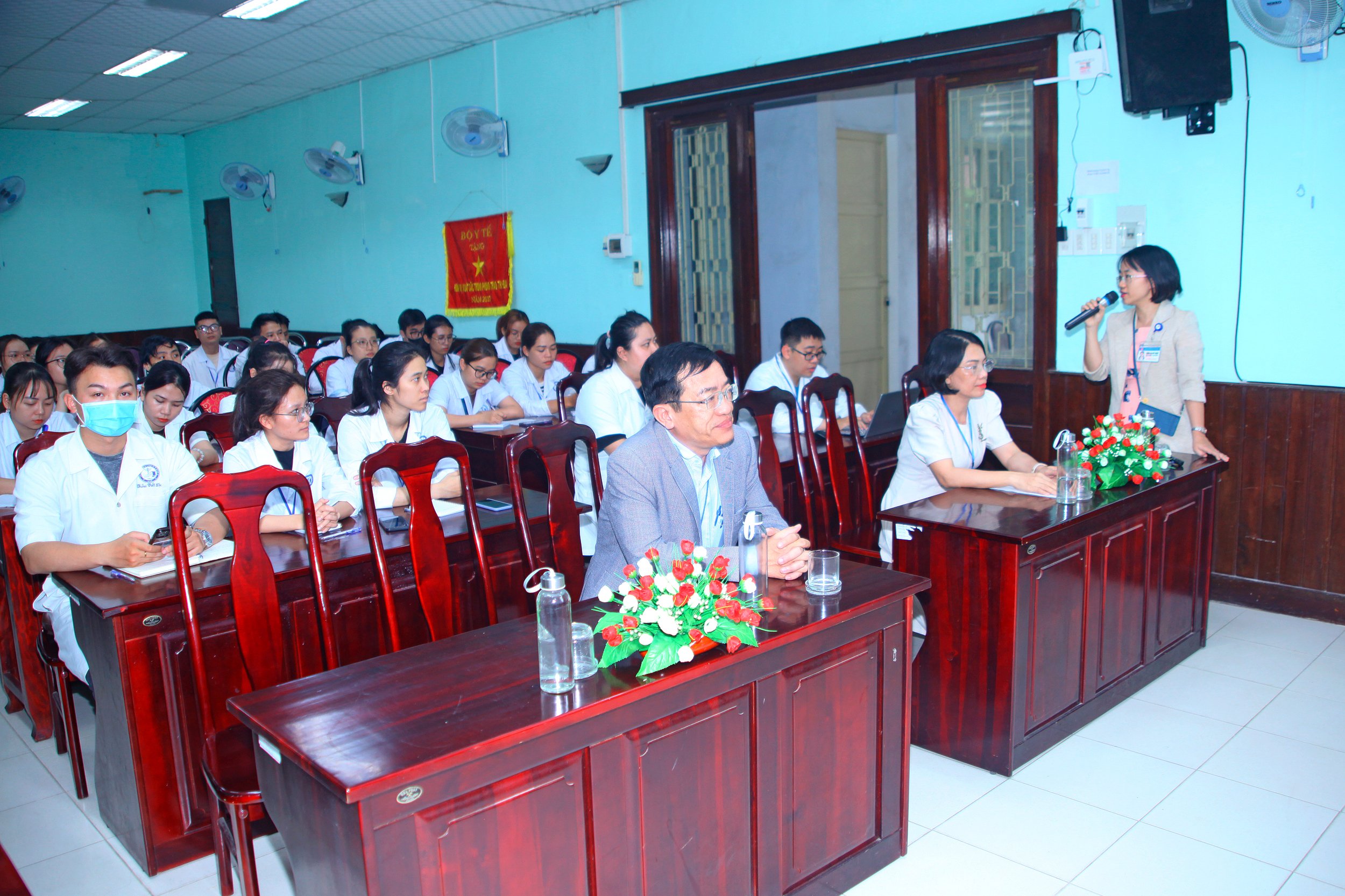 Tại buổi đầu gặp mặt, ThS.BS Hồ Xuân Vũ – Phó Giám đốc TT.KSBT đã trình bày báo cáo tổng quát về hệ thống Tổ chức Y tế Việt Nam, mô hình tổ chức và hoạt động của Trung tâm Kiểm soát bệnh tật tỉnh cũng như chức năng, nhiệm vụ, hoạt động chuyên môn chính của các khoa phòng nơi các sinh viên sẽ tham gia học tập.