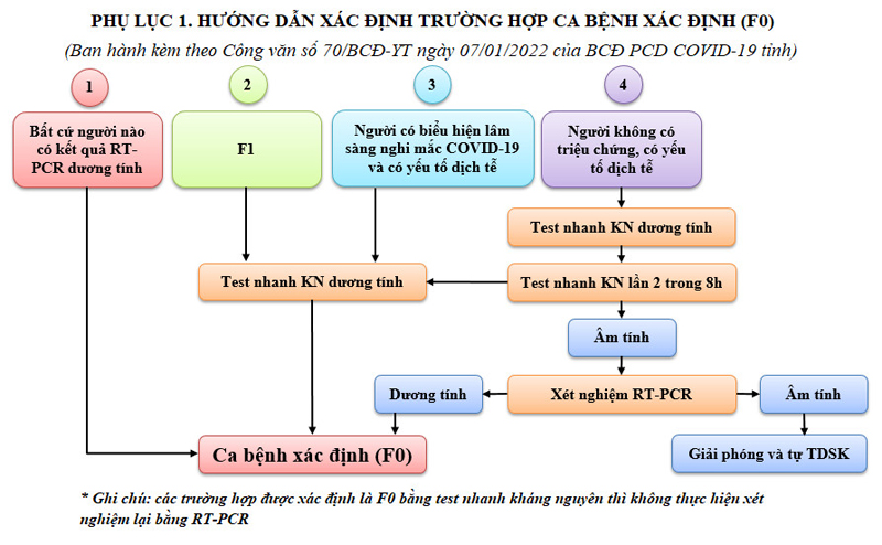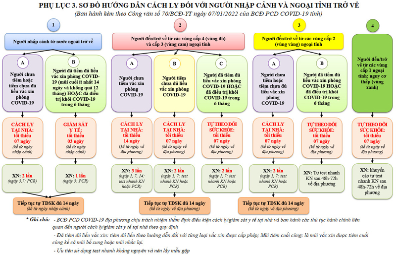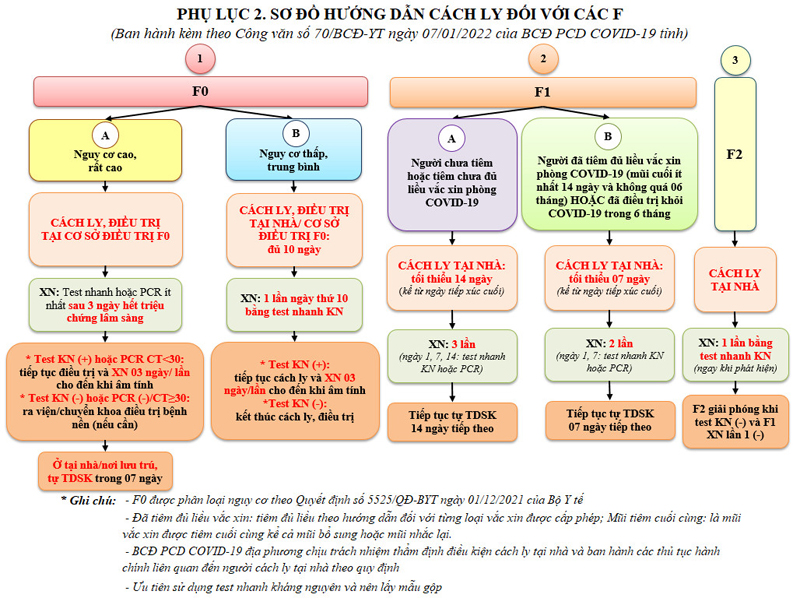 Sơ đồ hướng dẫn điều chỉnh các biện pháp phòng, chống dịch có sự thay đổi ở các nhóm cách ly đối với F0, F1 tiêm chưa đủ mũi; người nhập cảnh, người vùng đỏ, vùng cam đã tiêm đủ; giảm số lần xét nghiệm và kỹ thuật lấy mẫu xét nghiệm ở các nhóm đối tượng theo hướng dẫn của Bộ Y tế.