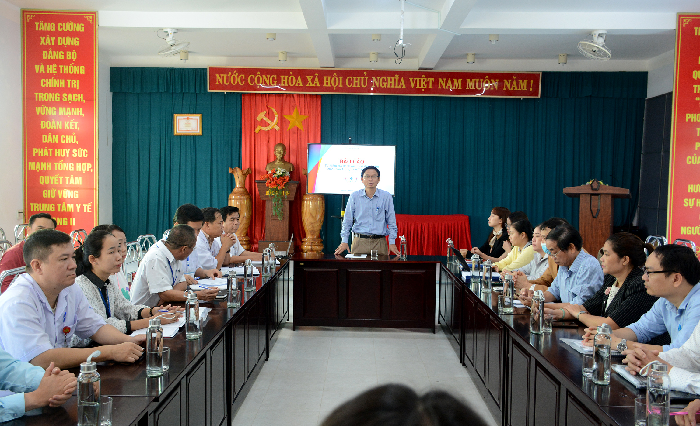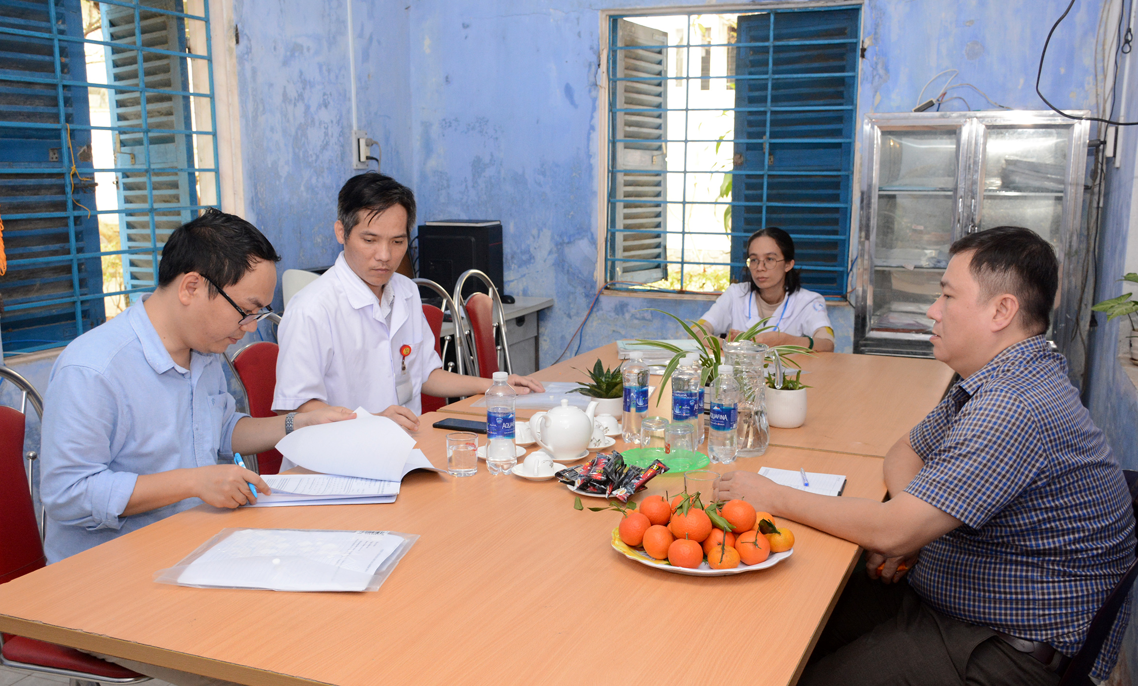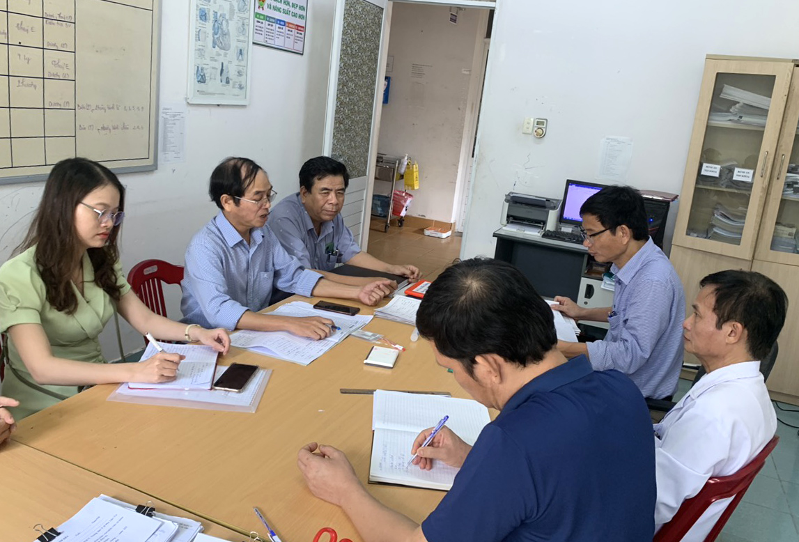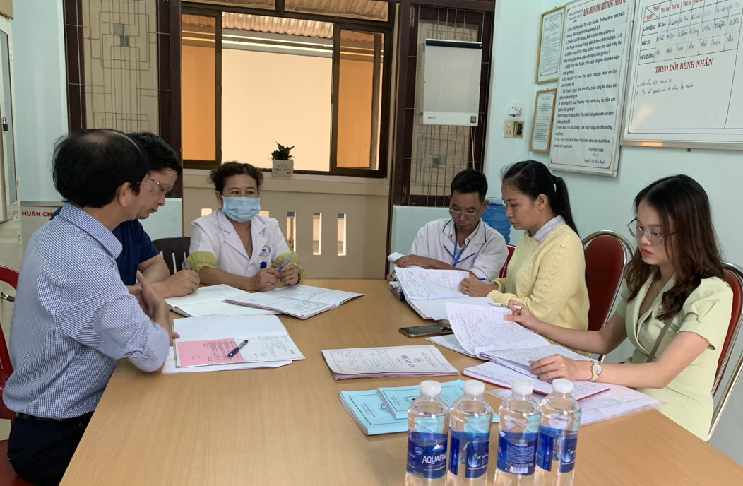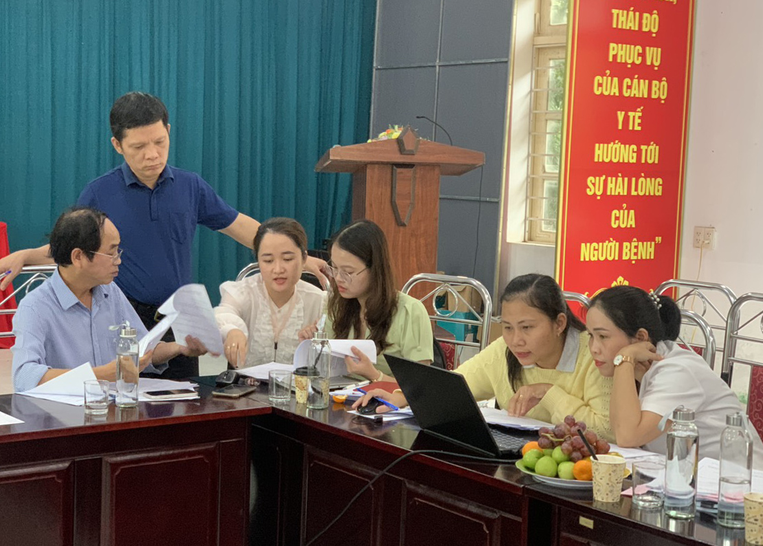 Trên cơ sở bảng tự chấm điểm của TTYT huyện, Đoàn công tác đã tiến hành phúc tra, đánh giá lại các nội dung: