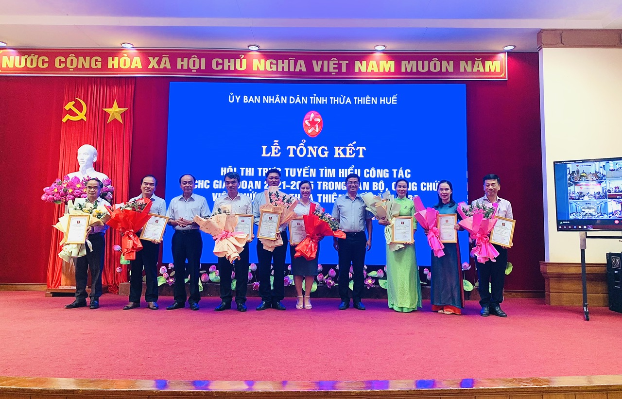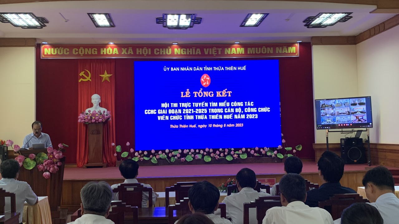 Chiều ngày 10/8/2023, Ủy ban Nhân dân tỉnh Thừa Thiên Huế đã tổ chức Lễ tổng kết Hội thi trực tuyến tìm hiểu công tác cải cách hành chính (CCHC) giai đoạn 2021-2025 trong cán bộ, công chức, viên chức năm 2023 bằng hình thức trực tuyến do đồng chí Nguyễn Thanh Bình- Ủy viên Thường vụ Tỉnh ủy, Phó Chủ tịch Thường trực UBND tỉnh, Trưởng ban Tổ chức Hội thi chủ trì. Đến tham dự tại điểm cầu UBND tỉnh có các thành viên trong Ban tổ chức, Ban Giám khảo, Tổ chuyên viên giúp việc; đại diện Lãnh đạo các đơn vị và Văn phòng các sở, ban, ngành thuộc UBND tỉnh; các cơ quan Trung ương đóng trên địa bàn tỉnh; đại diện lãnh đạo các đơn vị đạt giải tại Hội thi. Tại điểm cầu UBND các huyện, thị xã, thành phố Huế có đại diện lãnh đạo UBND và các phòng chuyên môn thuộc UBND các huyện, thị xã, thành phố Huế; Chủ tịch UBND và công chức Văn phòng- Thống kê của các xã, phường, thị trấn.