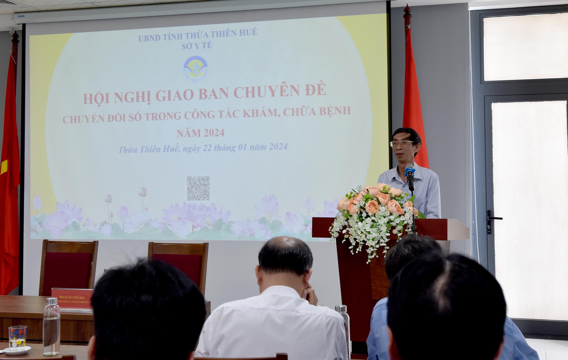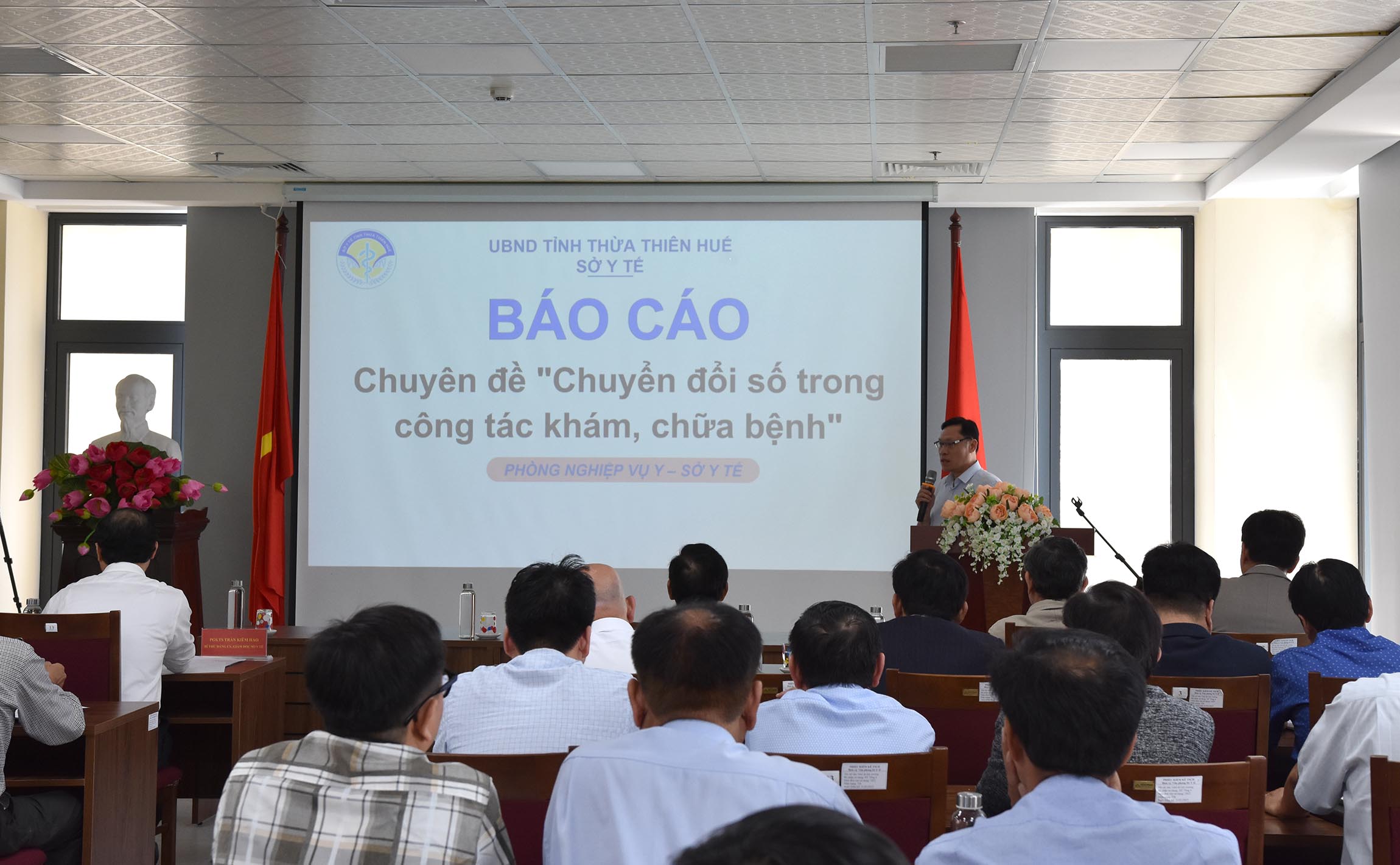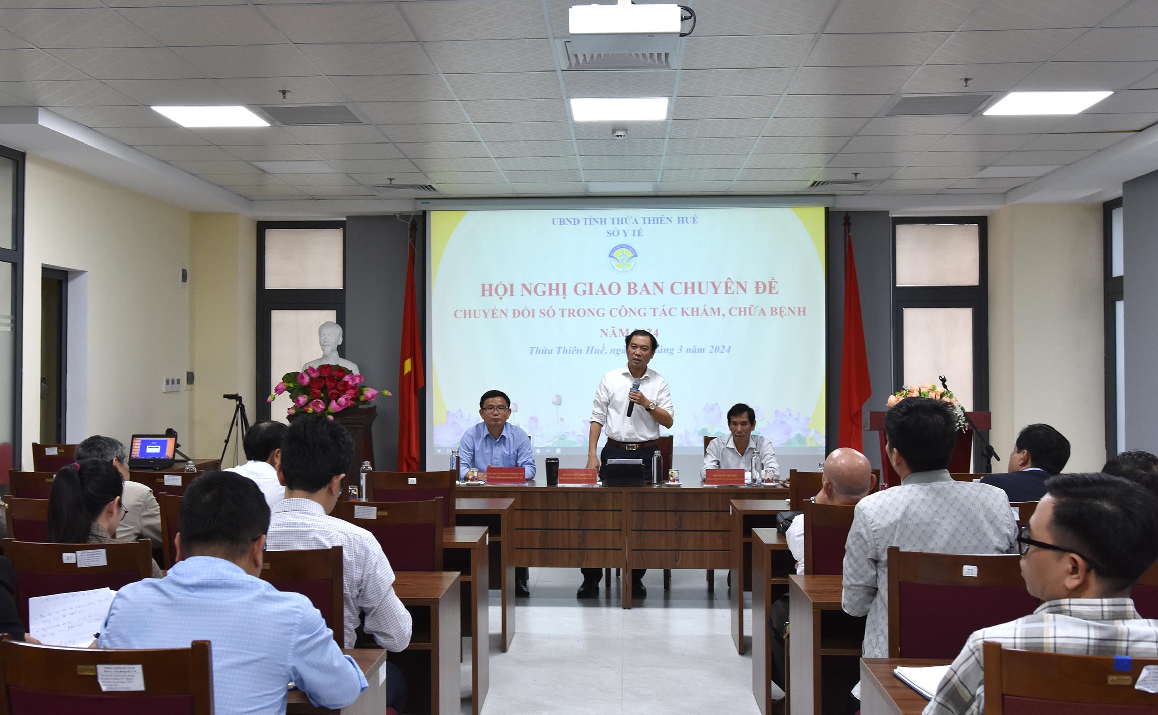Ngày 22/3/2024, Sở Y tế tổ chức Hội nghị chuyên đề "Chuyển đổi số trong công tác khám, chữa bệnh", PGS.TS.BS Trần Kiêm Hảo - Giám đốc Sở Y tế chủ trì hội nghị. Tham dự hội nghị có Ban Giám đốc, Trưởng/phó, chuyên viên phụ trách các nội dung thuộc các phòng của Sở Y tế; Ông Hoàng Trọng Chính - Phó Giám đốc đốc Bảo hiểm xã hội tỉnh; Giám đốc, Trưởng Phòng Kế hoạch Nghiệp vụ, cán bộ phụ trách CNTT của các bệnh viện chuyên khoa/đa khoa tuyến tỉnh, các đơn vị trực thuộc và 9 TTYT huyện/thị xã/thành phố.