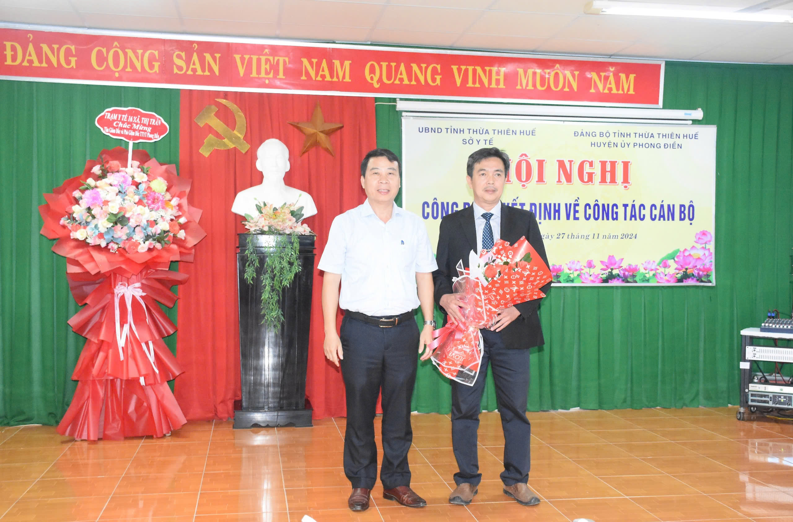 Chiều ngày 27/11/2024, tại TTYT huyện Phong Điền, Sở Y tế đã tổ chức “Hội nghị công bố Quyết định về công tác cán bộ”. PGS.TS Trần Kiêm Hảo - Bí thư Đảng ủy - Giám đốc Sở Y tế, ông Hoàng Văn Thái - Phó Chủ tịch UBND huyện Phong Điền, Trưởng Phòng Tổ chức- Cán bộ Sở Y tế cùng Ban Giám đốc, cán bộ chủ chốt, lãnh đạo các khoa/phòng, các đoàn thể và trưởng Trạm Y tế 16 xã/thị trấn thuộc TTYT huyện Phong Điền cùng tham dự.