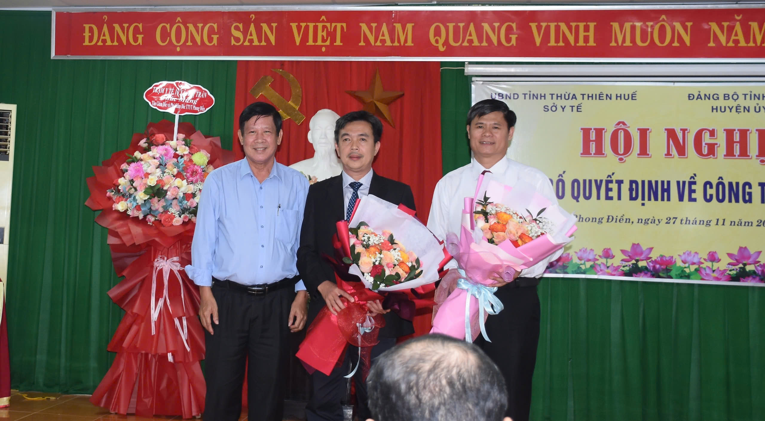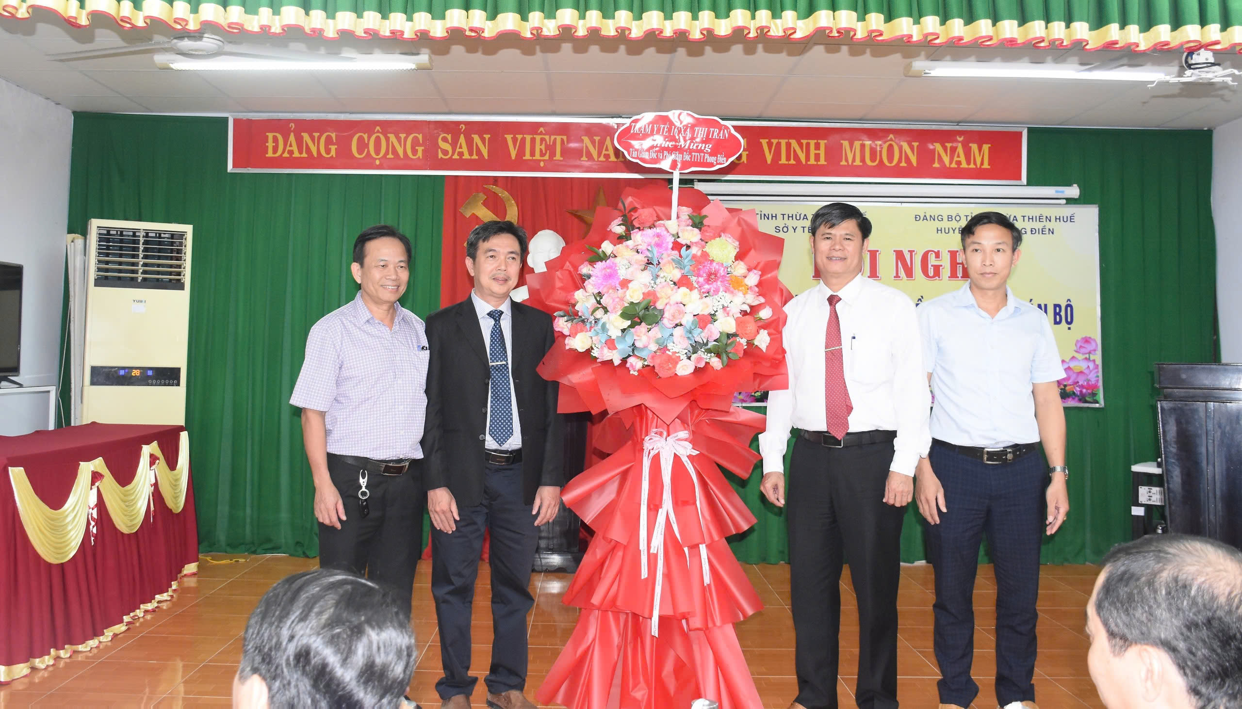 Ông Hoàng Văn Thái - Phó Chủ tịch UBND huyện, BSCKII Nguyễn Đức Lợi - Giám đốc TTYT và đại diện 16 Trưởng Trạm Y tế xã/thị trấn huyện Phong Điền tặng hoa chúc mừng (ảnh trên xuống).