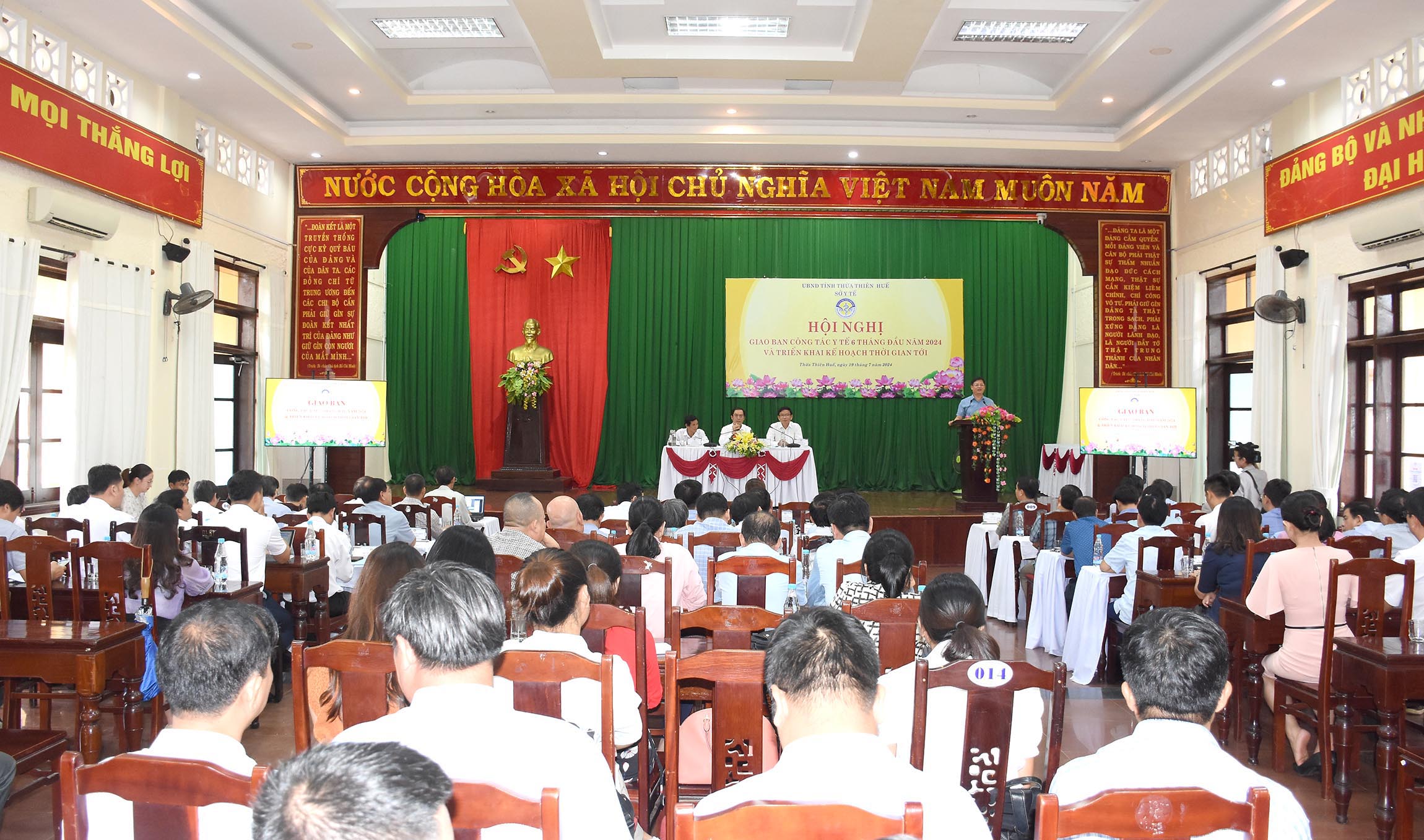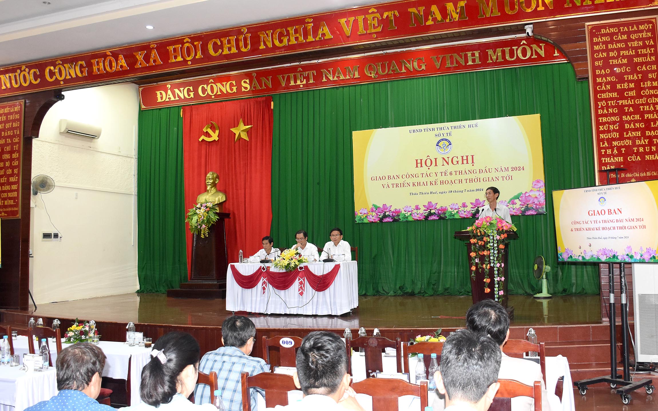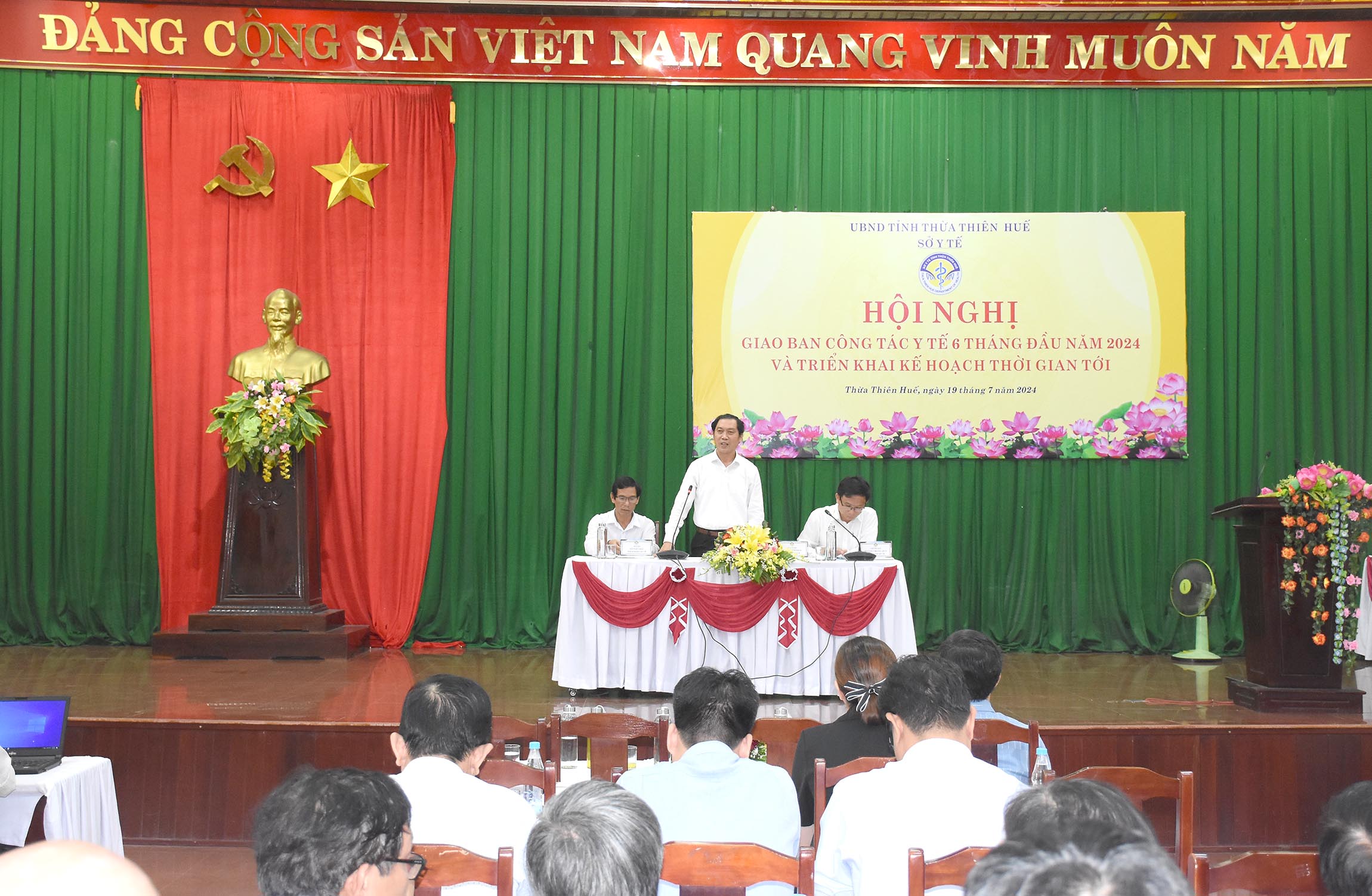 Ngày 19/7/2024 tại huyện Phong Điền, Sở Y tế tổ chức Hội nghị Giao ban công tác Y tế 6 tháng đầu năm và triển khai kế hoạch thời gian tới, đồng chí Nguyễn Thanh Bình - UVTV Tỉnh ủy, Phó Chủ tịch Thường trực UBND tỉnh dự và chủ trì hội nghị. Cùng tham dự hội nghị có lãnh đạo Văn phòng UBND tỉnh, Phòng Khoa giáo-Văn xã; BHXH tỉnh, Ban Giám đốc, các Trưởng/phó phòng/chuyên viên Sở Y tế; lãnh đạo UBND/Văn phòng UBND/TYTT các huyện/thị xã/thành phố; lãnh đạo và bộ phận Kế hoạch - Tài chính/Tổng hợp BV đa khoa/chuyên khoa trong/ngoài công lập và các đơn vị trực thuộc Sở Y tế.