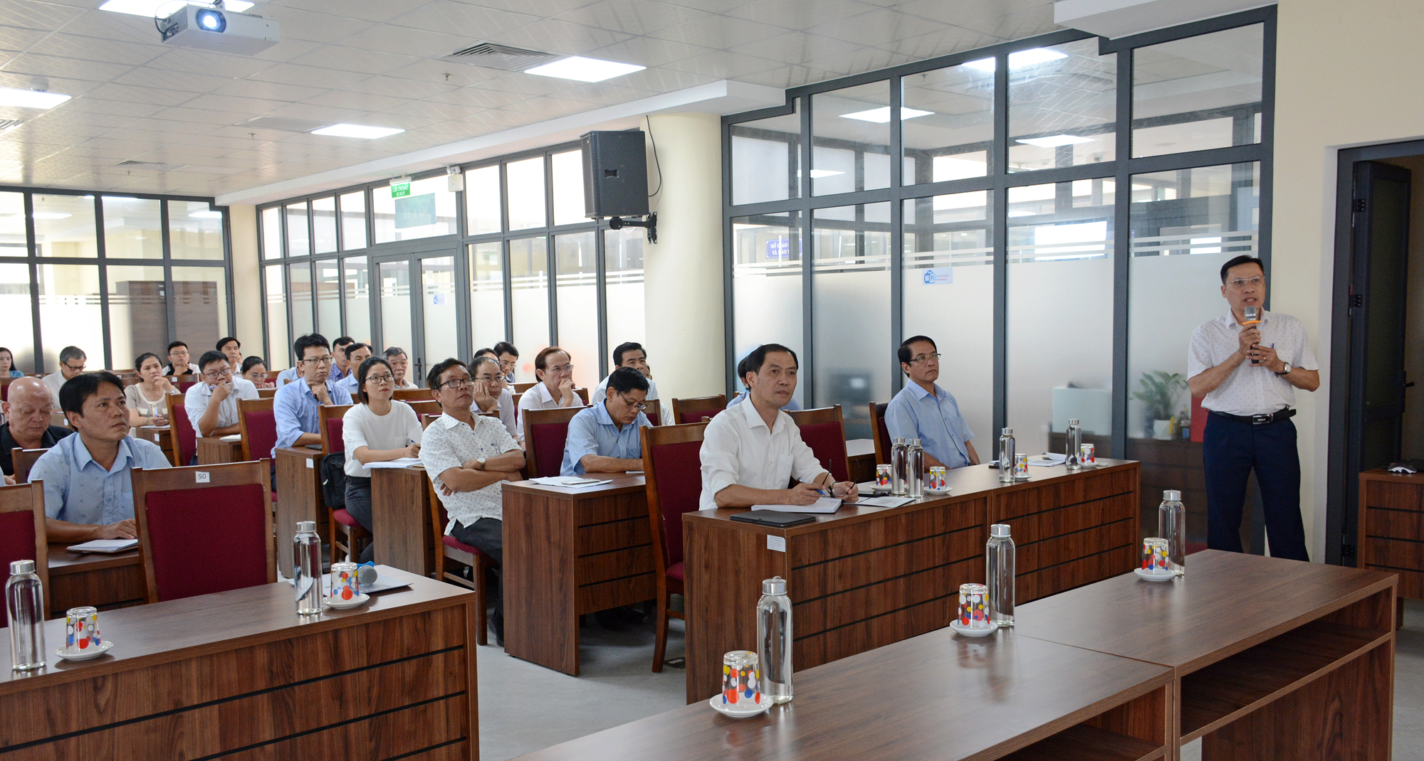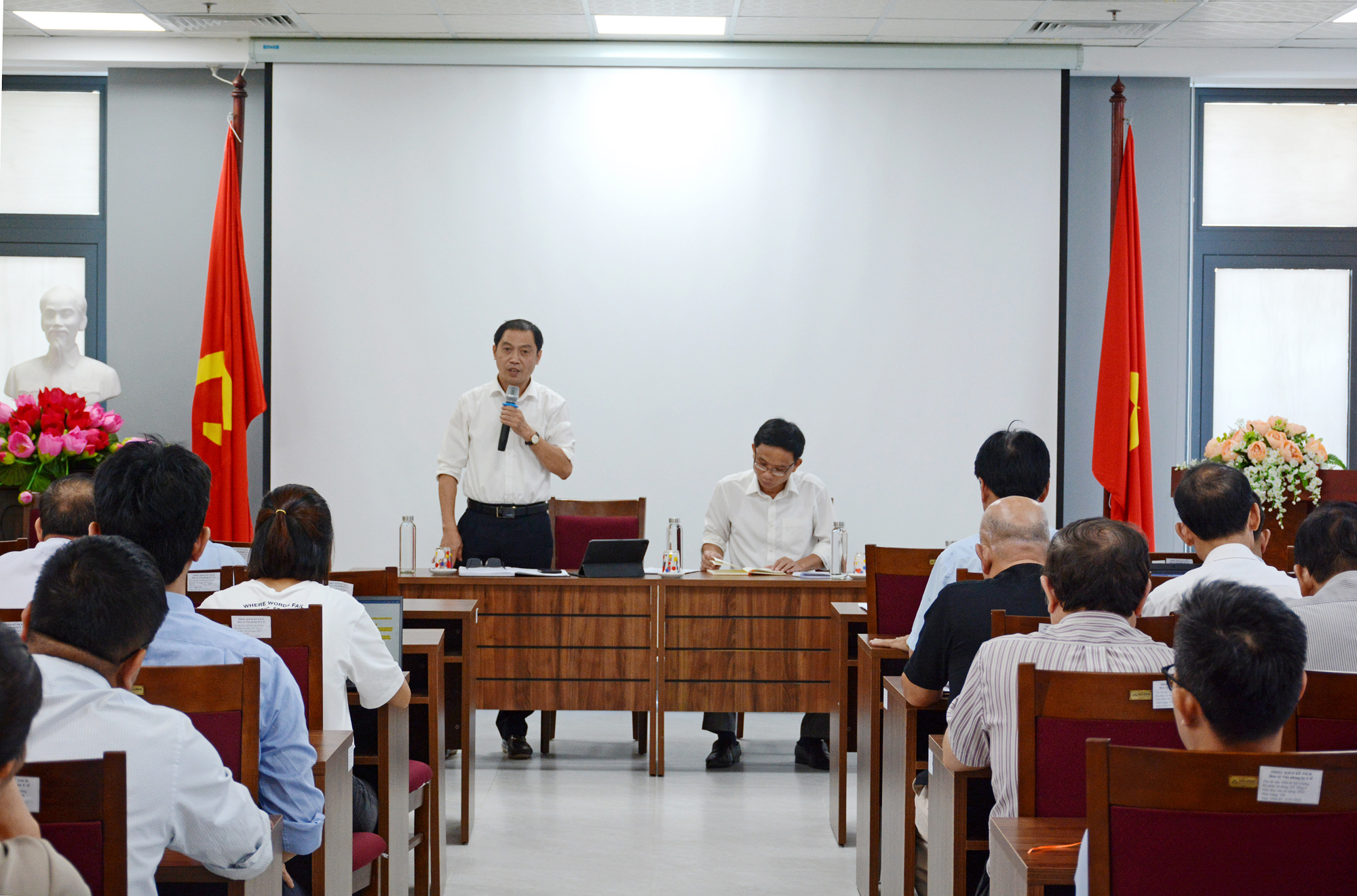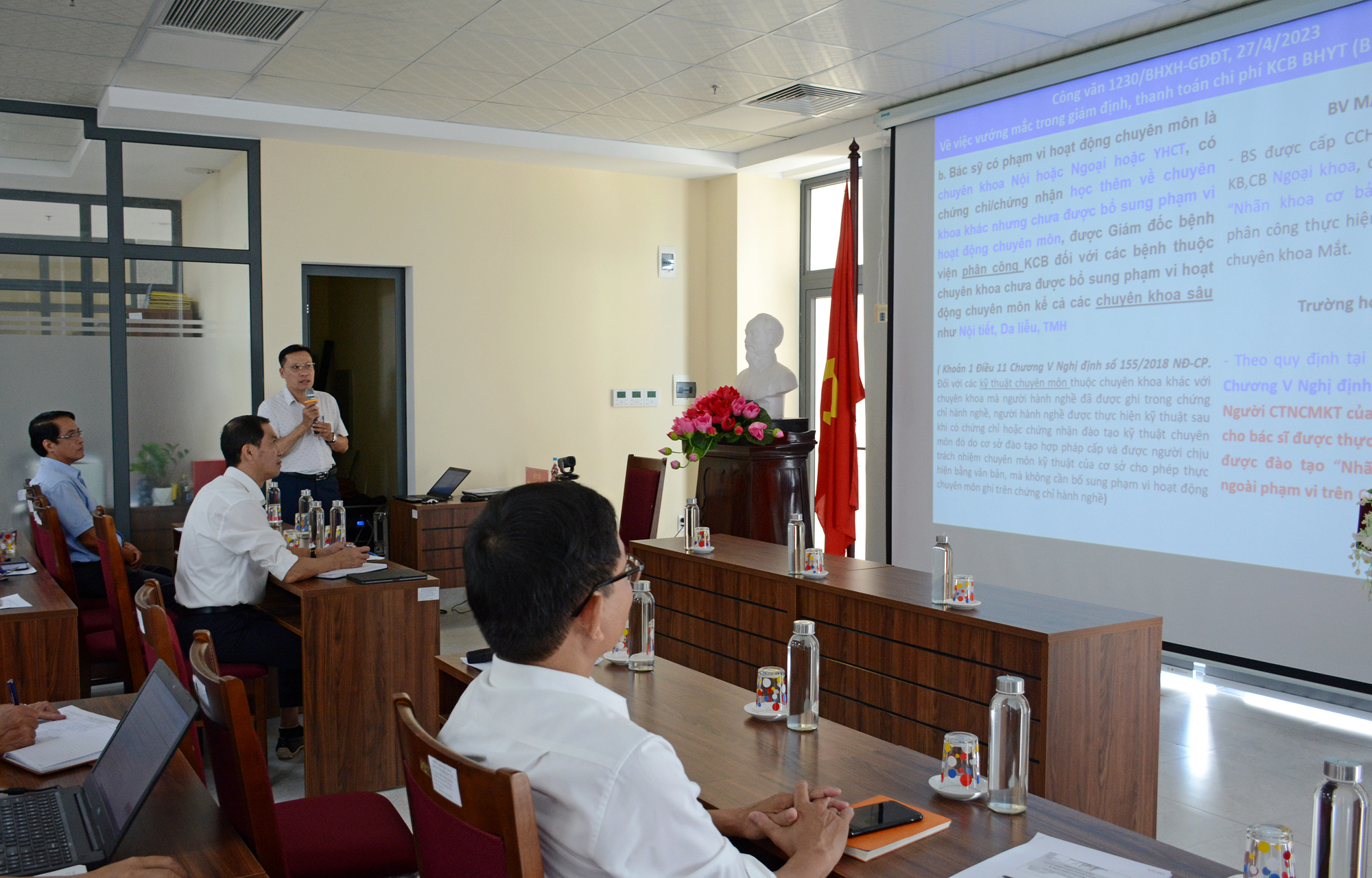 Lãnh đạo và chuyên viên Phòng Nghiệp vụ Y trình bày các nội dung văn bản của BHXH Việt Nam có liên quan đến công tác giám định, thanh toán chi phí khám chữa bệnh BHYT.