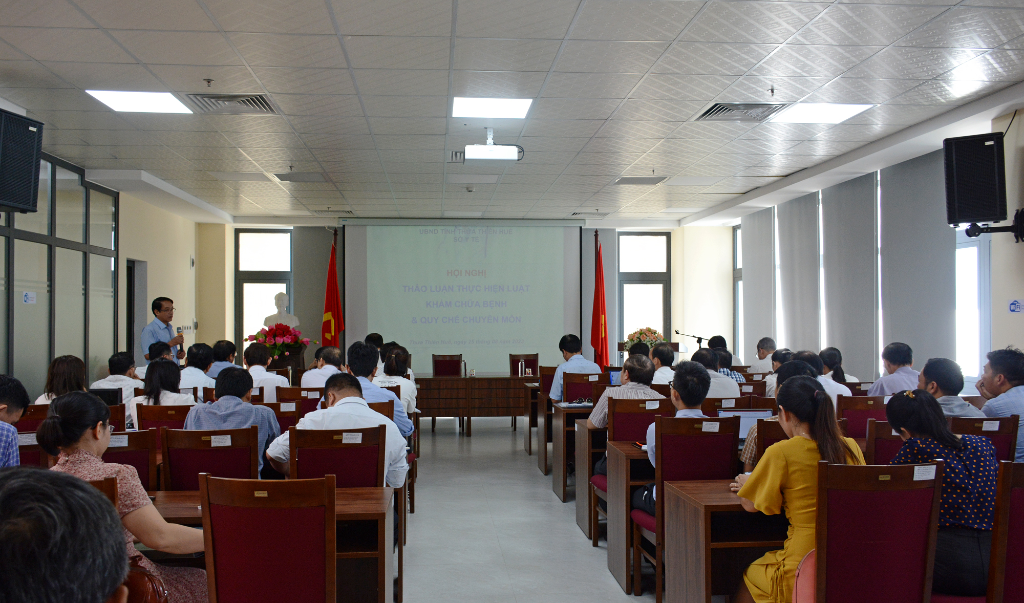 Chiều ngày 25/8/2023, sở Y tế tổ chức Hội nghị thảo luận thực hiện Luật Khám chữa bệnh (KBCB) và Quy chế chuyên môn, Ban Giám đốc sở Y tế dự và chỉ đạo hội nghị. Trưởng phòng/chuyên viên các phòng Nghiệp vụ Y, Nghiệp vụ Dược, Tổ chức Cán bộ, Kế hoạch - Tài Chính, Thanh Tra, Văn phòng sở Y tế; Giám đốc, Trưởng phòng Kế hoạch - Nghiệp vụ, cán bộ phụ trách công tác Bảo hiểm Y tế Phòng bảo vệ sức khỏe cán bộ tỉnh, các BV đa khoa/chuyên khoa và 9 TTYT các huyện/thị xã/thành phố trên địa bàn tỉnh cùng tham dự hội nghị.