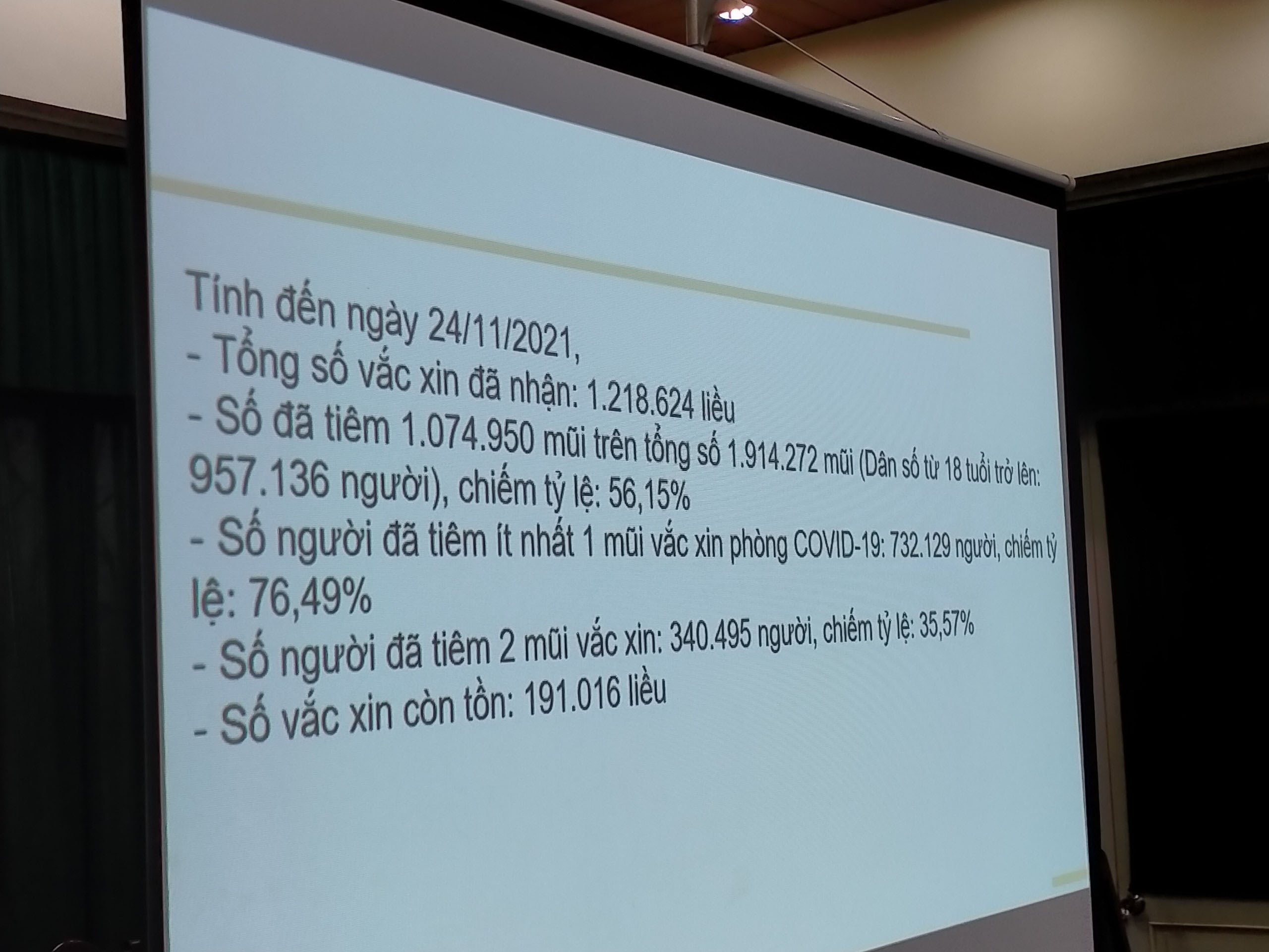Tính đến ngày 24/11/2021, toàn tỉnh đã được cấp 1.218.624 liều vắc xin các loại. Tỉnh đã tổ chức tiêm chủng 1.074.950 mũi trên tổng số 1.914.272 mũi (dân số từ 18 tuổi trở lên 957, 136 người) chiếm tỷ lệ: 56,15%. Số người đã tiêm ít nhất 1 mũi vắc xin phòng Covid-19: 732.129 người, chiếm tỷ lệ: 76,49%. Số người đã tiêm 2 mũi vắc xin: 340.495 người, chiếm tỷ lệ: 35,57%. Số vắc xin còn tồn: 191.016 liều