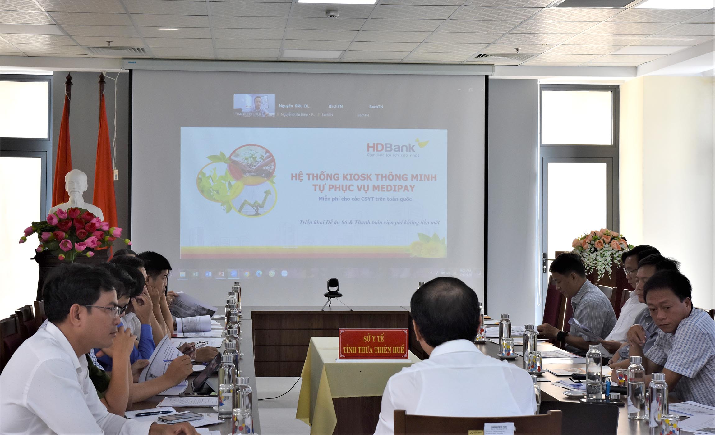 Cuộc họp được trực tuyến với Trưởng bộ phận Ban dự án PEB thuộc HDBank Hội sở, đầu cầu tại th/phố Hồ Chí Minh. Các thành viên được giới thiệu về Chương trình tài trợ chuyển đổi số Y tế; Tổng quan, mục tiêu, giải pháp Kiosk Y tế thông minh của HDBank, các thông số kỹ thuật, mô hình kết nối với hệ thống HIS, các chức năng của KIOSK MEDIPAY. Tháng 5/2025, HD Bank ký cam kết tài trợ miễn phí 1001 Kiosk cho các cơ sở Y tế công lập trên toàn quốc và tài trợ toàn bộ chi phí vận hành giải pháp trong suốt thời gian hợp tác 5 năm.