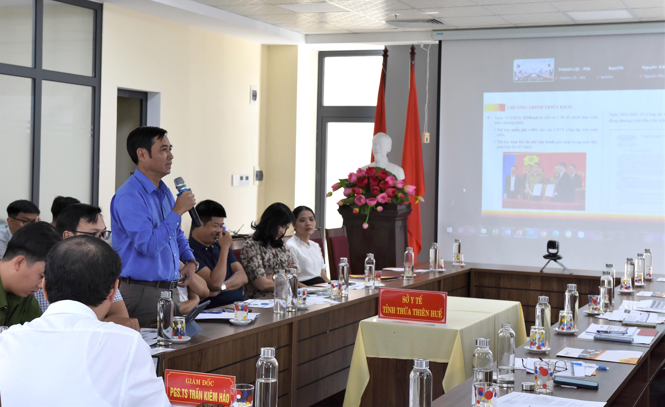 PGS.TS.BS Trần Kiêm Hảo - Giám đốc Sở Y tế chủ trì cuộc họp tại đầu cầu Sở Y tế kết nối với ông Lương Thanh Lợi - Trưởng bộ phận Ban dự án PEB thuộc HDBank Hội sở, báo cáo viên đầu cầu tại th/phố Hồ Chí Minh.