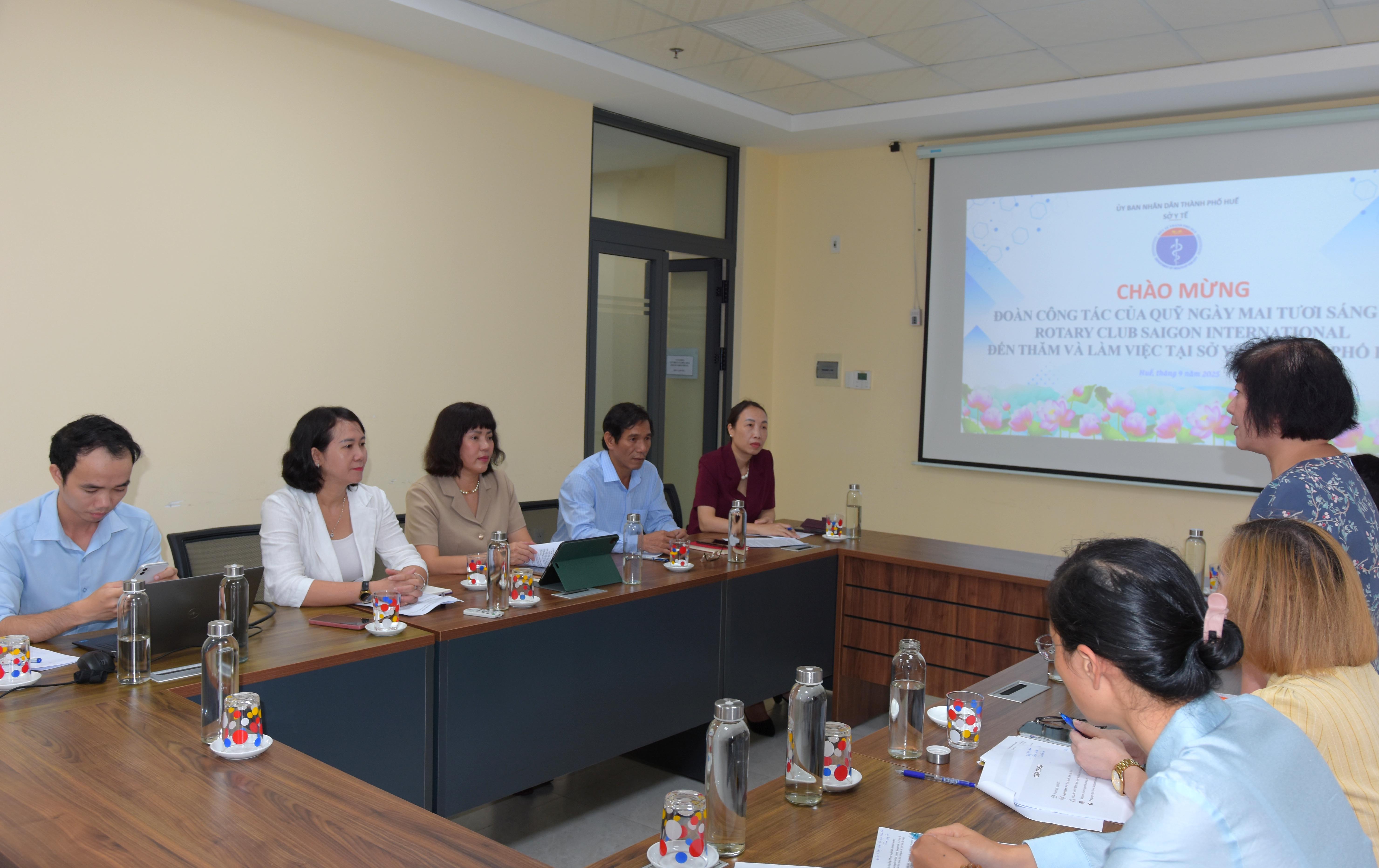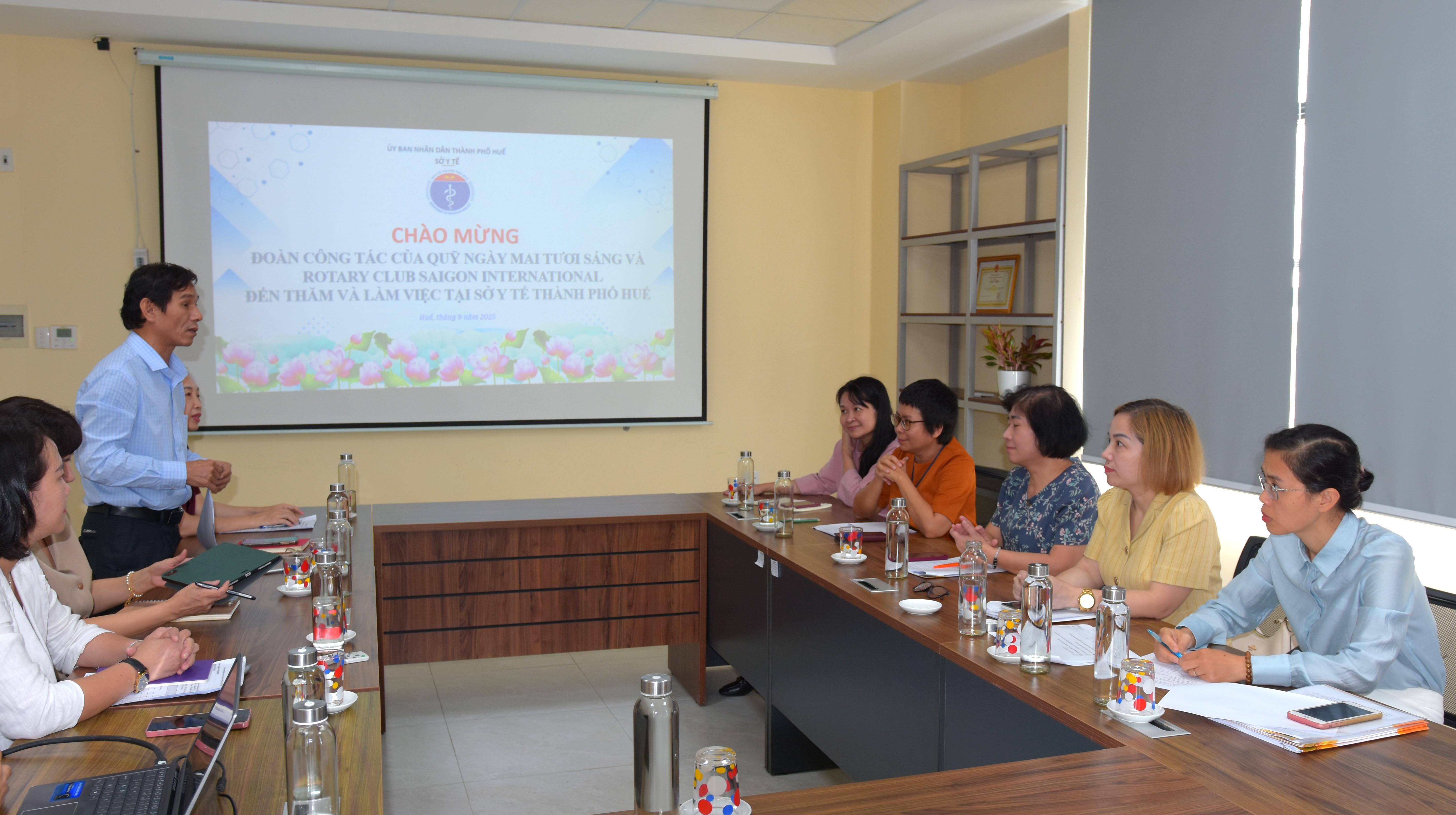 Sáng ngày 26/9, Sở Y tế có buổi làm việc với Đoàn công tác Quỹ Hỗ trợ bệnh nhân ung thư - Ngày Mai Tươi Sáng và Nhà tài trợ Rotary Club Saigon Internationl do PGS.TS Trần Thị Thanh Hương - Giám đốc Quỹ Hỗ trợ bệnh nhân ung thư Ngày Mai Tươi Sáng - Phó Viện trưởng Viện Ung thư quốc gia làm trưởng đoàn, tiếp và làm việc với Đoàn có Ban Giám đốc, phòng Nghiệp vụ Y sở Y tế.