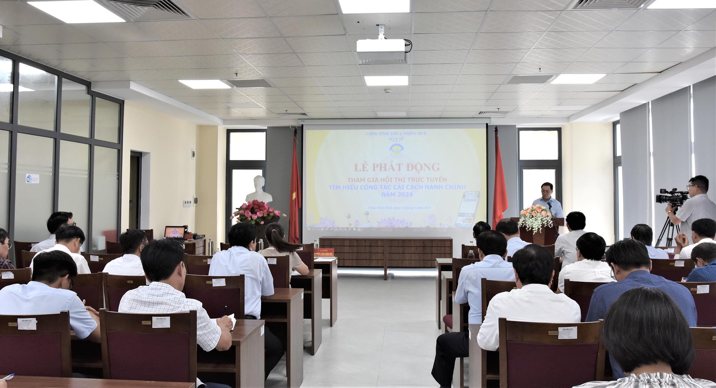 Lễ Phát động thông qua các nội dung, hình thức, thể lệ, hướng dẫn dự thi... Cán bộ/công chức/viên chức/người lao động sử dụng tài khoản cá nhân đã đăng ký để đăng nhập tham gia dự thi trên nền tảng Hue-S. Phần thi trắc nghiệm diễn ra trong 04 đợt, bắt đầu từ ngày 17/6/2024, kết thúc vào ngày 14/7/2024, mỗi đợt một thí sinh chỉ được tham gia một lượt thi, đề thi gồm 15 câu hỏi trắc nghiệm. Nội dung câu hỏi trắc nghiệm nằm trong danh mục các văn bản được ban hành theo Kế hoạch số 177/KH-UBND ngày 26/4/2024 của UBND tỉnh.../.