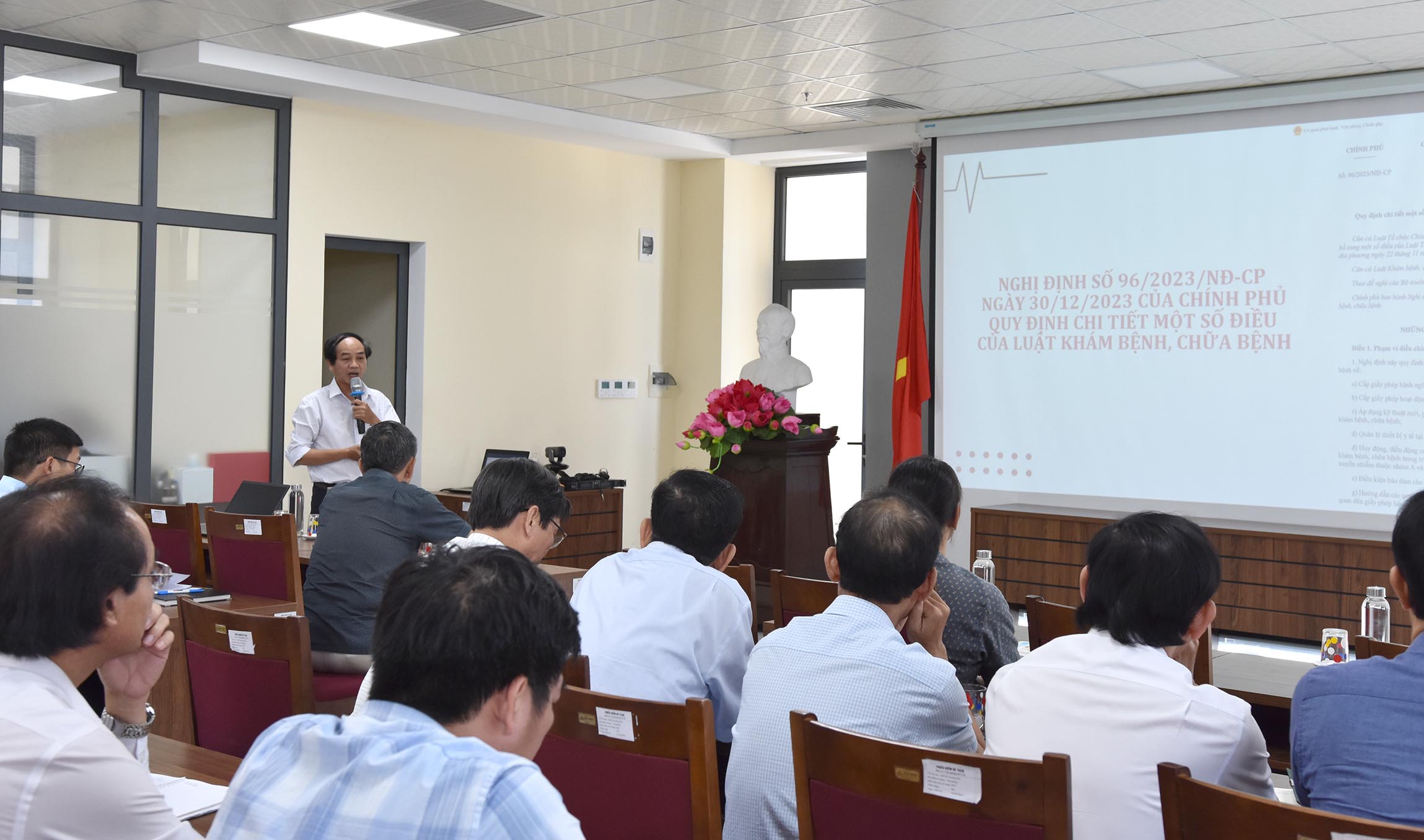 Nghị định 96/2023/NĐ-CP có IX Chương, 148 Điều và 7 phụ lục, có hiệu lực thi hành từ ngày 01/01/2024, để thể chế hóa các nội dung theo tinh thần của Luật Khám bệnh, Chữa bệnh số 15/2023/QH15. Hội nghị giới thiệu và phổ biến một số một nội dung trọng tâm, nhấn mạnh những vấn đề quan trọng và có liên quan đến hoạt động khám chữa bệnh (KCB).