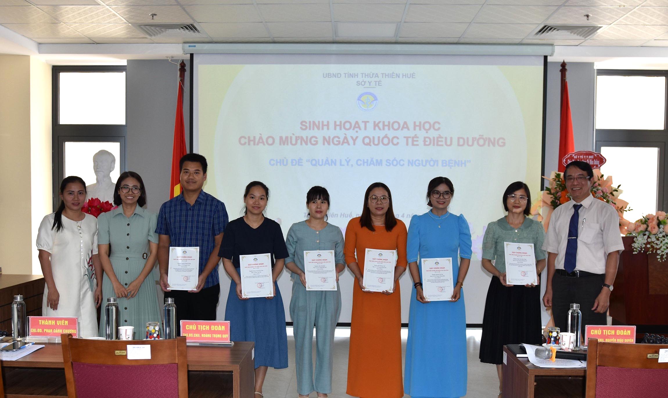 Chủ tịch đoàn phiên 1: ThS.Bs CKII. Hoàng Trọng Quý- Phó Giám đốc Sở Y tế, Phiên 2: ThS.Bs CKII. Nguyễn Mậu Duyên - Trưởng Phòng Nghiệp vụ Y. Cùng các thành viên hội đồng: ĐD CKI Phan Cảnh Chương - Phó Chủ tịch Hiệp hội ĐD Việt Nam, Chủ tịch Hội ĐD tỉnh Thừa Thiên Huế. Tiến sĩ ĐD Hồ Thị Thùy Trang- Giảng viên khoa Điều dưỡng, Thư ký Hội đồng ĐD ThS Phan Thị Hiếu - Chuyên viên Phòng Nghiệp Vụ Y Sở Y tế.