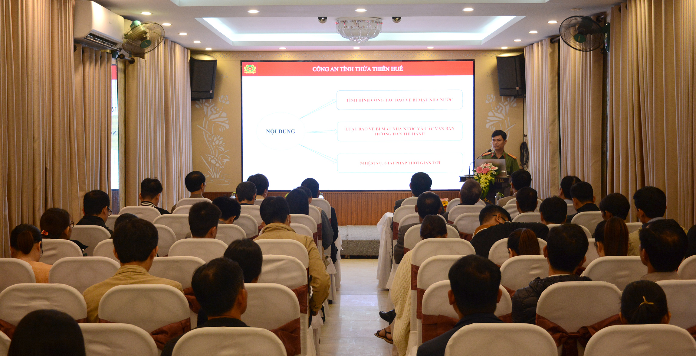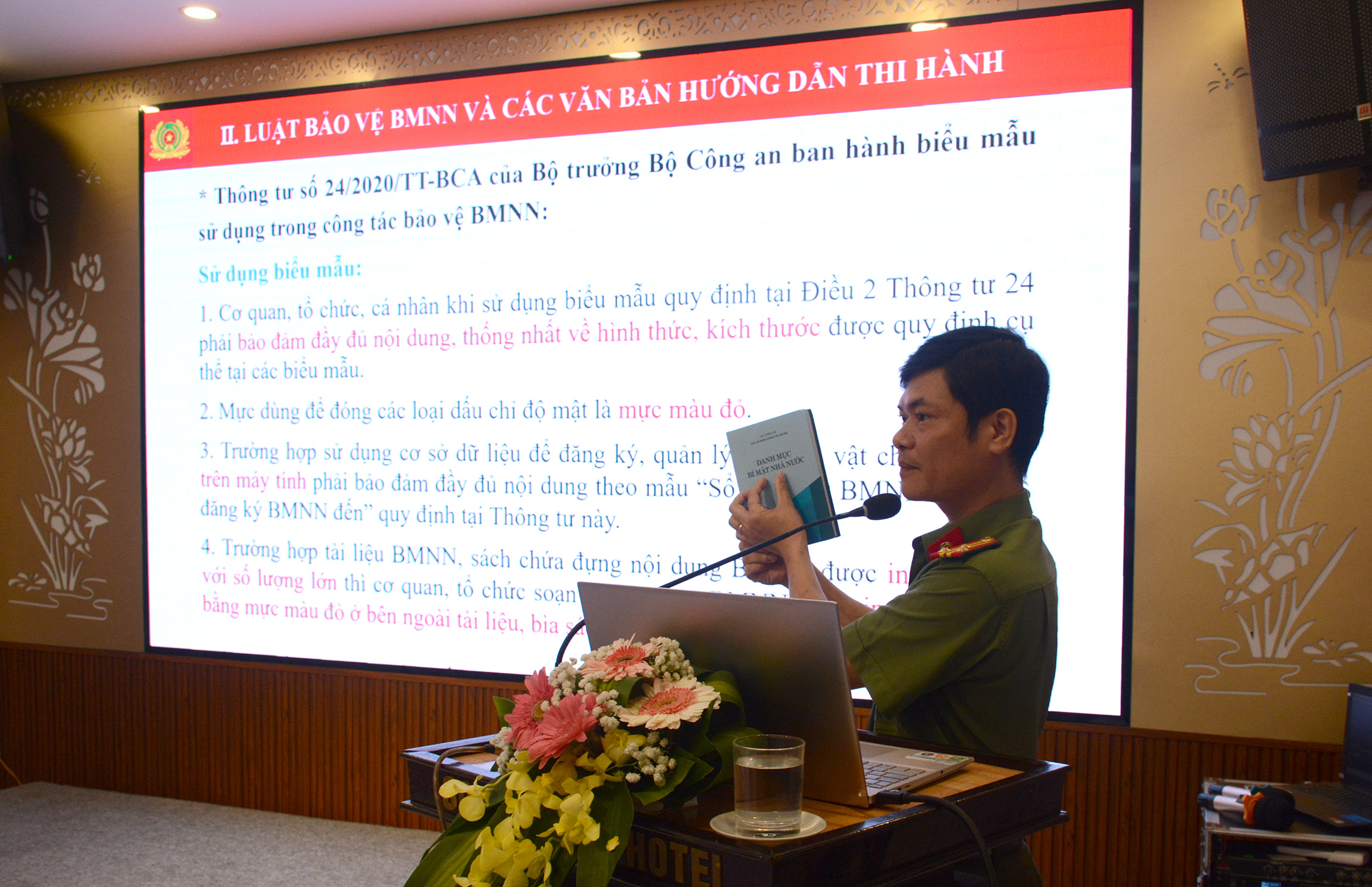 Thượng tá Đào Duy Bình - Phó trưởng Phòng PA03 Công an tỉnh báo cáo các chuyên đề về An toàn, an ninh thông tin và Bảo vệ bí mật nhà nước.