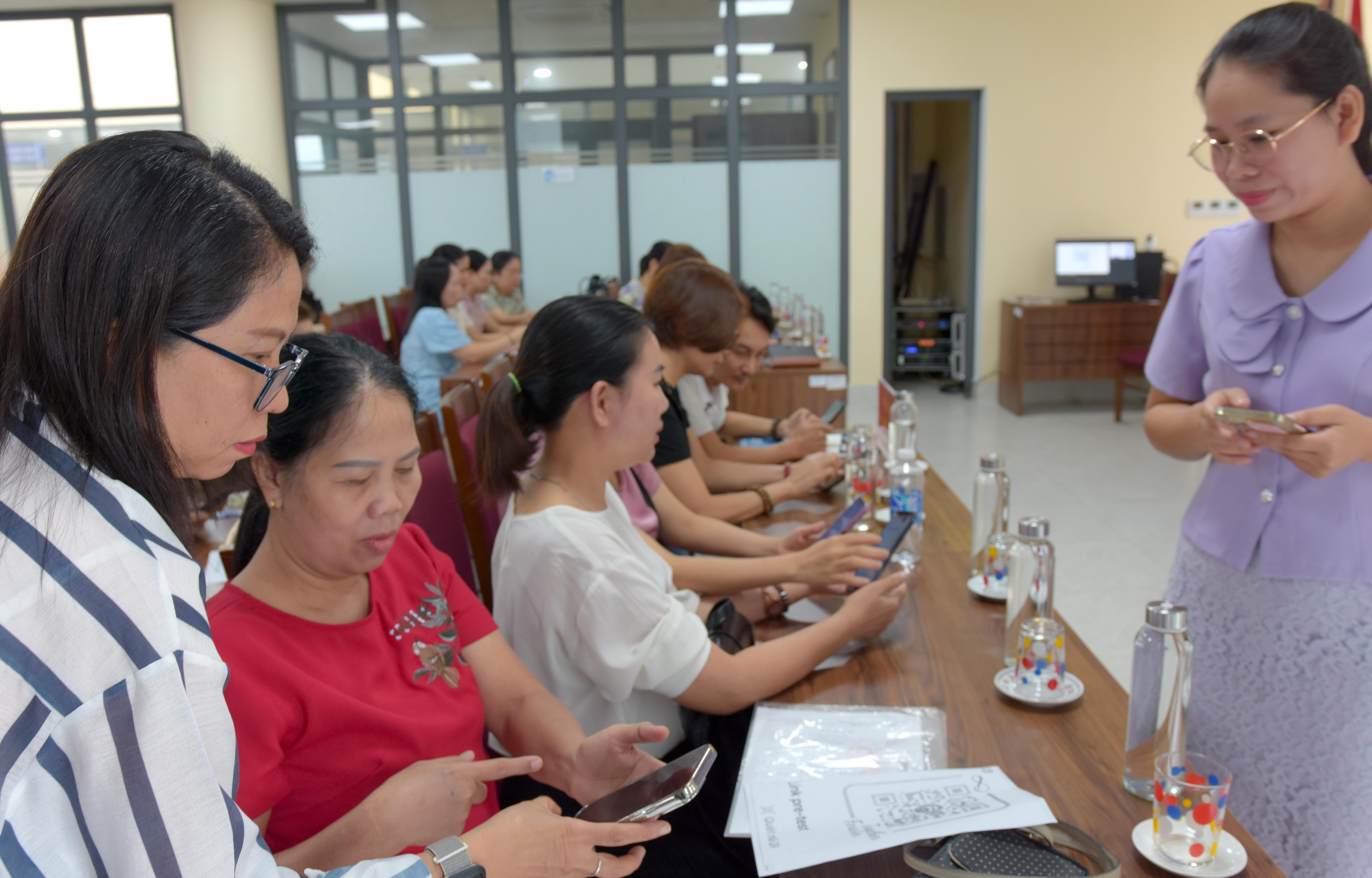 Các học viên làm bài kiểm tra trước khoá tập huấn bằng công nghệ QR trên điện thoại thông minh.