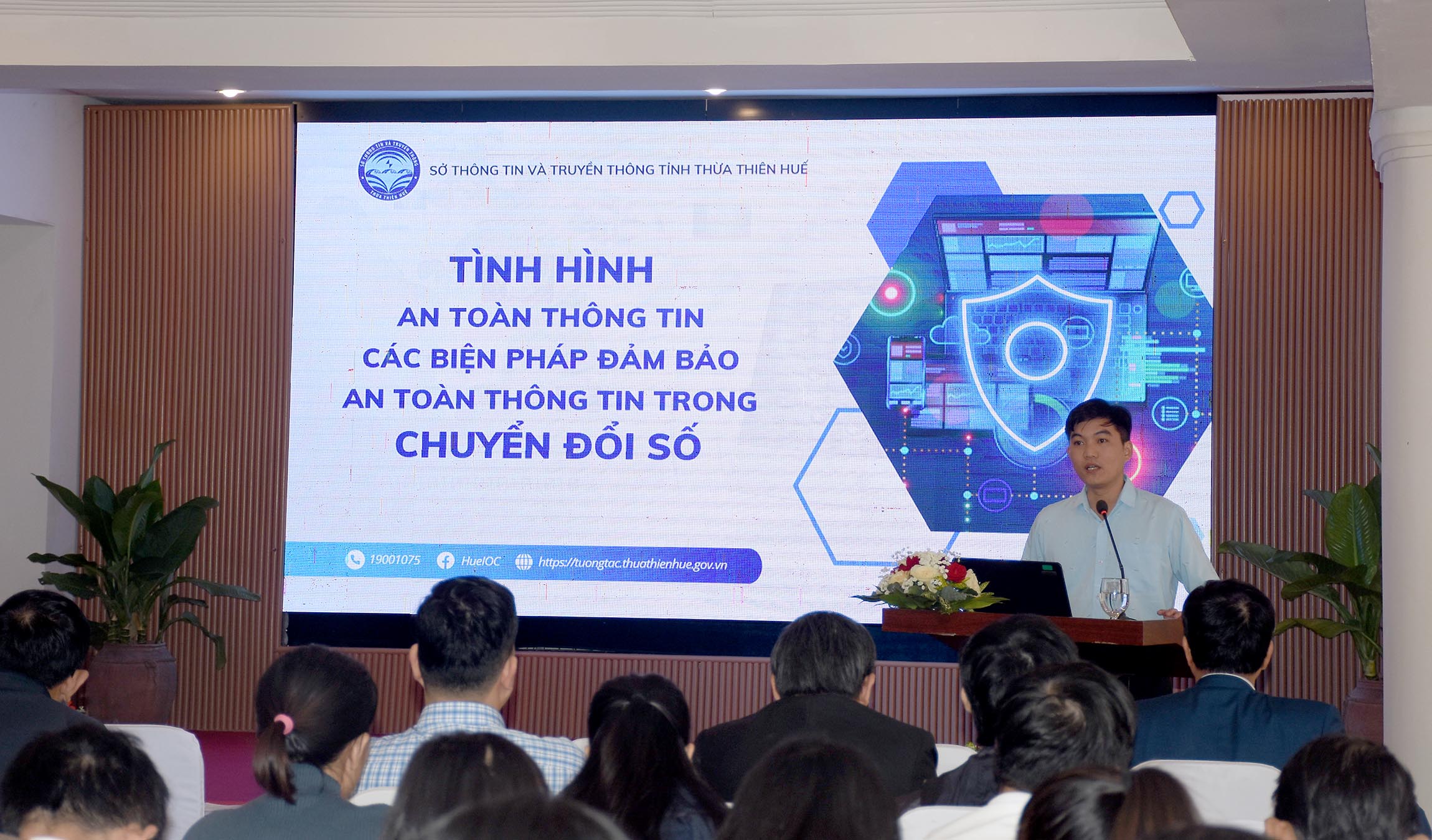 Hơn 160 đại biểu/học viên được các giảng viên/báo cáo viên đến từ Phòng An ninh mạng & Phòng chống tội phạm sử dụng công nghệ cao - Công an tỉnh (Phòng PA05), Trung tâm Giám sát điều hành đô thị thông minh tỉnh và Sở Y tế Thừa Thiên Huế truyền đạt các nội dung và cung cấp các thông tin về: Cảnh báo các nguy cơ gây mất an ninh mạng, an toàn thông tin (ATTT) trong tình hình hiện nay; Tình hình ATTT và các biện pháp đảm bảo ATTT trong chuyển đổi số; Triển khai một số nội dung liên quan dịch vụ đô thị thông minh tỉnh; Đánh giá kết quả triển khai Quyết định số 118/QĐ-SYT của Sở Y tế về Kế hoạch hành động thực hiện Nghị quyết của Đảng ủy Sở Y tế về Chuyển đổi số (CĐS) y tế đến năm 2025 định hướng đến năm 2030 và Nội dung Đề án 06: Sổ sức khỏe điện tử, Kiosk Y tế thông minh, Chữ ký số...