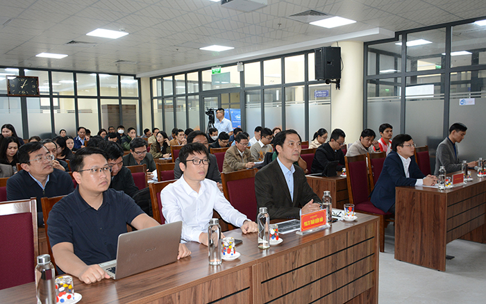 Các đại biểu nghe phát biểu của bà Nguyễn Thị Thanh Thủy - Giám đốc Foxpay (Cung cấp dịch vụ trung gian thanh toán) tại điểm cầu Trung tâm Thanh toán trực tuyến của Nhà Viễn thông FPT (Hà Nội)