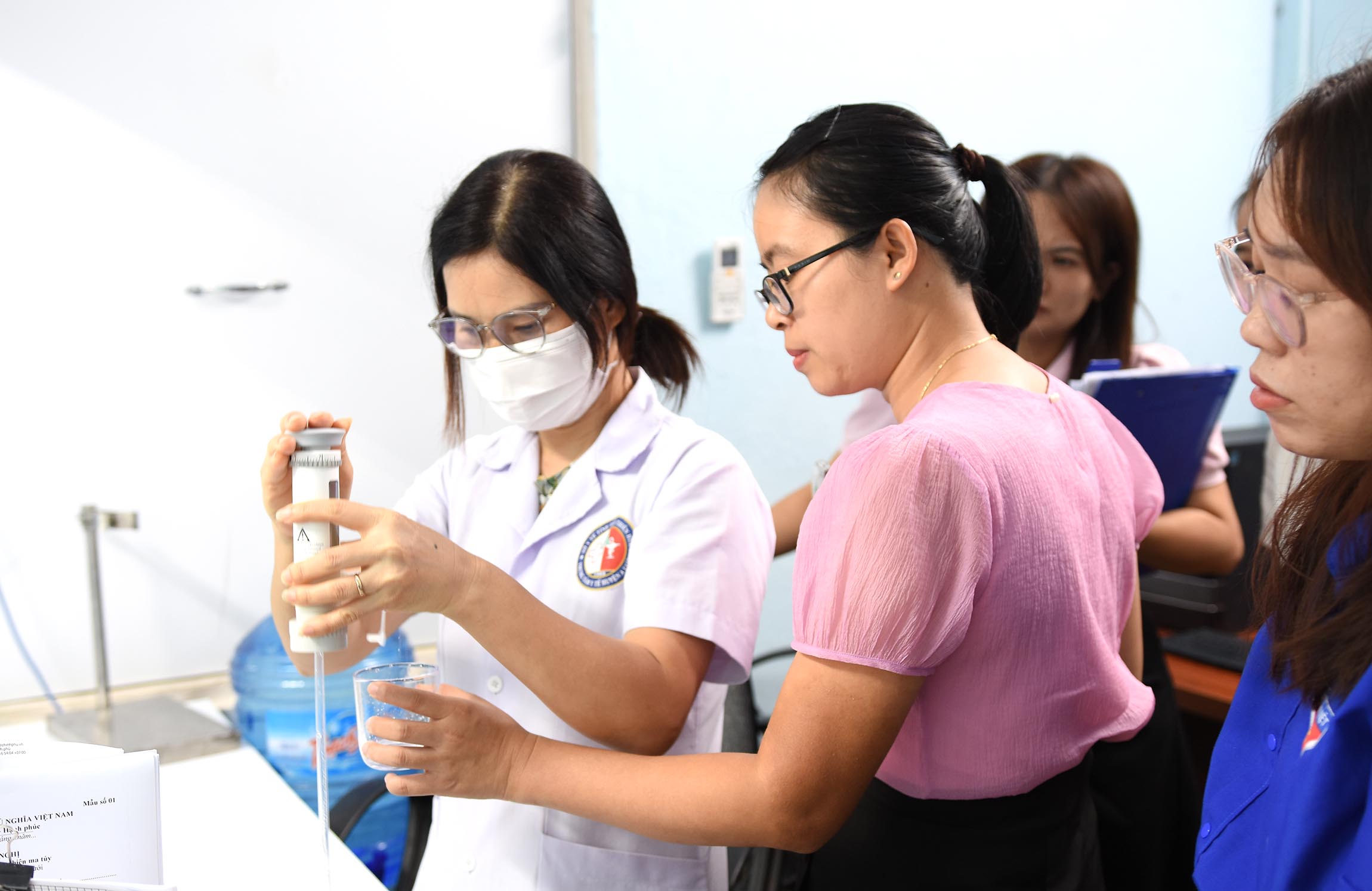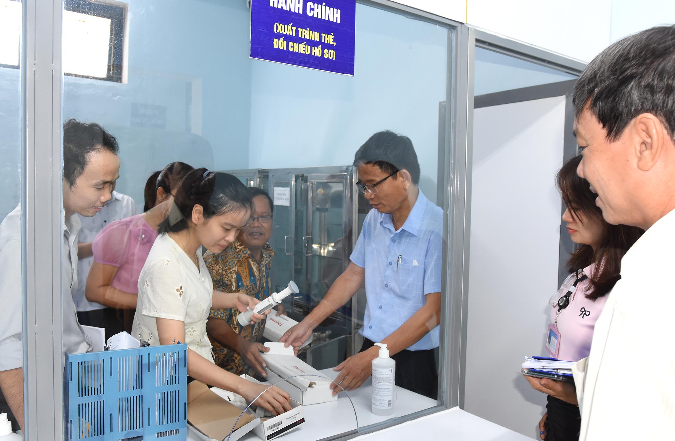Đoàn thẩm định các điều kiện về cơ sở vật chất, trang bị, dụng cụ tại điểm cấp phát thuốc.