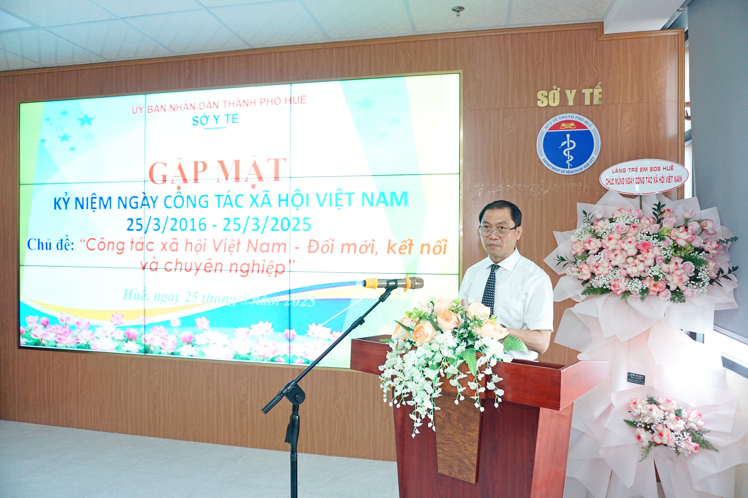 Phát biểu tại buổi gặp mặt, PGS.TS Trần Kiêm Hảo, Giám đốc Sở y tế đã gửi lời chúc mừng và cảm ơn các lãnh đạo các hội, các tổ chức, các hiệp hội, các phòng chuyên môn thuộc Sở, các cơ sở bảo trợ xã hội và đặc biệt những tấm gương sáng thầm lặng vì hoạt động công tác xã hội và hoạt động vì cộng đồng. Giám đốc Sở Y tế mong muốn thời gian tới, những người làm công tác xã hội trong lĩnh vực chăm sóc, nuôi dưỡng đối tượng tại các cơ sở trợ giúp xã hội, trợ giúp đối tượng yếu thế tại cộng đồng tiếp tục phát huy những kết quả đạt được, phát huy năng lực, sở trường của mình, đổi mới, nâng cao chất lượng phục vụ và khám chữa bệnh.