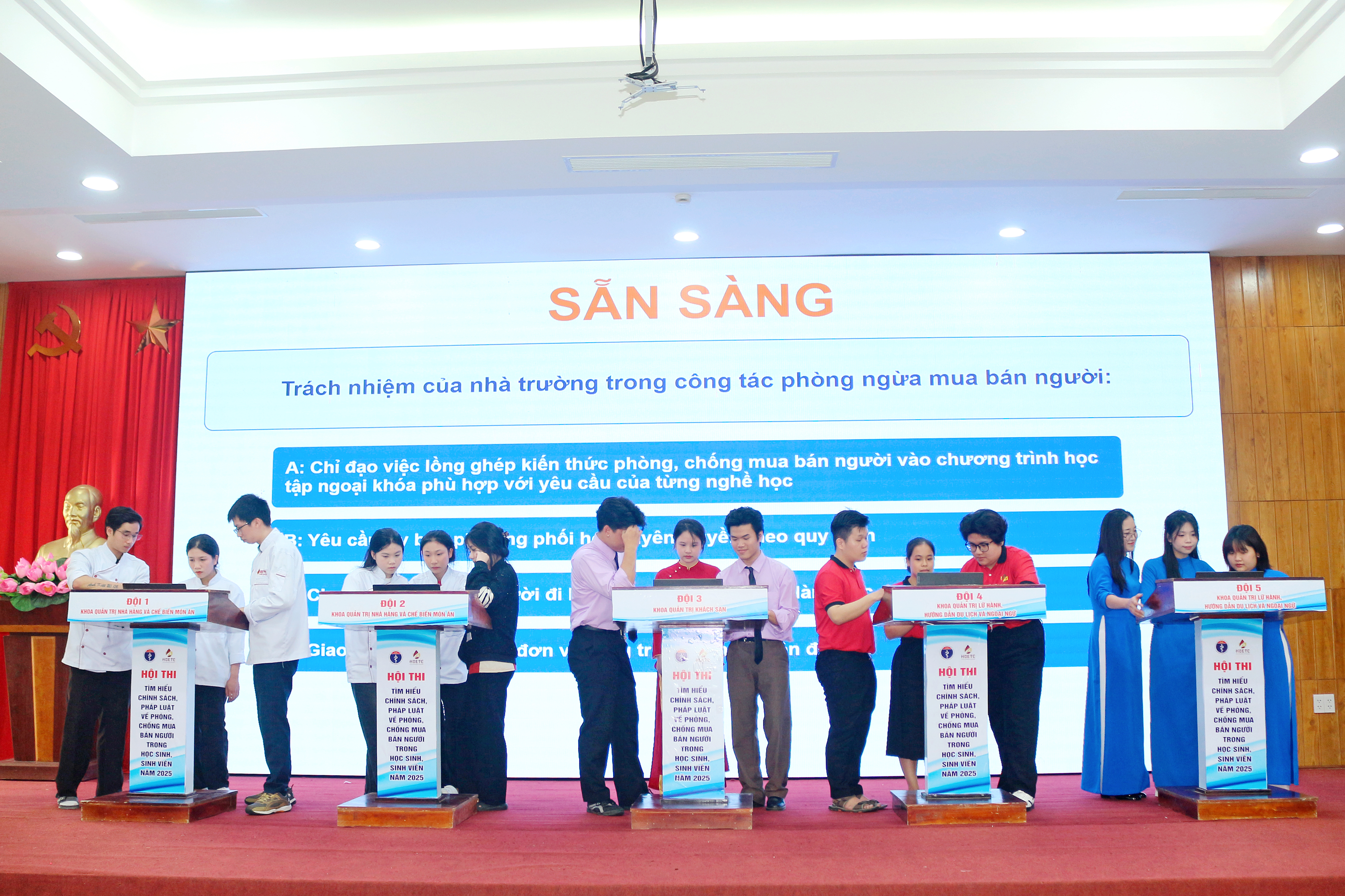 Hội thi năm nay thu hút 5 đội thi đến từ Trường Cao đẳng Du lịch Huế tham gia. Với hình thức sân khấu hóa sinh động, các đội đã thể hiện sự hiểu biết, sáng tạo trong việc truyền tải các quy định pháp luật, nhận diện thủ đoạn của tội phạm mua bán người thông qua những tình huống thực tiễn gần gũi với đời sống học đường, qua đó tạo sức lan tỏa mạnh mẽ đến người xem.