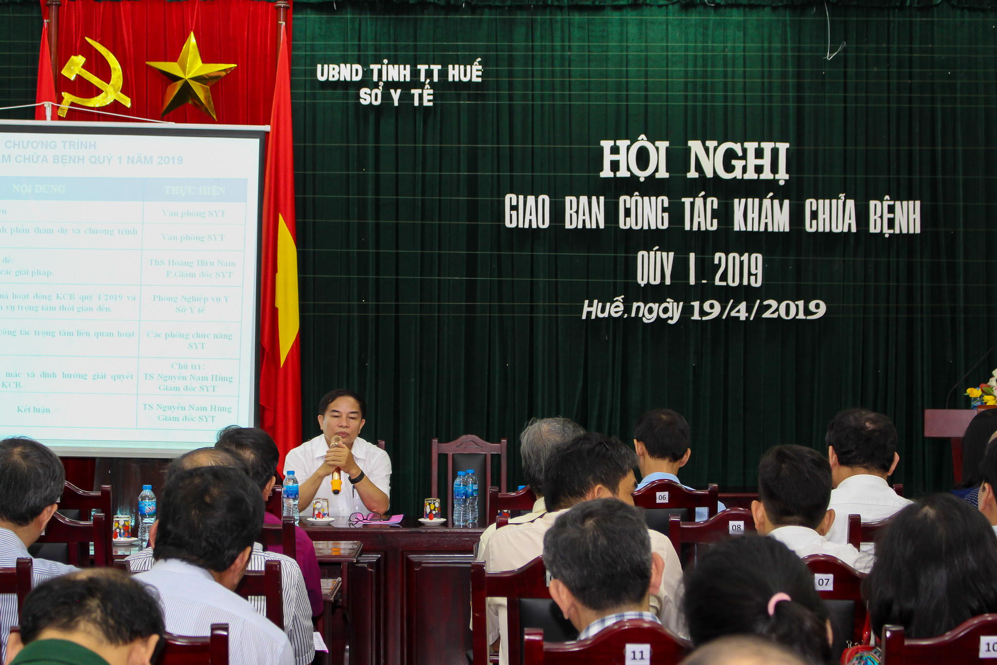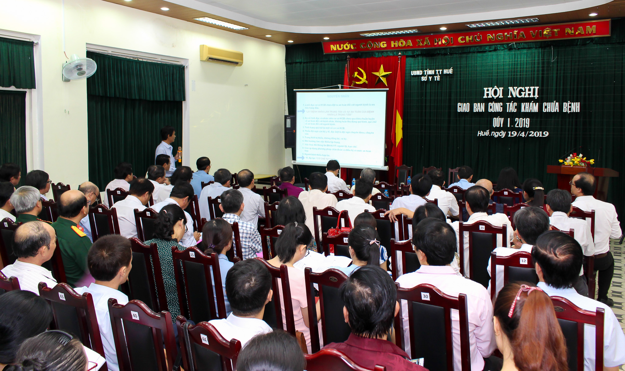 Ngày 19/4/2019 Sở Y tế tỉnh Thừa Thiên Huế đã tổ chức Hội nghị giao ban công tác khám chữa bệnh quí I/2019 và triển khai kế hoạch hoạt động trọng tâm thời gian đến. Tham dự và chỉ đạo hội nghị có TS.BS Nguyễn Nam Hùng- Giám đốc Sở Y tế, Ban lãnh đạo Sở Y tế, đại diện lãnh đạo Bảo hiểm xã hội tỉnh, đại diện lãnh đạo Bệnh viện Trung ương Huế, Bệnh viện Trường Đại học Y Dược Huế và lãnh đạo các bệnh viện, Trung tâm y tế huyện/thị xã/thành phố trực thuộc Sở.