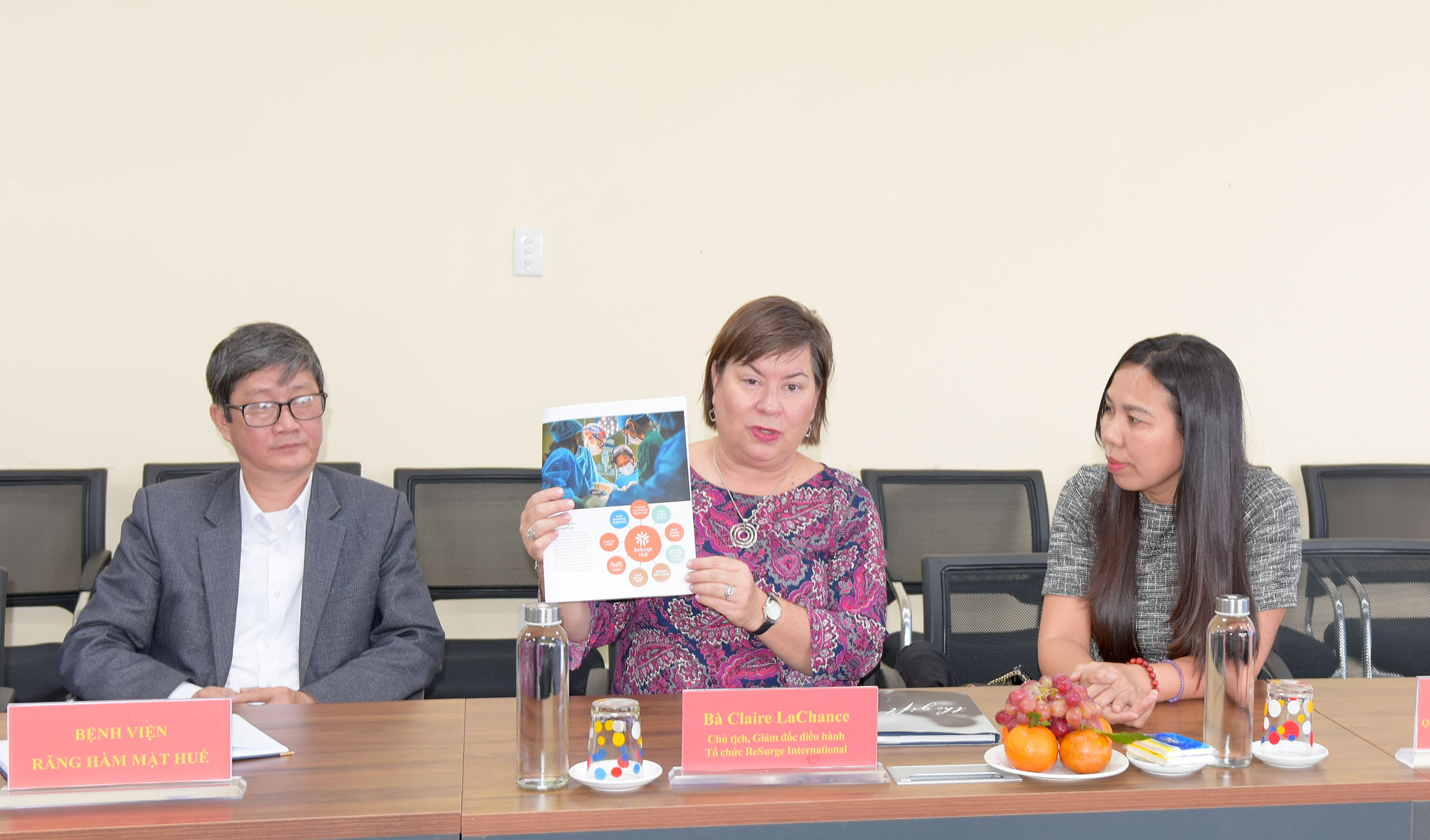 Tại buổi làm việc bà Claire Lachance - Chủ tịch, Giám đốc điều hành Tổ chức ReSurge International Hoa Kỳ, đánh giá cao sự phối hợp chặt chẽ, hỗ trợ nhiệt tình, đạt hiệu quả cao của Sở Y tế và BV Răng Hàm Mặt Huế. Tổ chức ReSurge International Hoa Kỳ luôn coi BV Răng Hàm Mặt Huế là đối tác chiến lược quan trọng. Trong thời gian tới tổ chức ReSurge International sẽ tiếp tục duy trì, phát triển và đa dạng hóa các loại phẫu thuật tạo hình, phẫu thuật thẩm mỹ vùng hàm mặt, dị tật bẩm sinh, phát triển nha khoa mũi nhọn cho y tế thành phố Huế… Tuân thủ các văn bản đã ký kết hợp tác và cam kết sẽ làm những gì tốt nhất trong sự tin tưởng của địa phương…