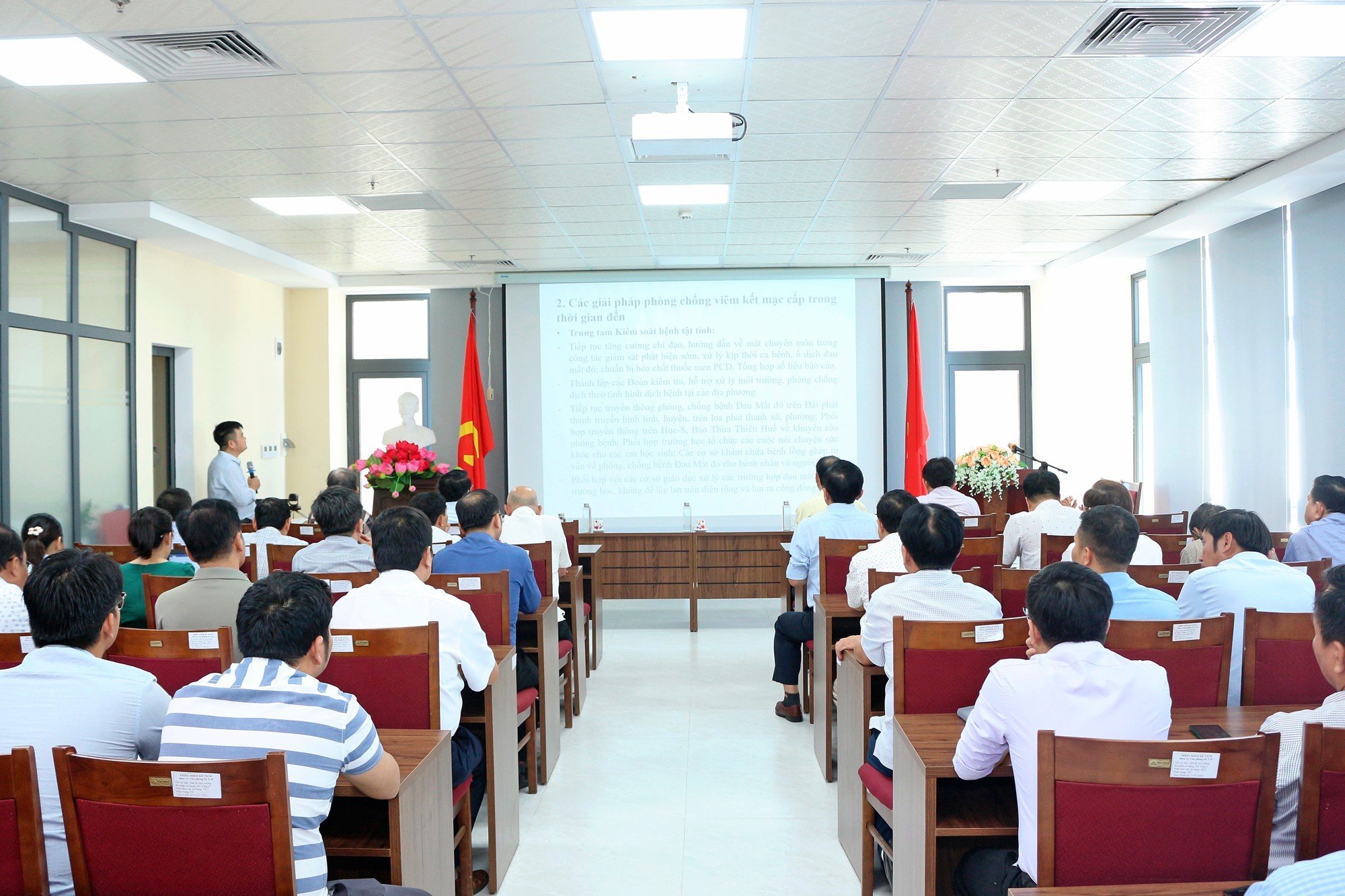 Chiều ngày 19/9/2023, tại Hội trường Sở Y tế tỉnh Thừa Thiên Huế đã tổ chức Hội nghị triển khai các hoạt động kiểm soát, phòng, chống và thu dung điều trị bệnh Đau Mắt đỏ. Tham dự chỉ đạo hội nghị có PGS.TS Trần Kiêm Hảo - Giám đốc Sở Y tế; có ThS.BSCKII. Hoàng Trọng Quý - Phó Giám đốc Sở Y tế; đại diện lãnh đạo các phòng chuyên môn của Sở Y tế; Trung tâm Kiểm soát Bệnh tật tỉnh và các đơn vị khám chữa bệnh trên địa bàn tỉnh.