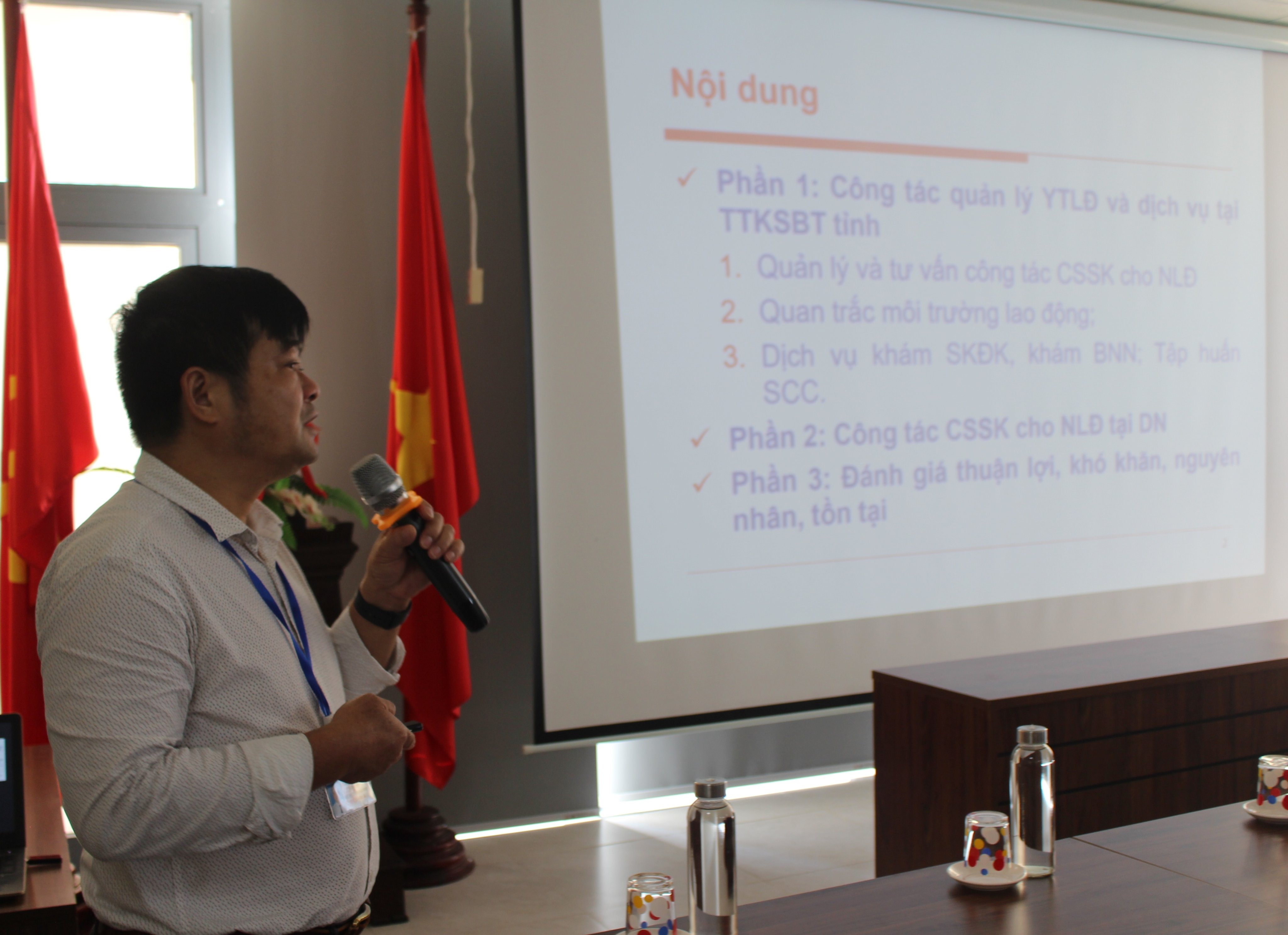 ThS.BS. Trần Bá Thanh - Trưởng Khoa SKMT-YTTH-BNN trình bày báo cáo công tác chăm sóc sức khỏe người lao động tại các doanh nghiệp tỉnh Thừa Thiên Huế năm 2022.