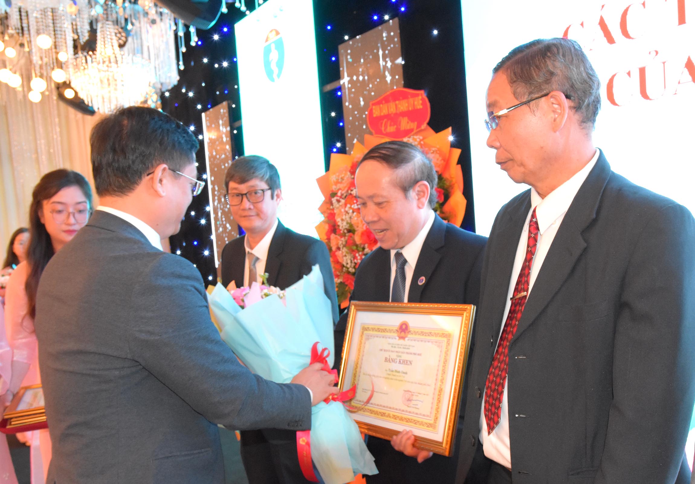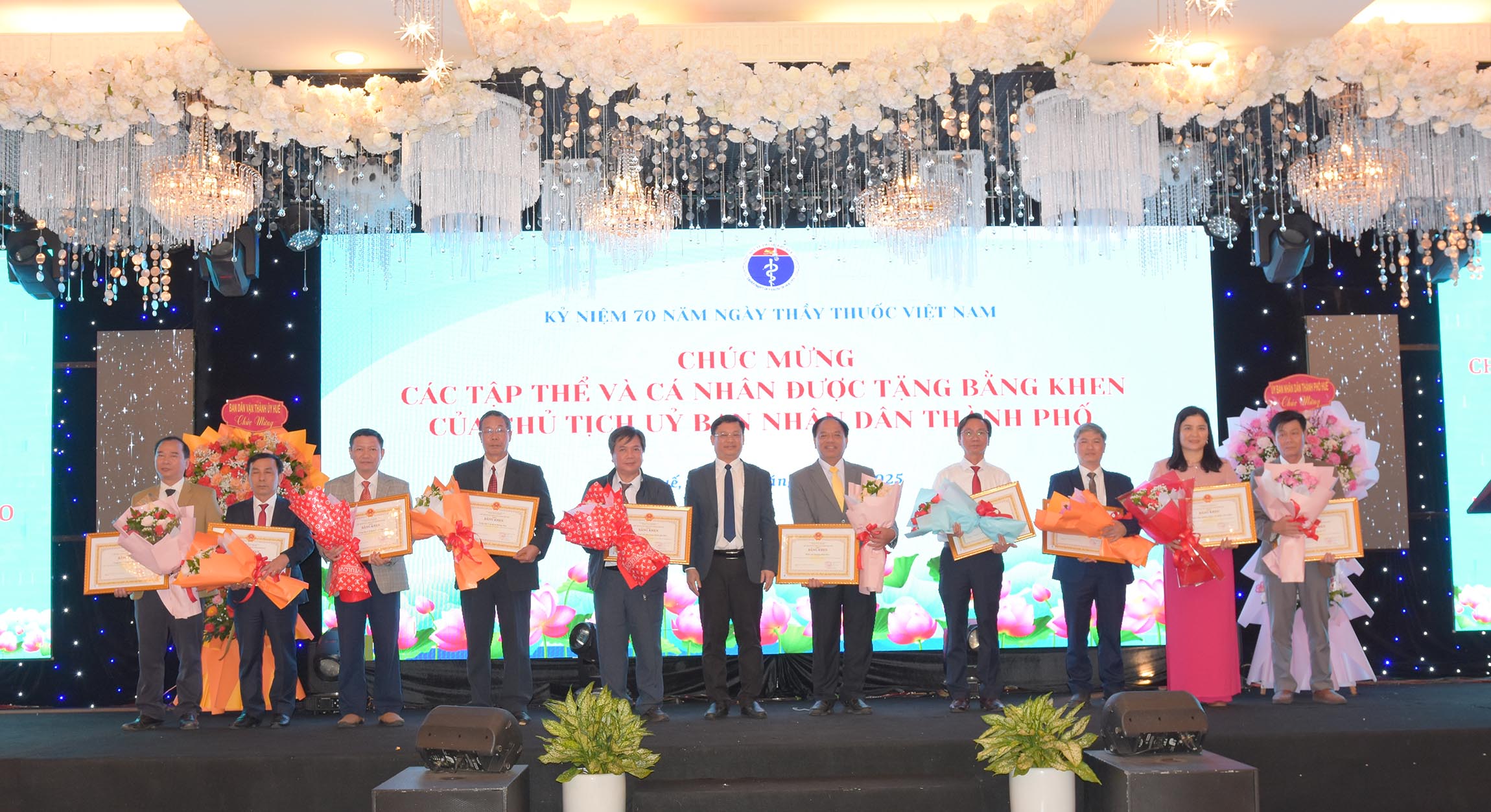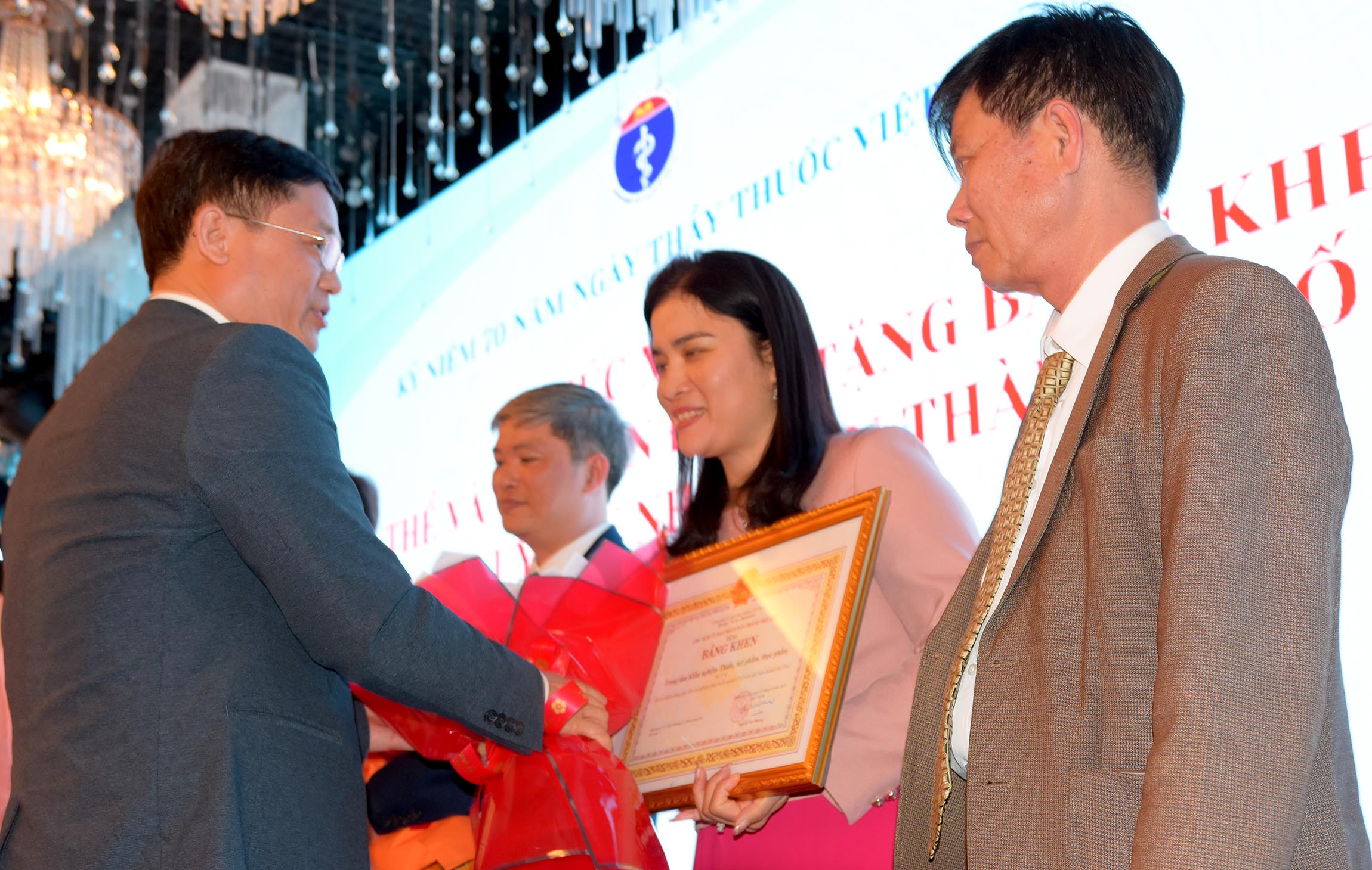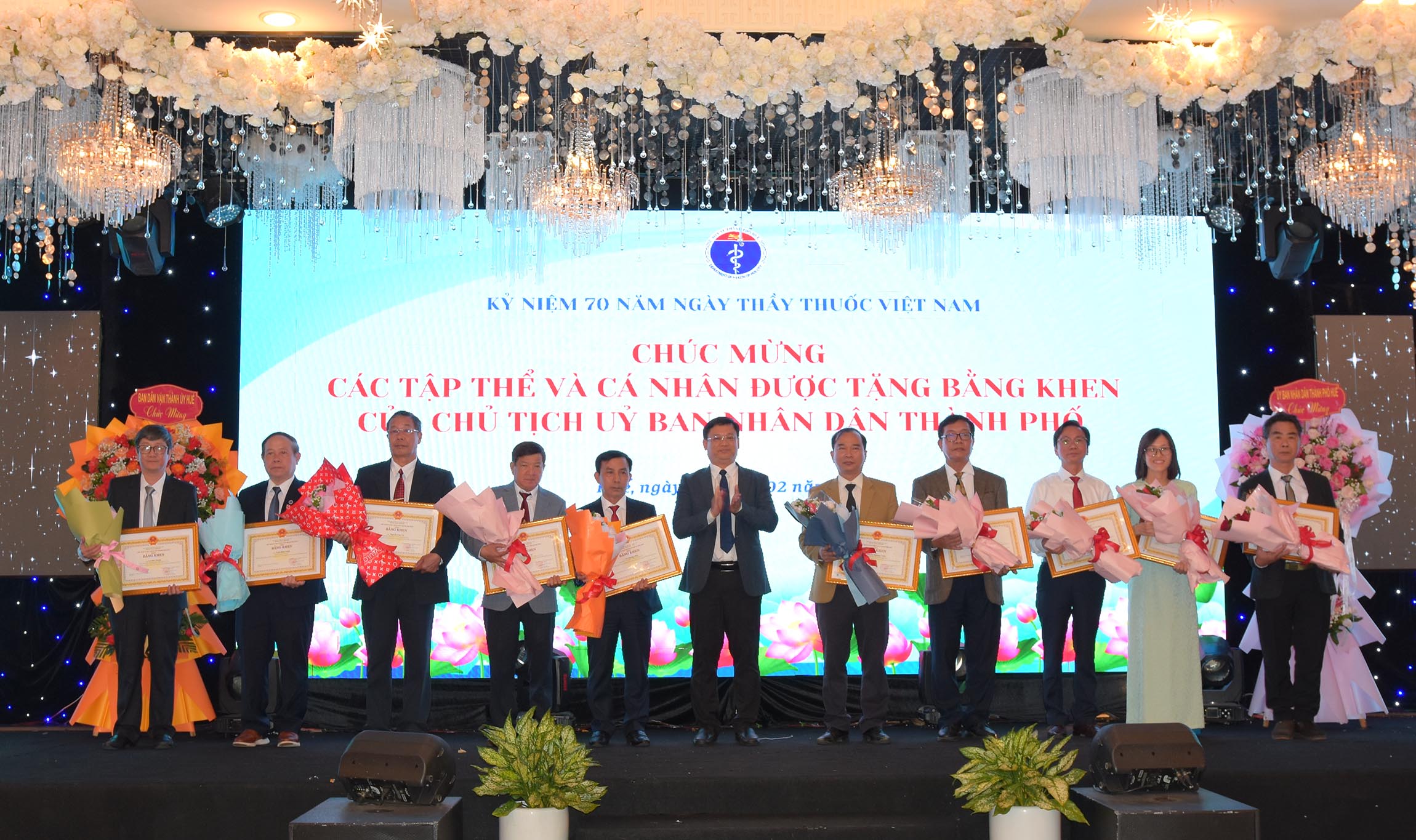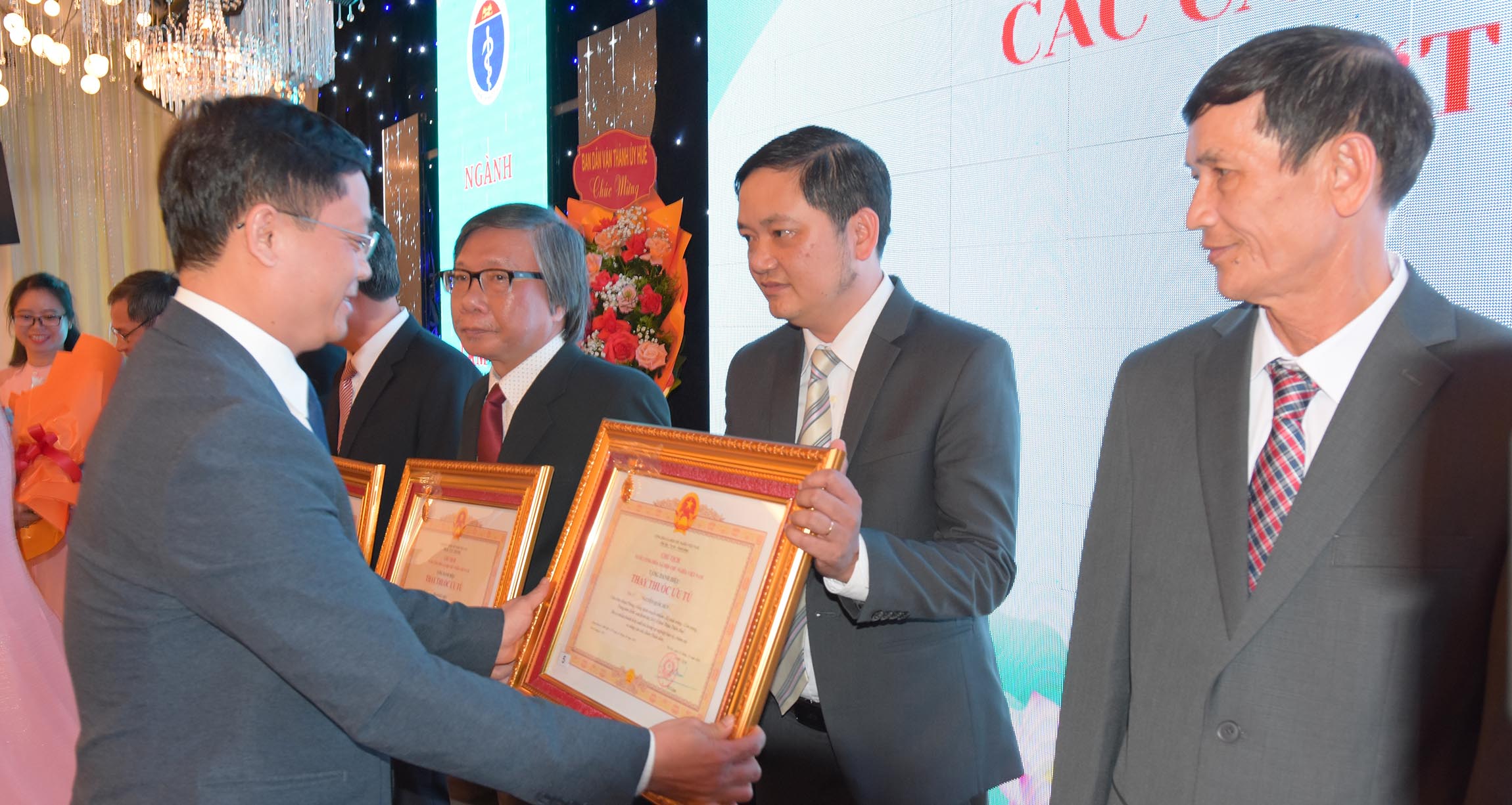Thừa ủy quyền của Chủ tịch Nước, Phó Chủ tịch UBND thành phố Huế - Nguyễn Thanh Bình trao tặng danh hiệu "Thầy Thuốc Ưu tú" cho 13 cá nhân được vinh danh. Giám đốc Sở Y tế Trần Kiêm Hảo tặng hoa chúc mừng.
