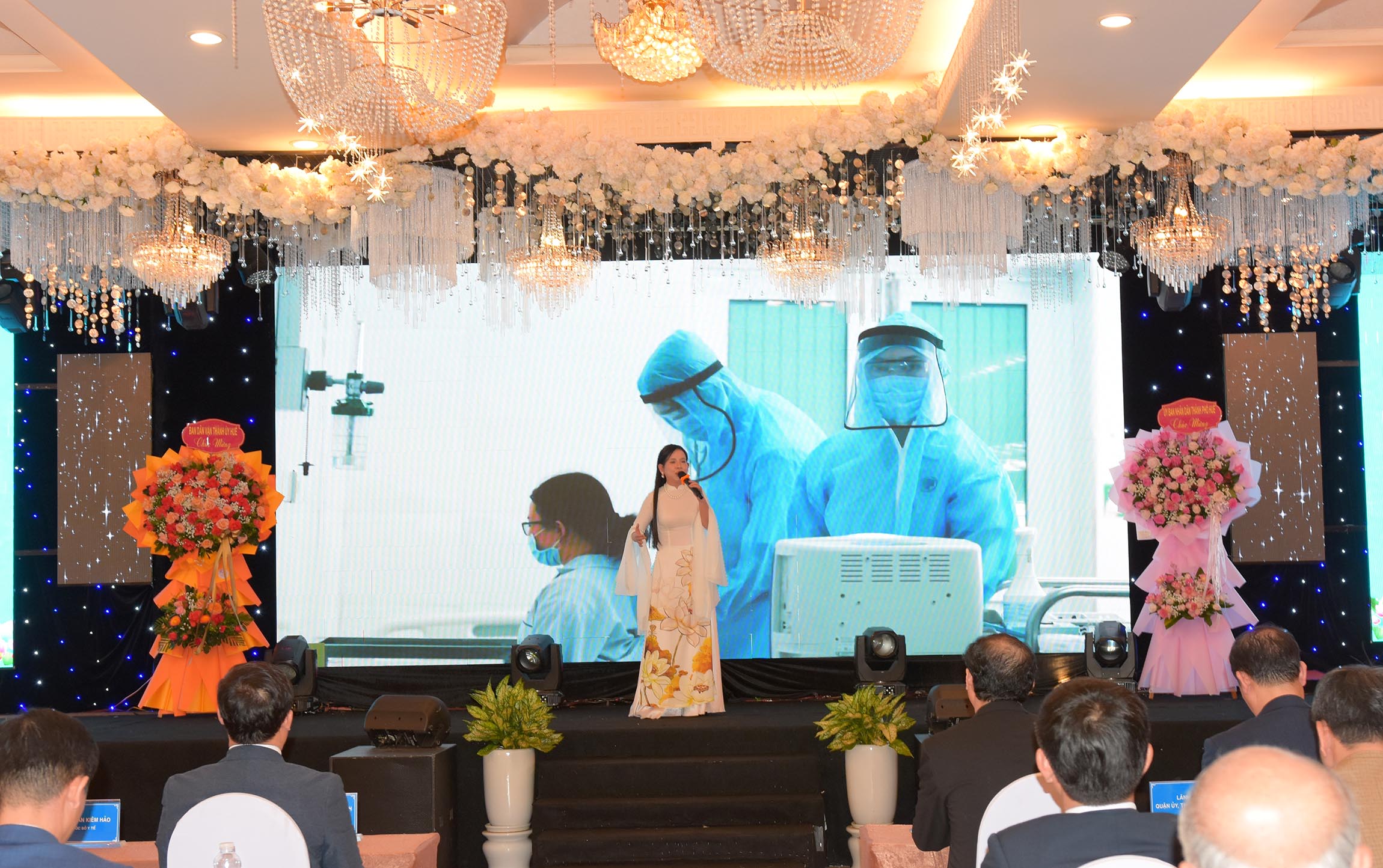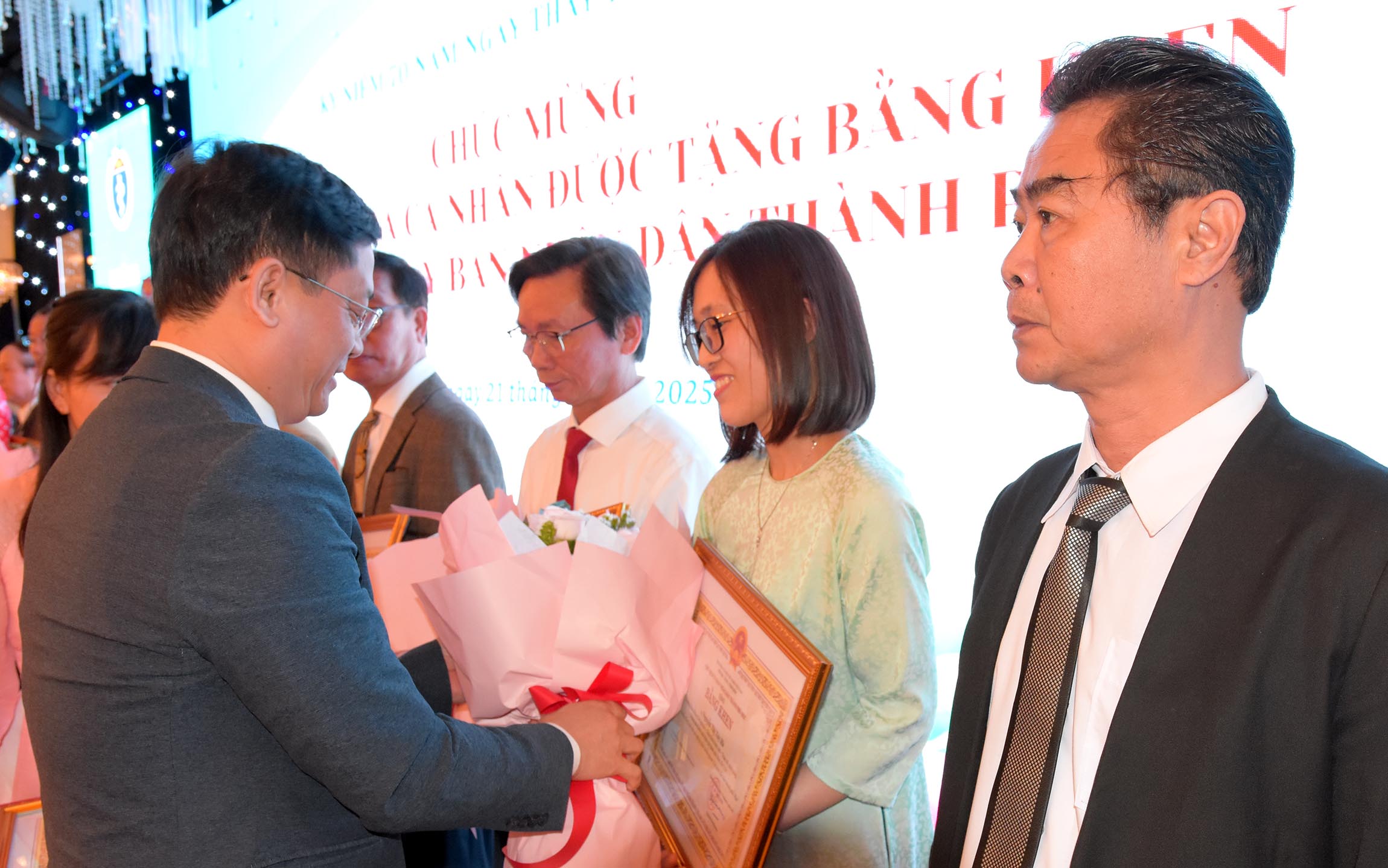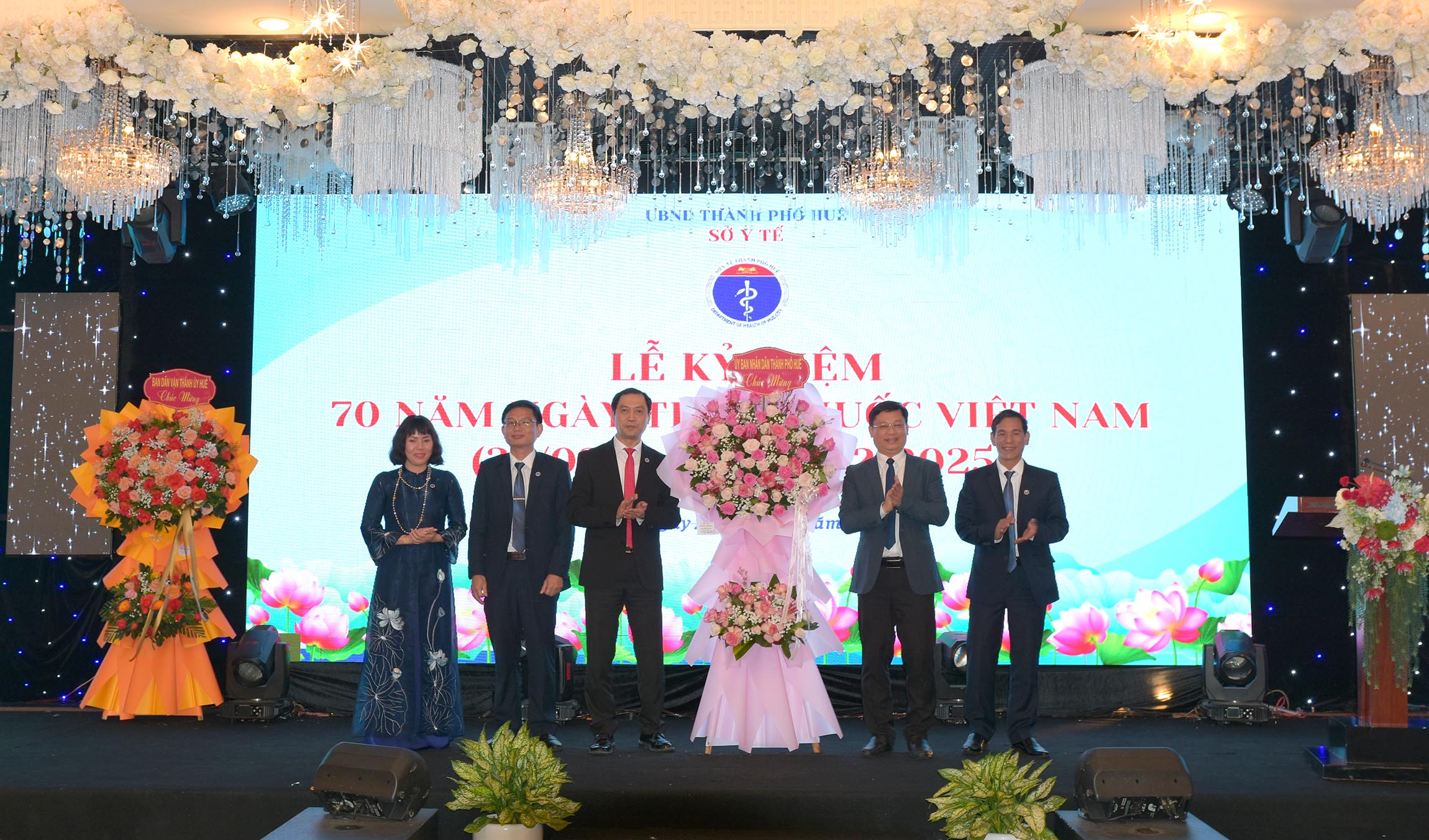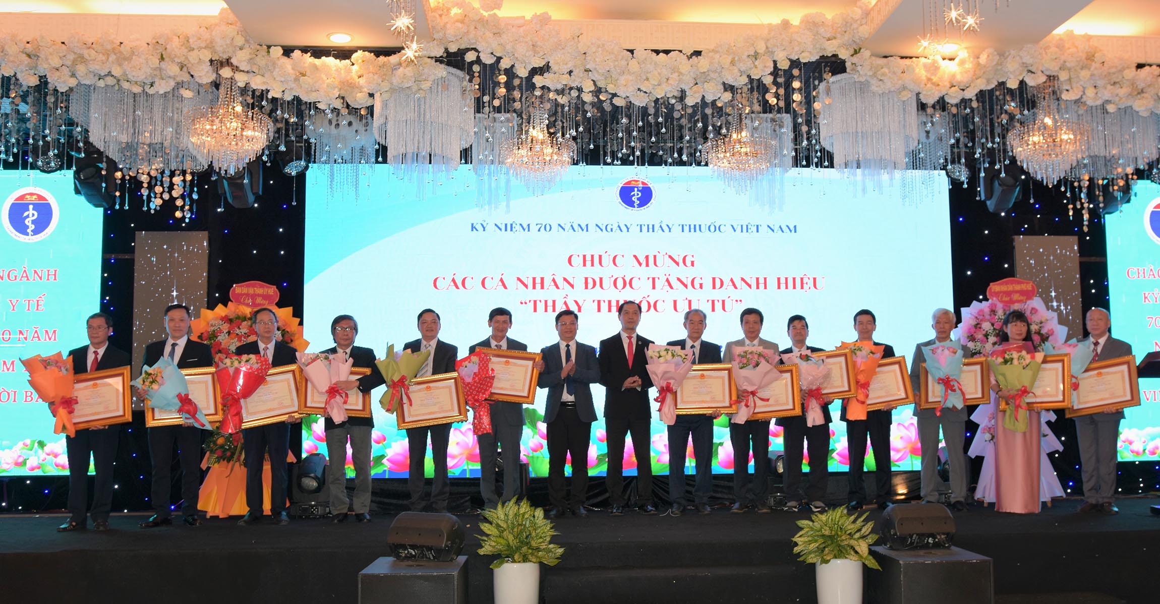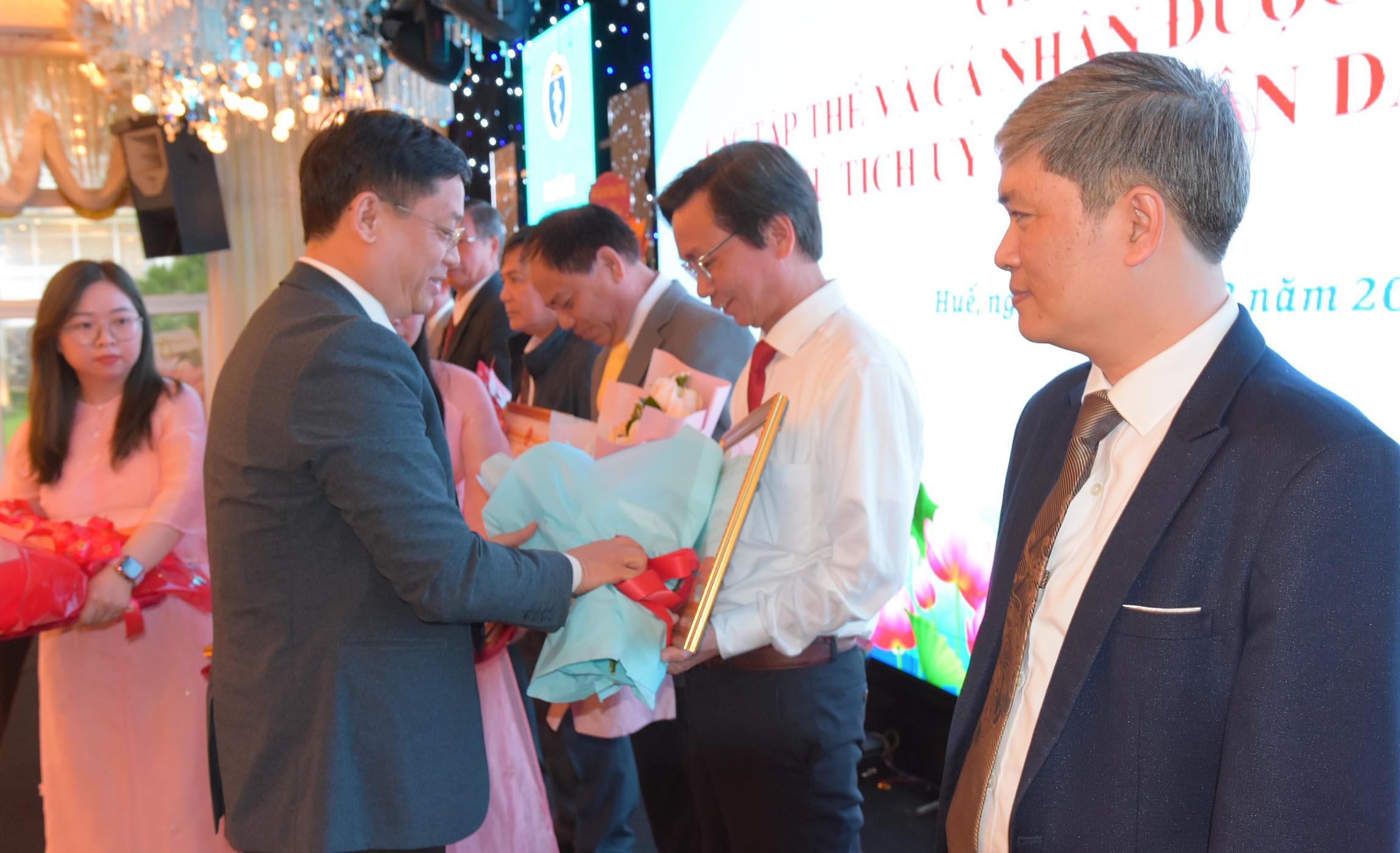 Thừa ủy quyền của Chủ tịch Nước, Phó Chủ tịch UBND thành phố Huế - Nguyễn Thanh Bình trao tặng danh hiệu "Thầy Thuốc Ưu tú" cho 13 cá nhân được vinh danh. Giám đốc Sở Y tế Trần Kiêm Hảo tặng hoa chúc mừng.