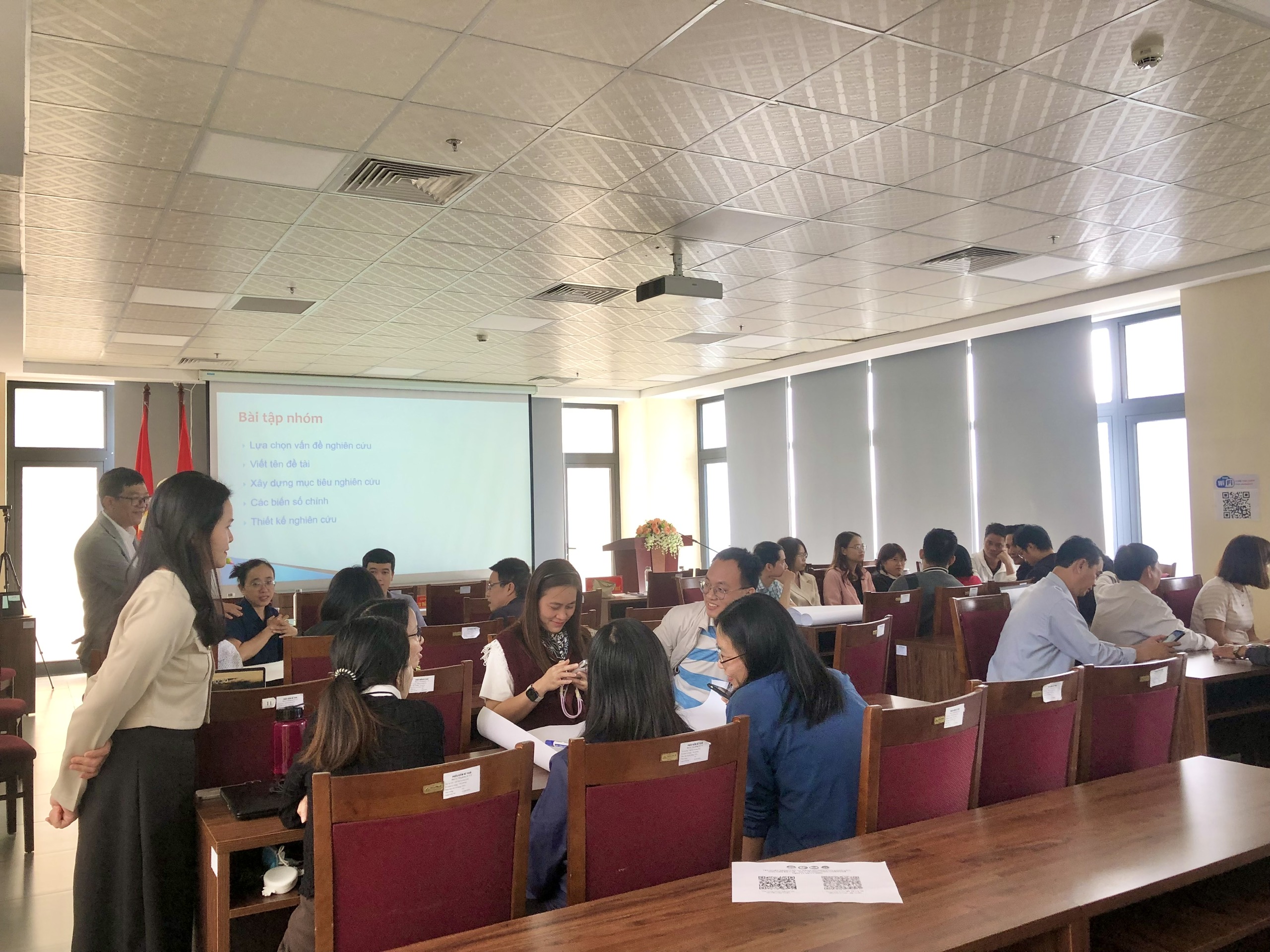 Trong ngày đầu tiên, lớp tập huấn đã được lắng nghe các nội dung về quy trình tiến hành một nghiên cứu khoa học sức khỏe và tổng quan về một số thiết kế nghiên cứu thường gặp trong NCKH sức khỏe, xây dựng khung lý thuyết nghiên cứu và tiến hành thực hành theo nhóm.
