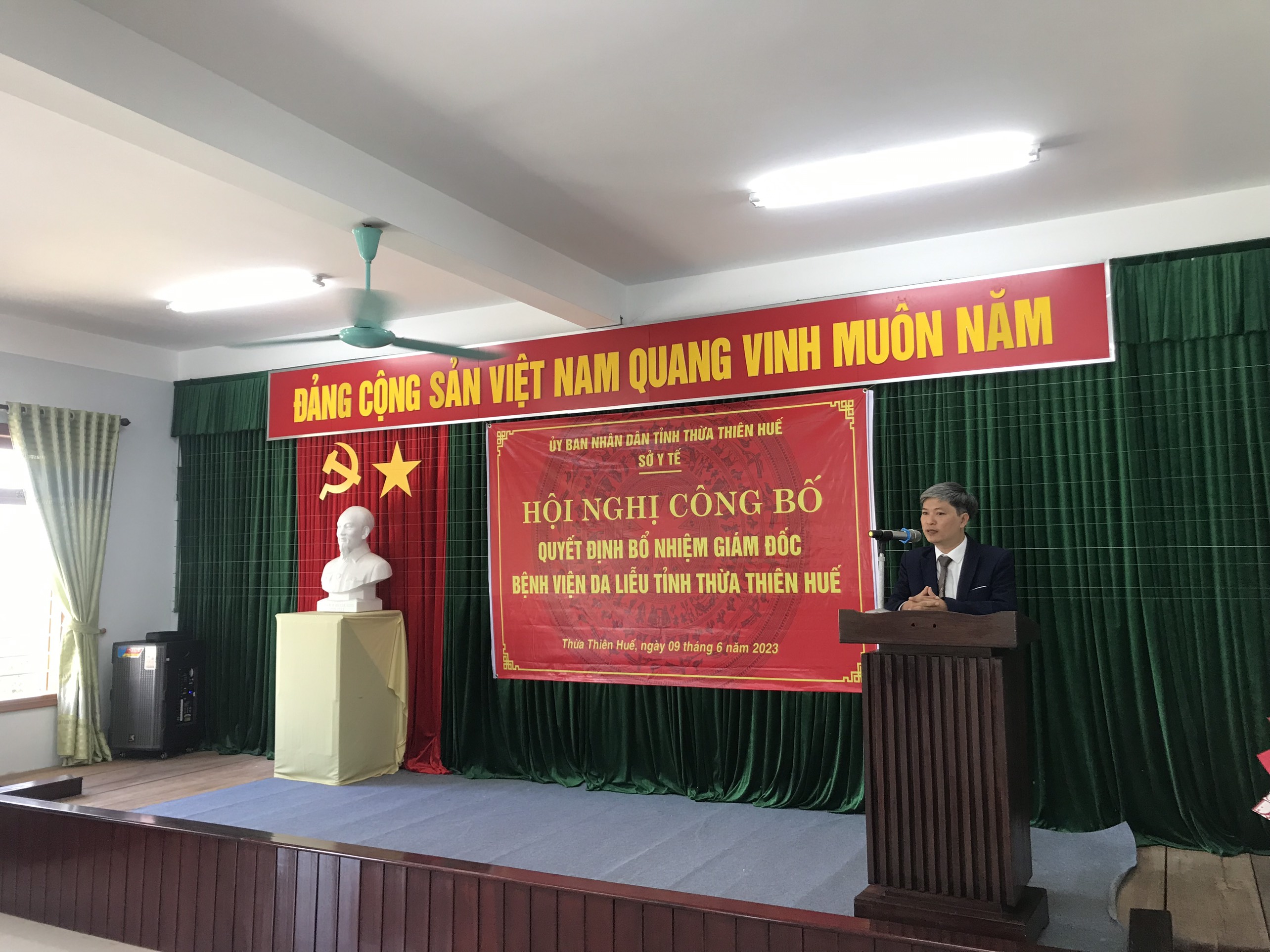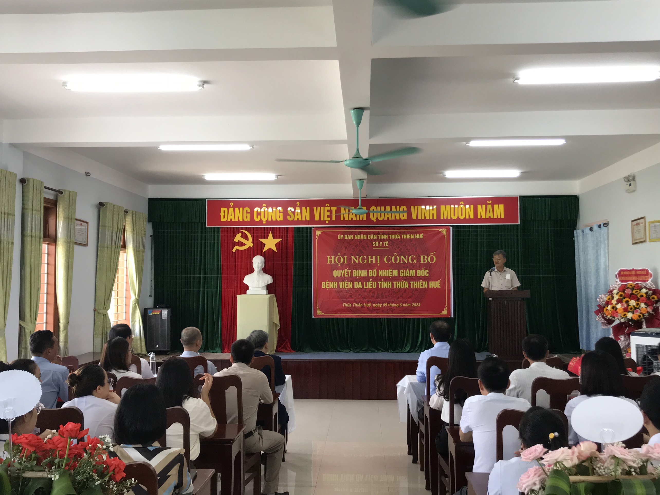 Sáng ngày 09 tháng 6 năm 2023, tại Hội trường Bệnh viện Da liễu, Sở Y tế tỉnh Thừa Thiên Huế đã tổ chức Hội nghị công bố Quyết định bổ nhiệm Giám đốc Bệnh viện Da liễu. Đến tham dự có PGS. TS. BS Trần Kiêm Hảo - Giám đốc Sở Y tế, lãnh đạo phòng Tổ chức cán bộ thuộc Sở; Về phía Bệnh viện có các thành viên trong Ban Giám đốc và đại diện Lãnh đạo các khoa, phòng toàn thể cán bộ, viên chức của Bệnh viện.