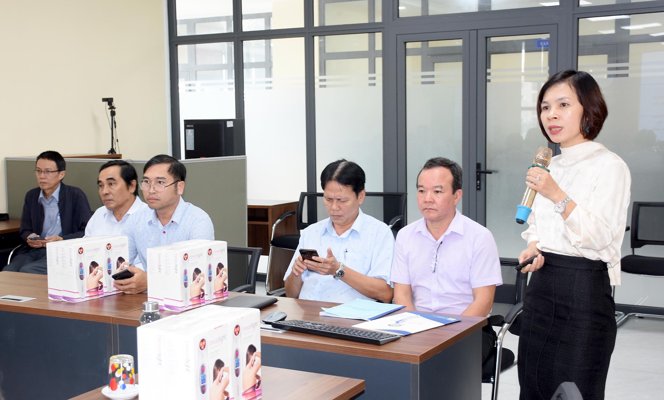 Ban giám đốc Sở Y tế trao tặng thiết bị Breastlight tầm soát K vú cho các đơn vị.