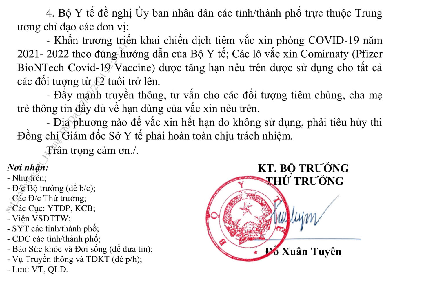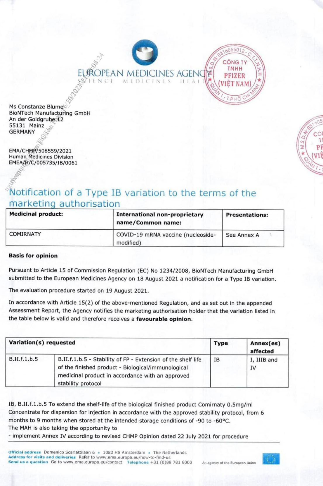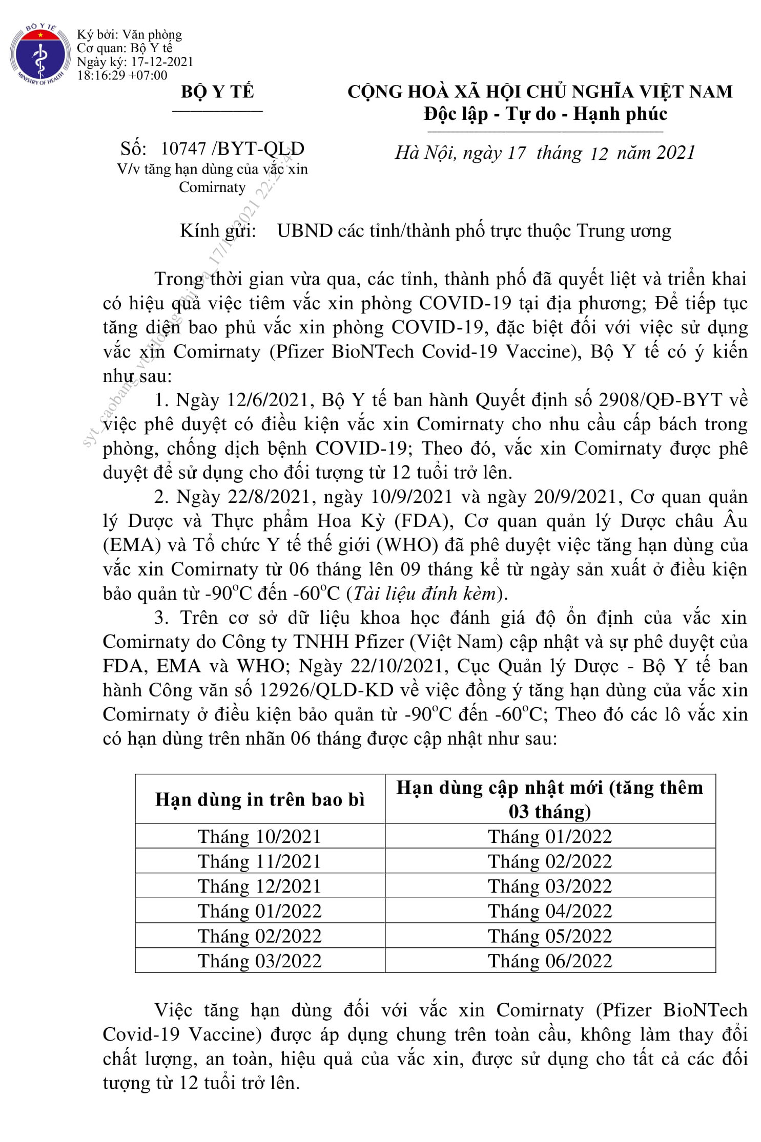 Công văn số 10747/BYT-QLD của Bộ Y tế ngày 17/12/2021 về việc tăng hạn dùng của vắc xin Comirnaty