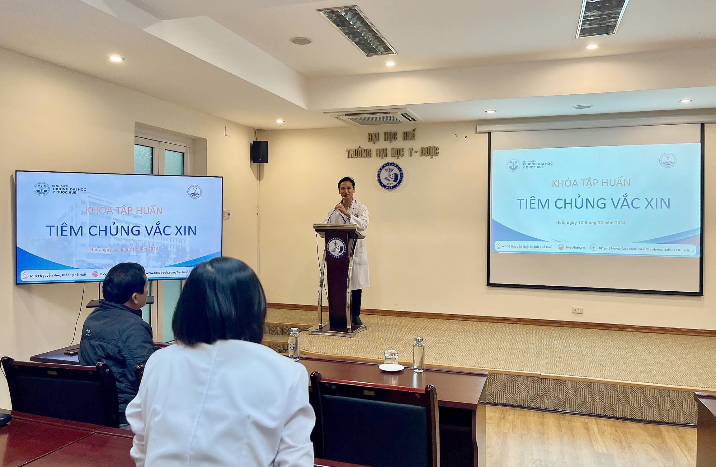 Ngày 12/12/2024, Trung tâm KSBT tỉnh (CCD) phối hợp với BV trường Đại học Y Dược Huế (ĐHYD) tổ chức khóa tập huấn chuyên môn về An toàn tiêm chủng (ATTC) và phổ biến các loại vắc xin đang sử dụng, cập nhật kiến thức, kỹ năng và những văn bản, các thông tin liên quan về công tác ATTC, tham dự khóa tập huấn có hơn 60 CBYT của BV trường ĐHYD Huế.