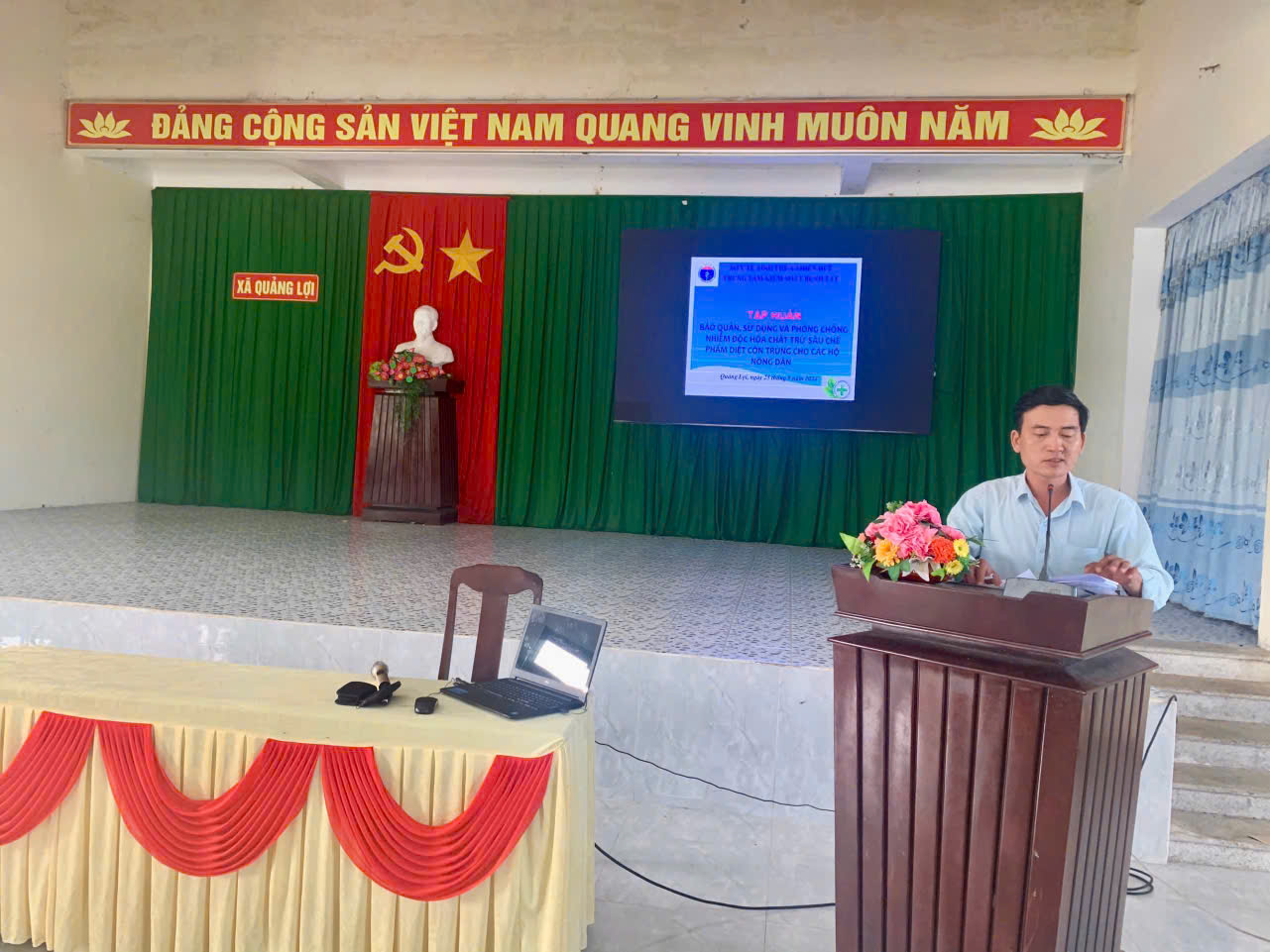 Ngày 25 /9 /2024, tại hội trường UBND xã Quảng Lợi huyện Quảng Điền, Trung tâm Kiểm soát Bệnh tật tỉnh phối hợp Uỷ Ban Nhân dân và Trạm Y tế xã Quảng Lợi tổ chức tập huấn bảo quản, sử dụng và phòng chống nhiễm độc hóa chất trừ sâu - chế phẩm diệt côn trùng cho các hộ nông dân trên địa bàn.