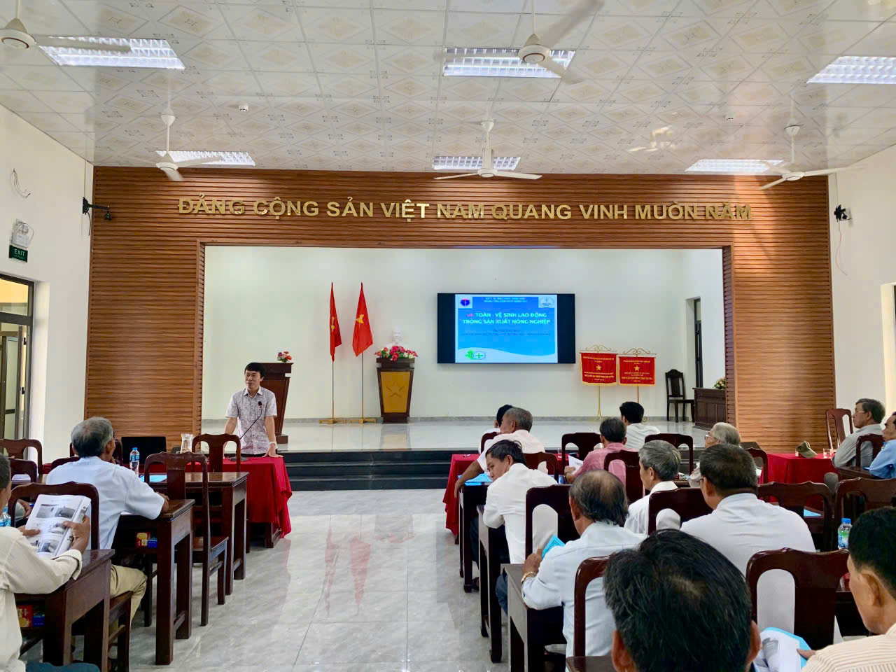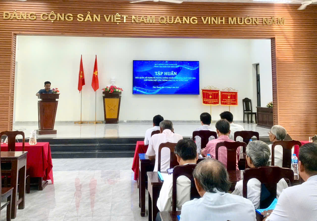 Thực hiện chương trình chăm sóc sức khỏe người lao động năm 2024, ngày 13/9/2024 tại Hội trường UBND xã Thủy Thanh, Trung tâm Kiểm soát bệnh tật tỉnh phối hợp với Trung tâm Y tế thị xã Hương Thủy, Uỷ ban nhân dân và Trạm Y tế xã Thủy Thanh tổ chức tập huấn bảo quản, sử dụng và phòng chống nhiễm độc hóa chất trừ sâu - chế phẩm diệt côn trùng cho nông dân trên địa bàn.
