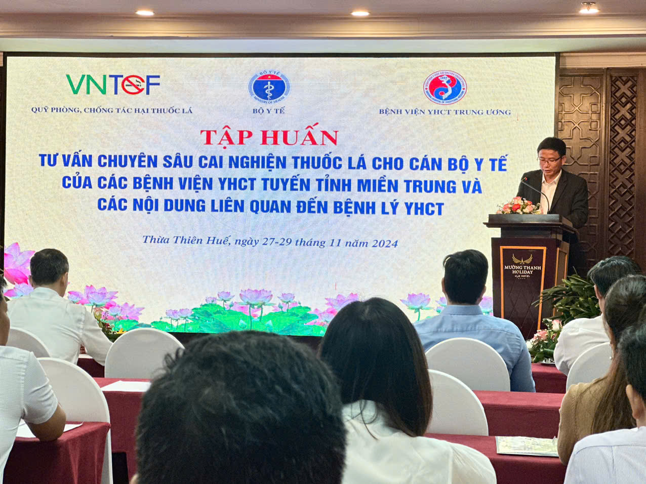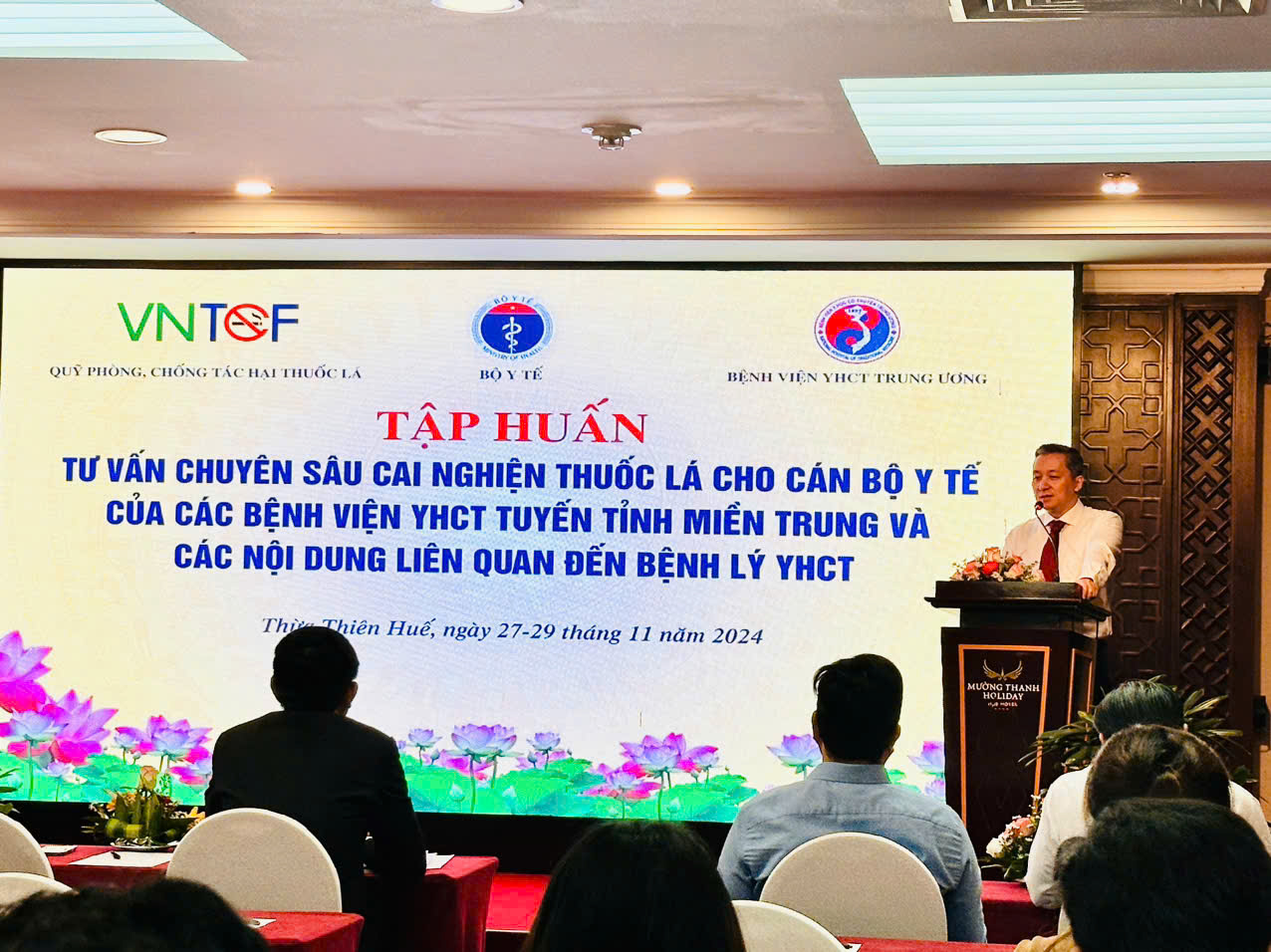 Ngày 27/11/2024, tại tỉnh Thừa Thiên Huế, Bệnh viện Y học cổ truyền Trung ương tổ chức tập huấn chuyên sâu về tư vấn cai nghiện thuốc lá cho cán bộ y tế Bệnh viện Y học cổ truyền các tỉnh miền Trung năm 2024. Đến tham dự tập huấn, có PGS.TS Dương Trọng Nghĩa - Phó Giám đốc Bệnh viện YHCT Trung ương; về phía Sở Y tế có ThS.BSCKII. Hoàng Trọng Quý - Phó Giám đốc Sở Y tế tỉnh Thừa Thiên Huế, Trung tâm Kiểm soát bệnh tật tỉnh, Bệnh viện Đa Khoa Bình Điền, Bệnh viện Giao thông Vận tải, Trung tâm Y tế các huyện, thị xã, thành phố Huế và đại diện Lãnh đạo, cán bộ Bệnh viện YHCT các tỉnh miền Trung cùng tham dự.