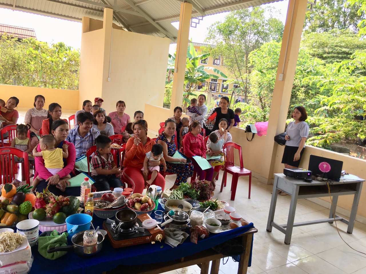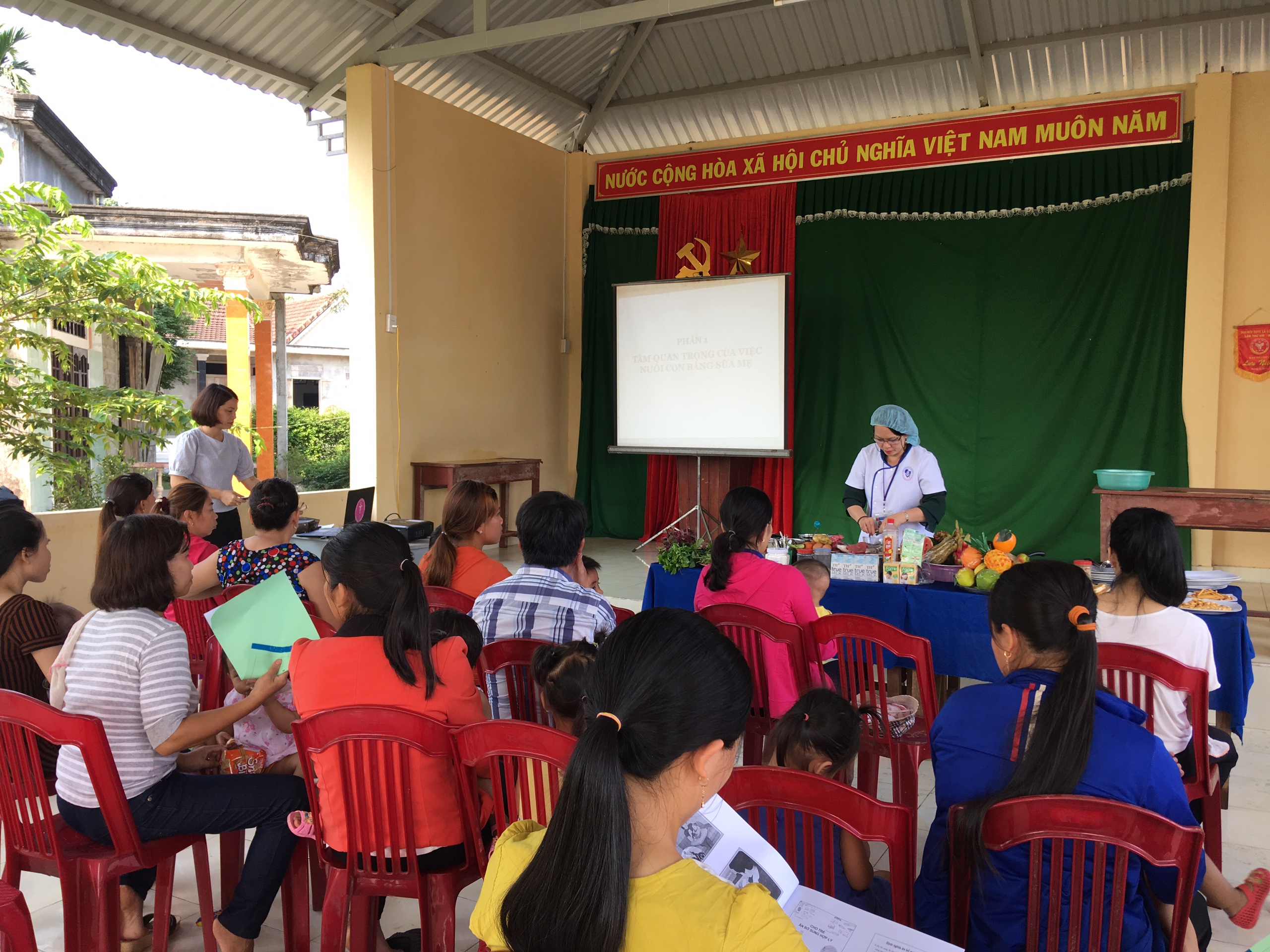 Cán bộ khoa Dinh dưỡng tập huấn cho các bà mẹ tại nhà văn hóa thôn